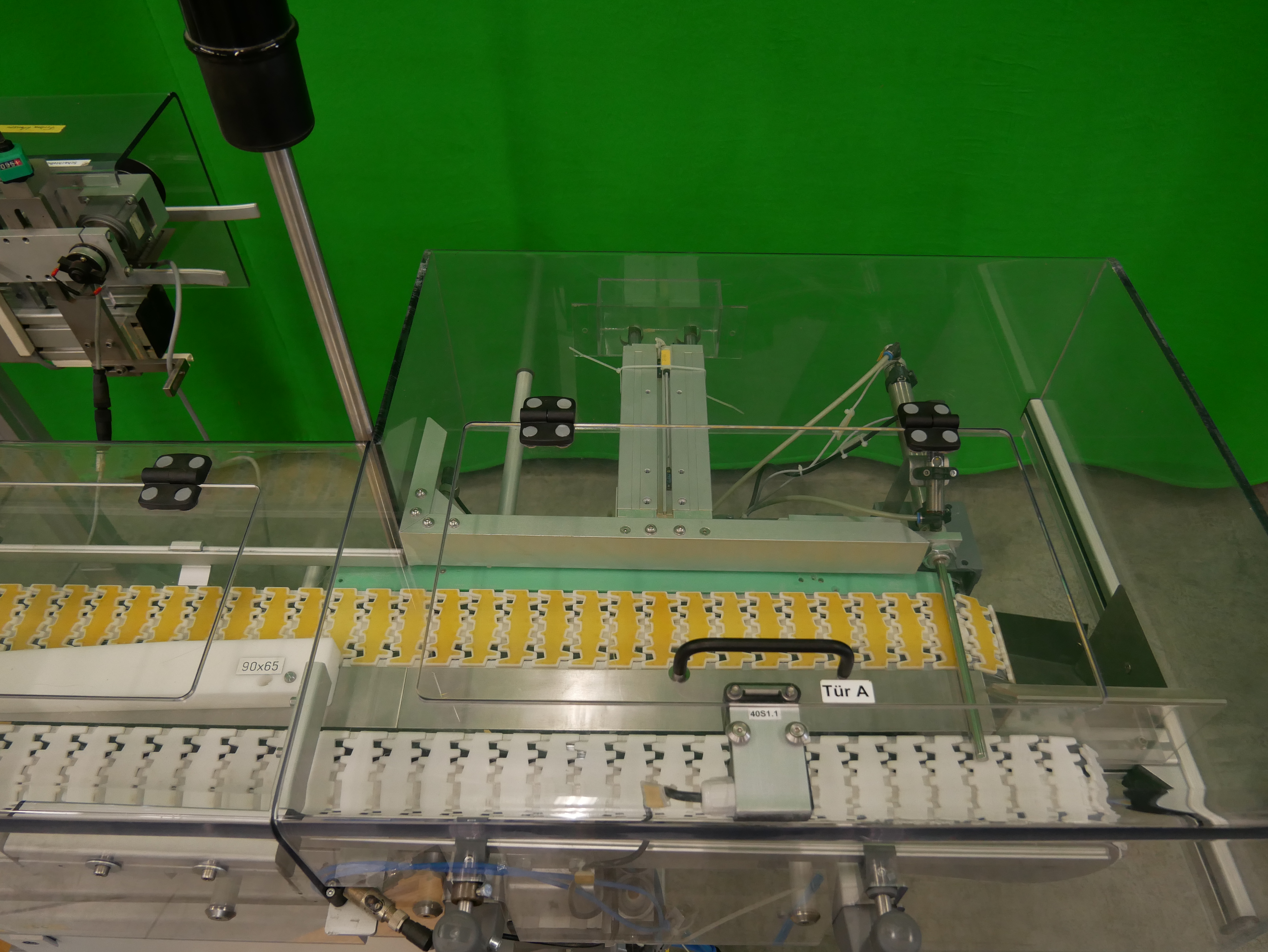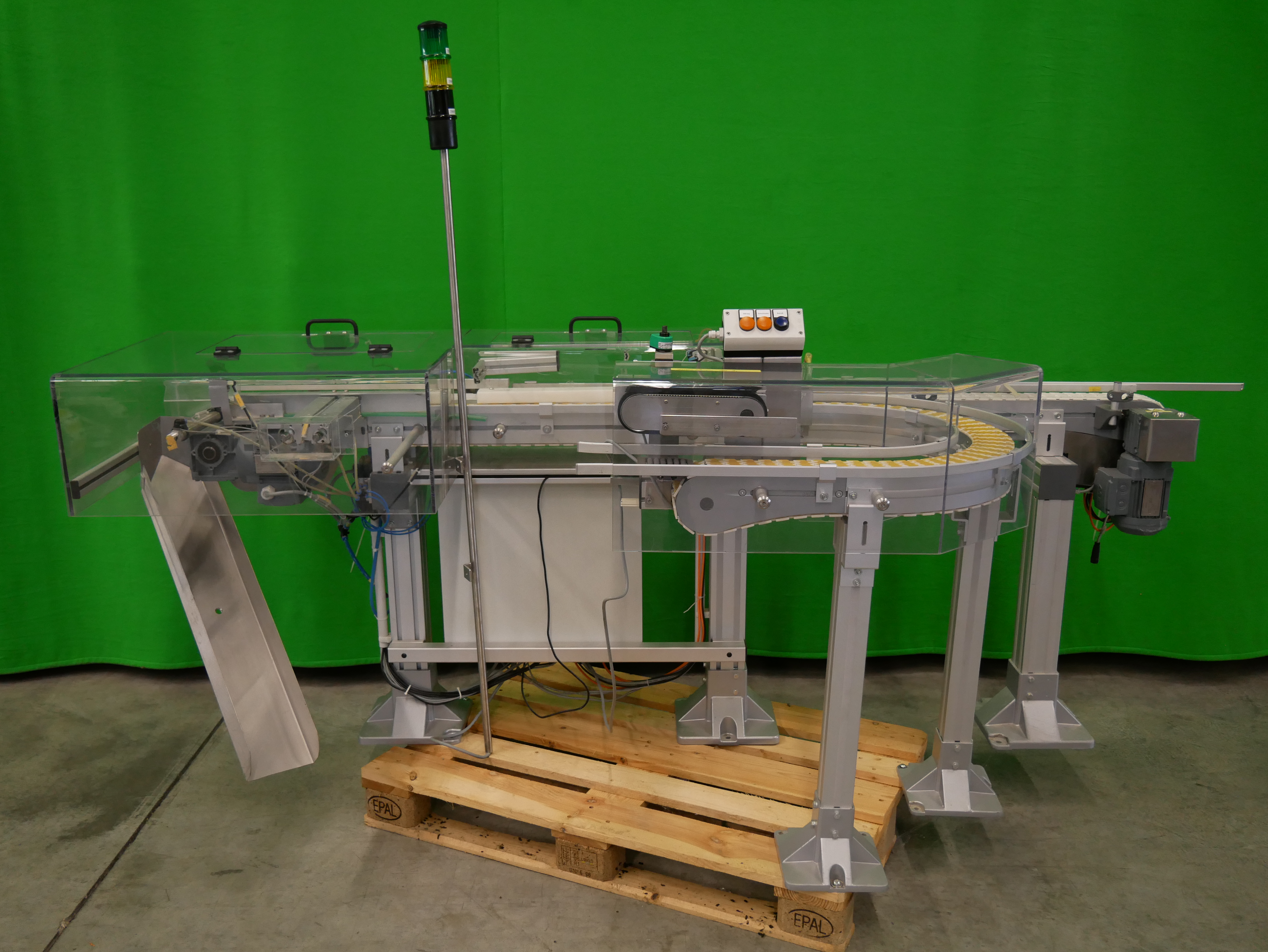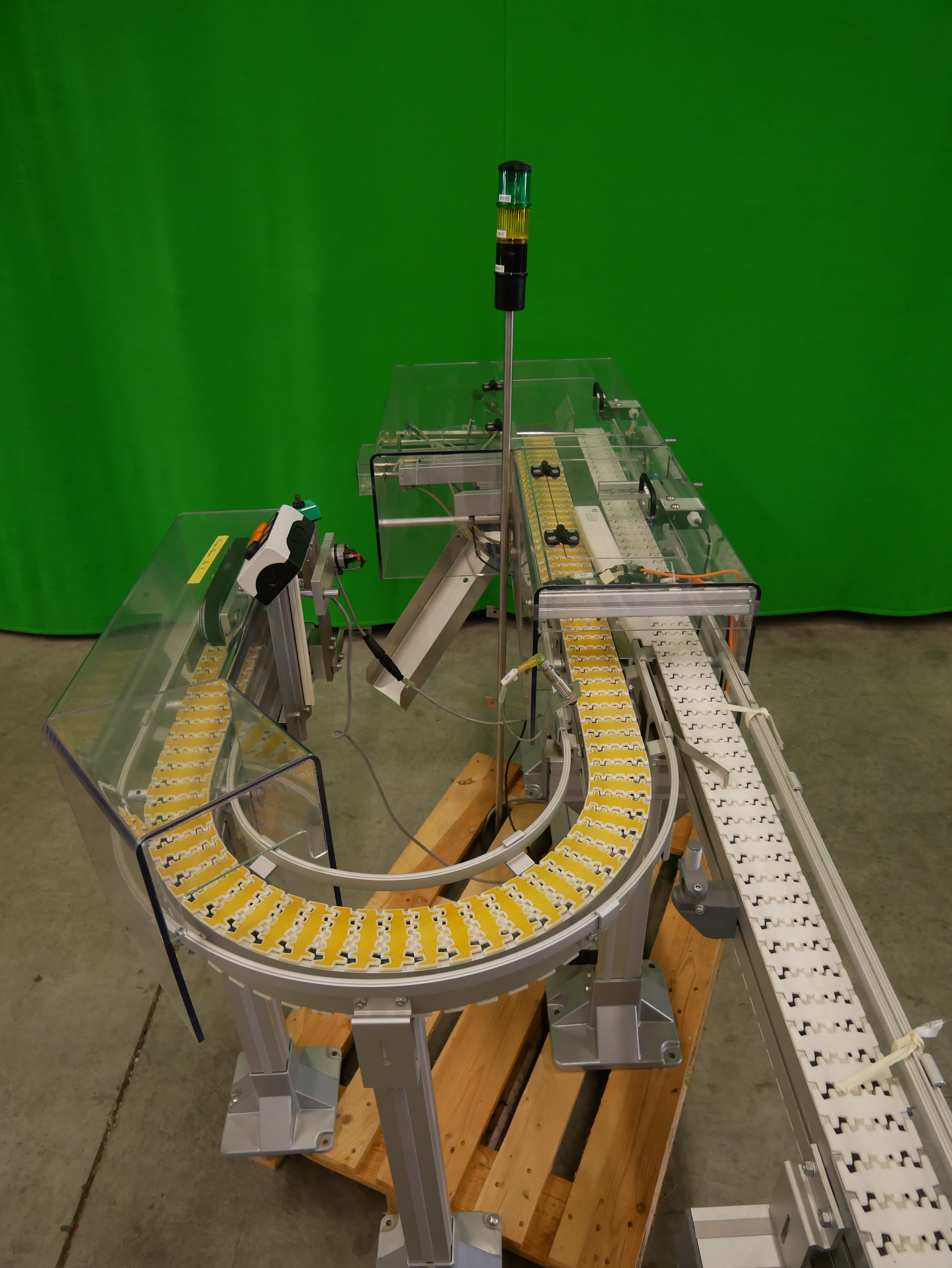 Remmler + Soehren Transportsystem zum Wenden von Faltschachteln um 180°, Kettenbandbreite ca. 85 mm, maximale Fördergutlänge 117 mm (Quertransport), Bandgeschwindigkeit 20-40 m/min., elektrischer Anschluss 400V/50Hz, Maschinengrundfläche ca. 2500 x 1000 mm (LxB)