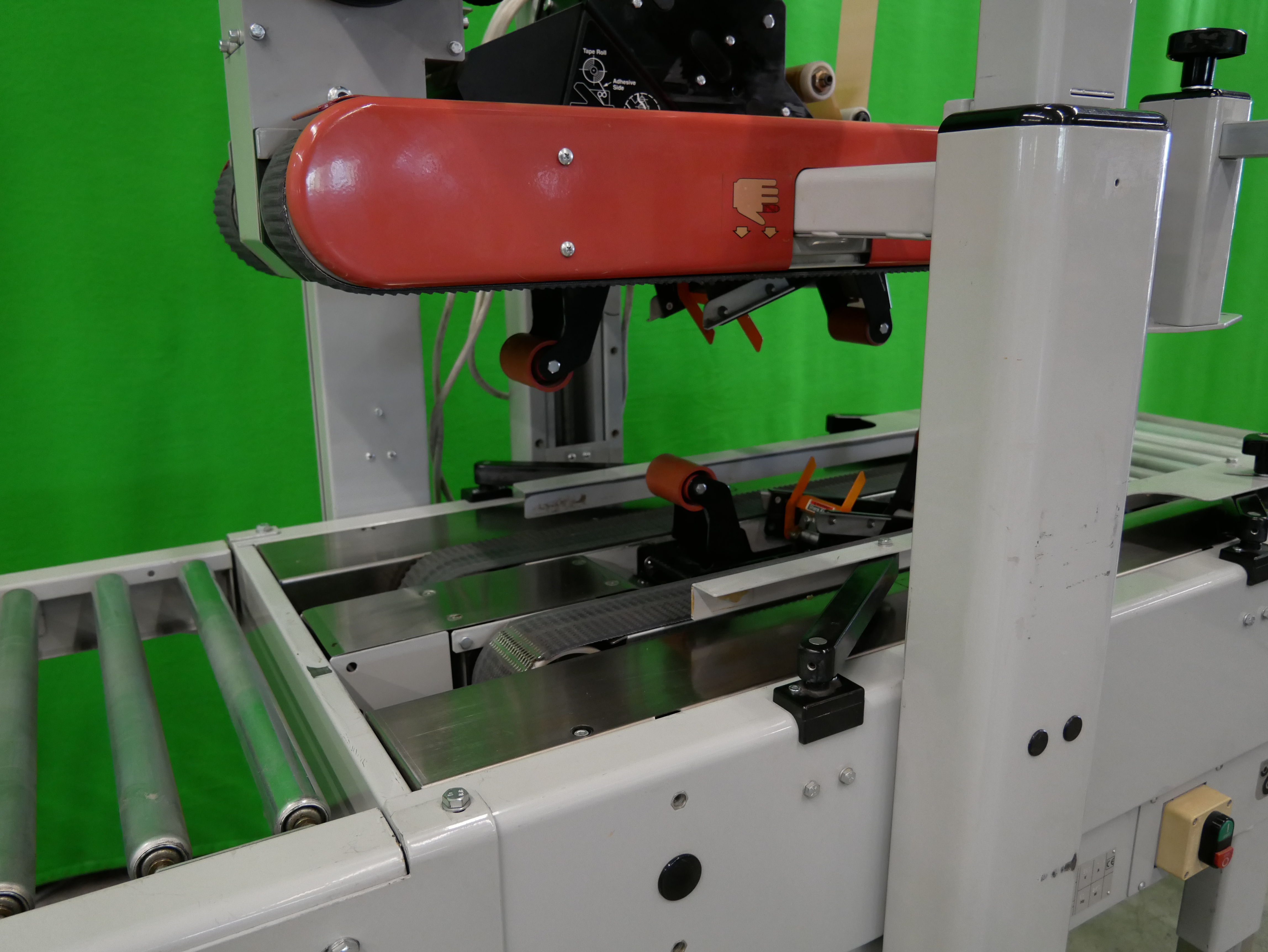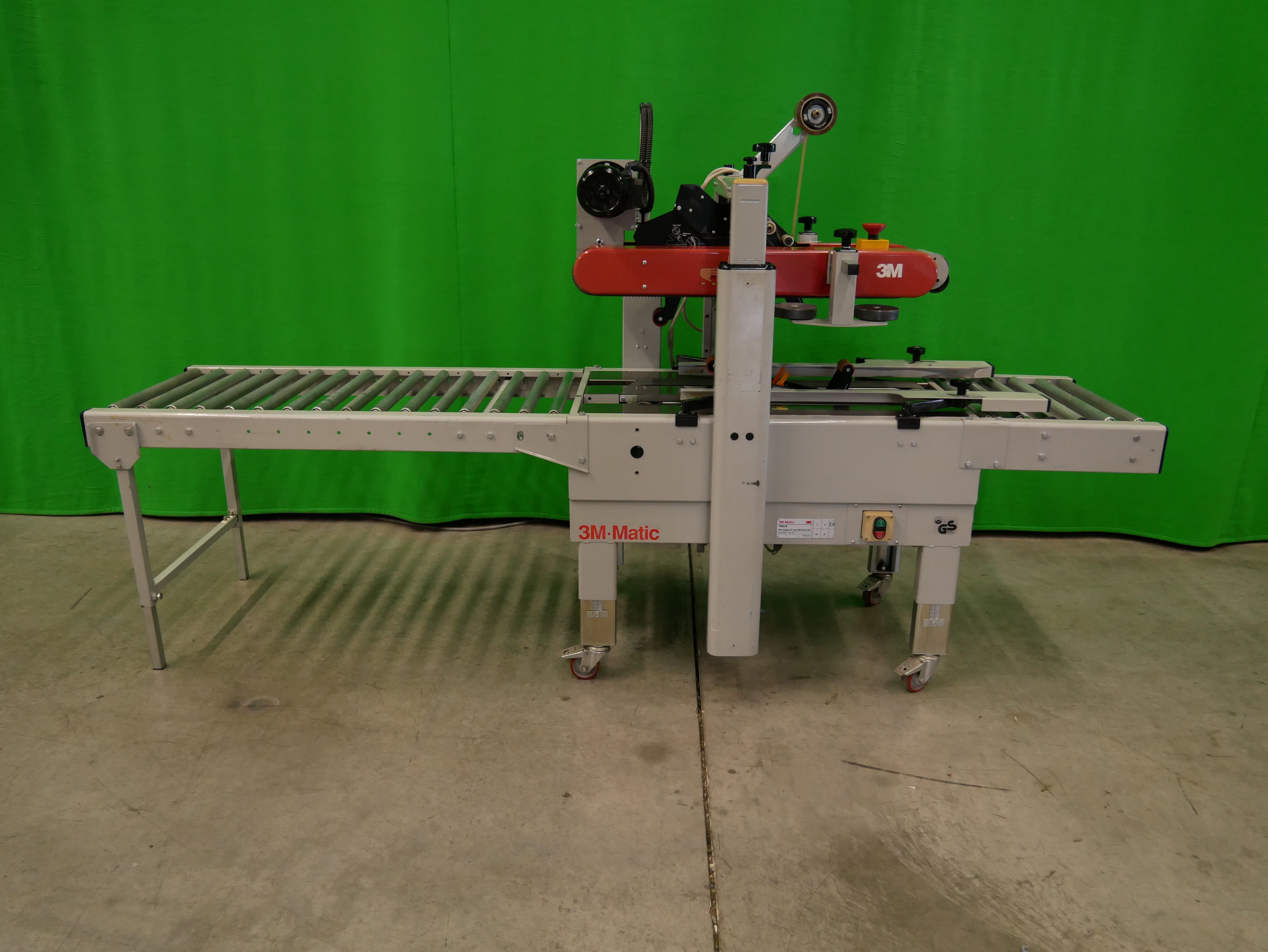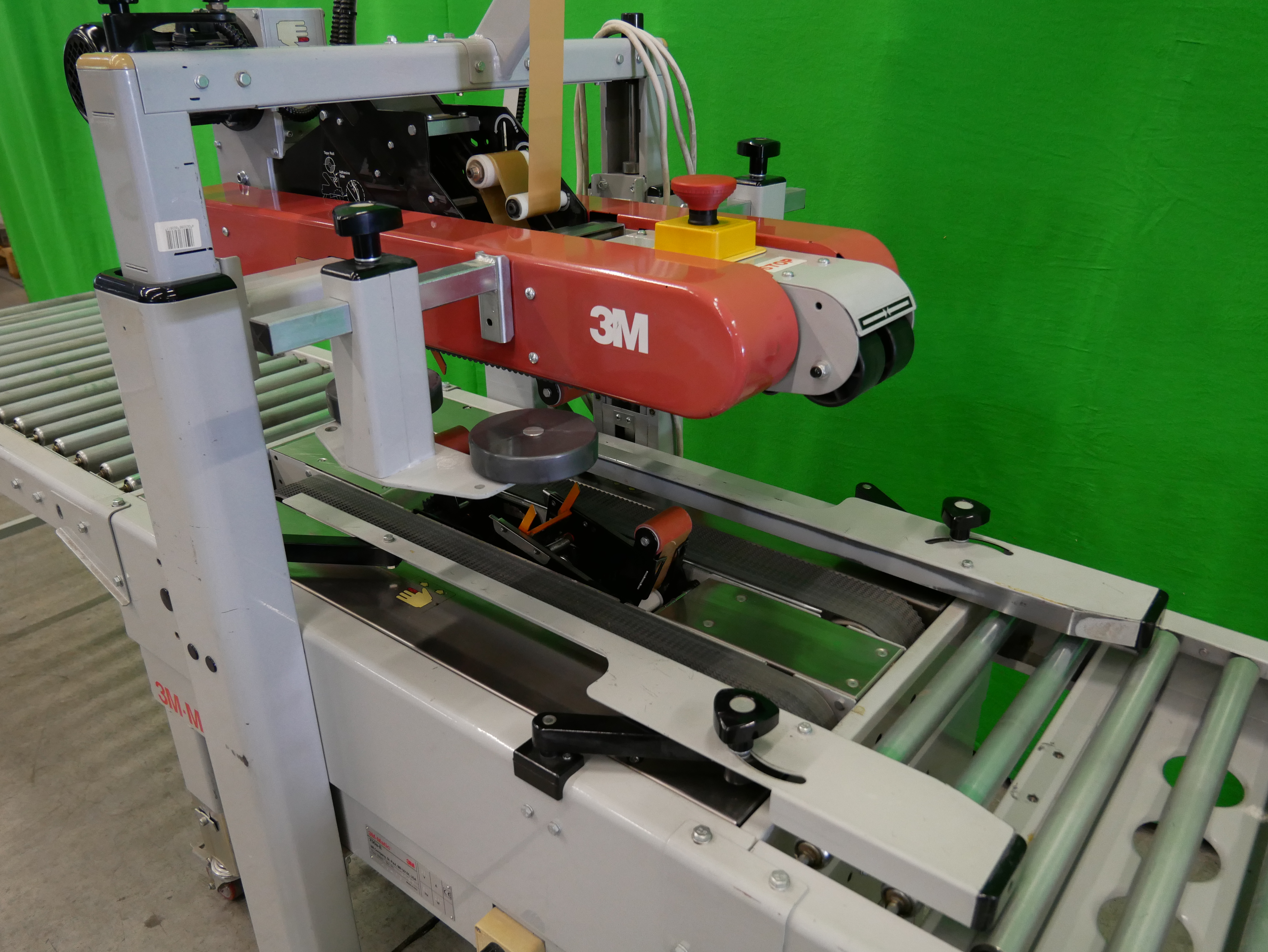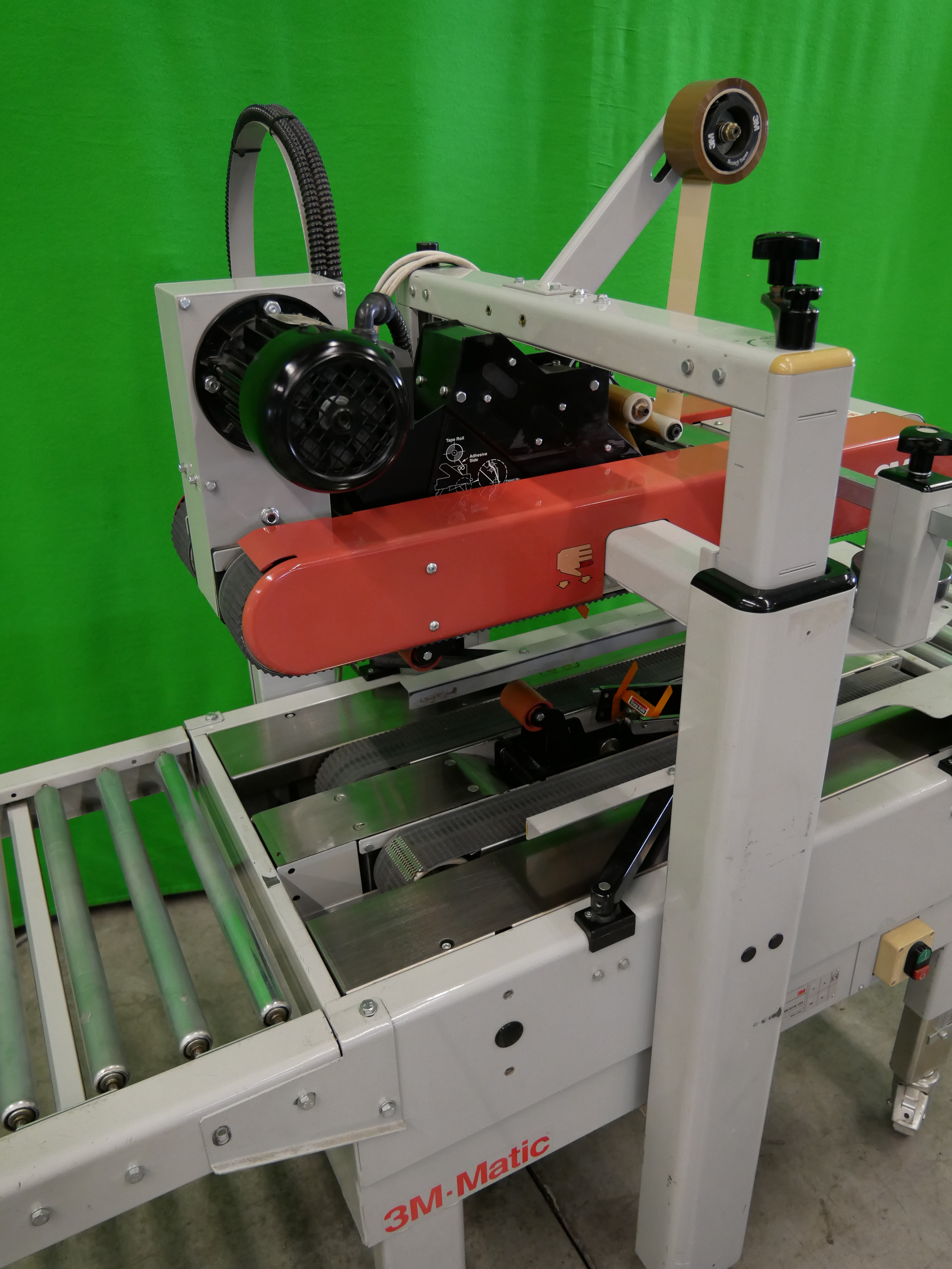 3M-Matic 700a-E Type 39600 (9796) Kartonverschließmaschine für Deckel- und Bodenverschluß mit Klebeband, oberer und unterer Riemenbandantriebssystem, Kartonformatbereich in mm Länge 150 - ~, Breite 150 – 550, Höhe 120 – 650, manuelle Kartongrößeneinstellung, maximales Kartongewicht ca. 38 kg, Rollenauslauf mit einer Länge von ca. 1200 mm, Antrieb oben und unten, elektrischer Anschluss 380V/50Hz/3PH/1,4A, 260W, Maschine in fahrbarer Ausführung auf Rollen, Leistung bis zu 40 Kartons pro Minute