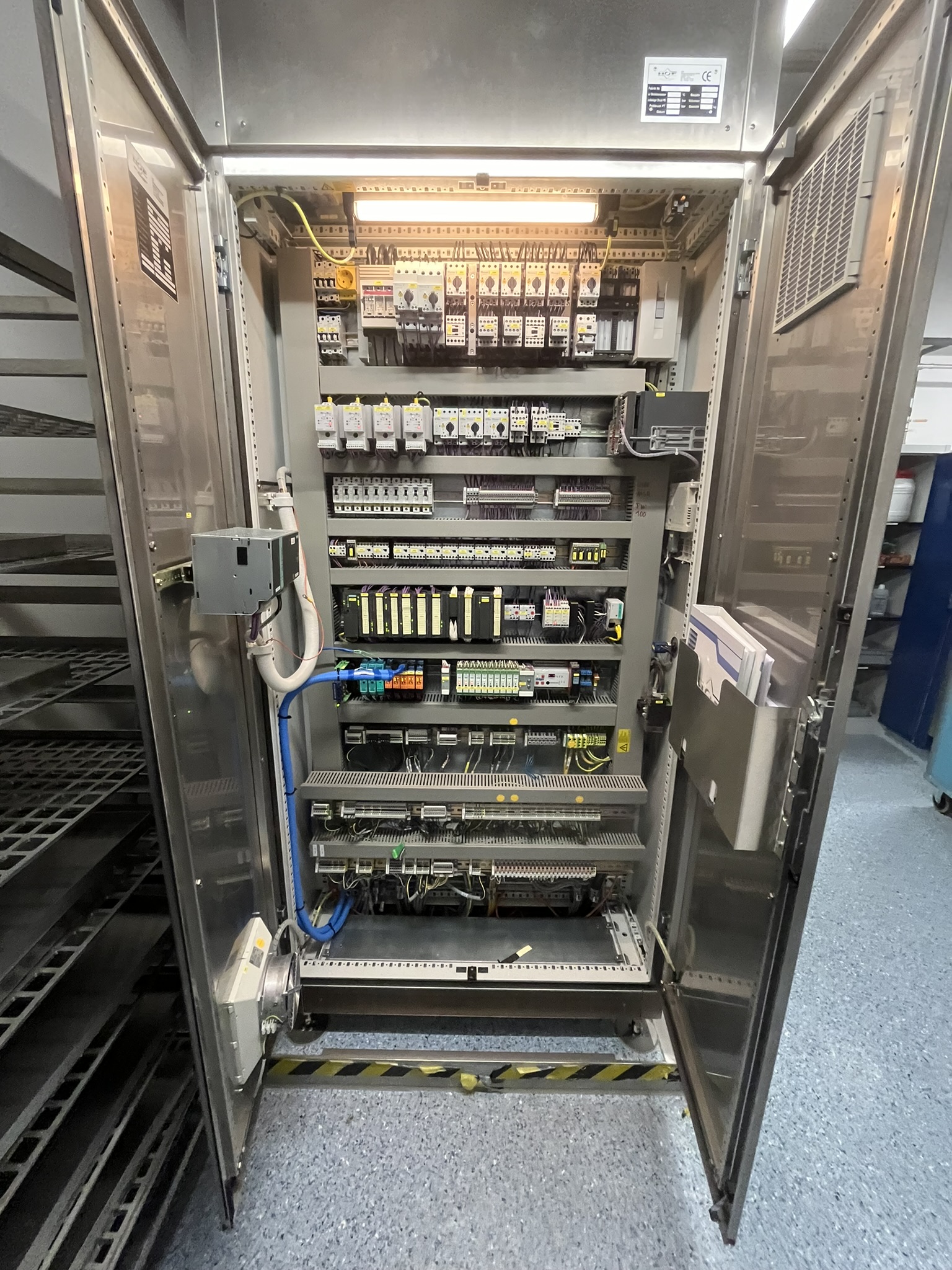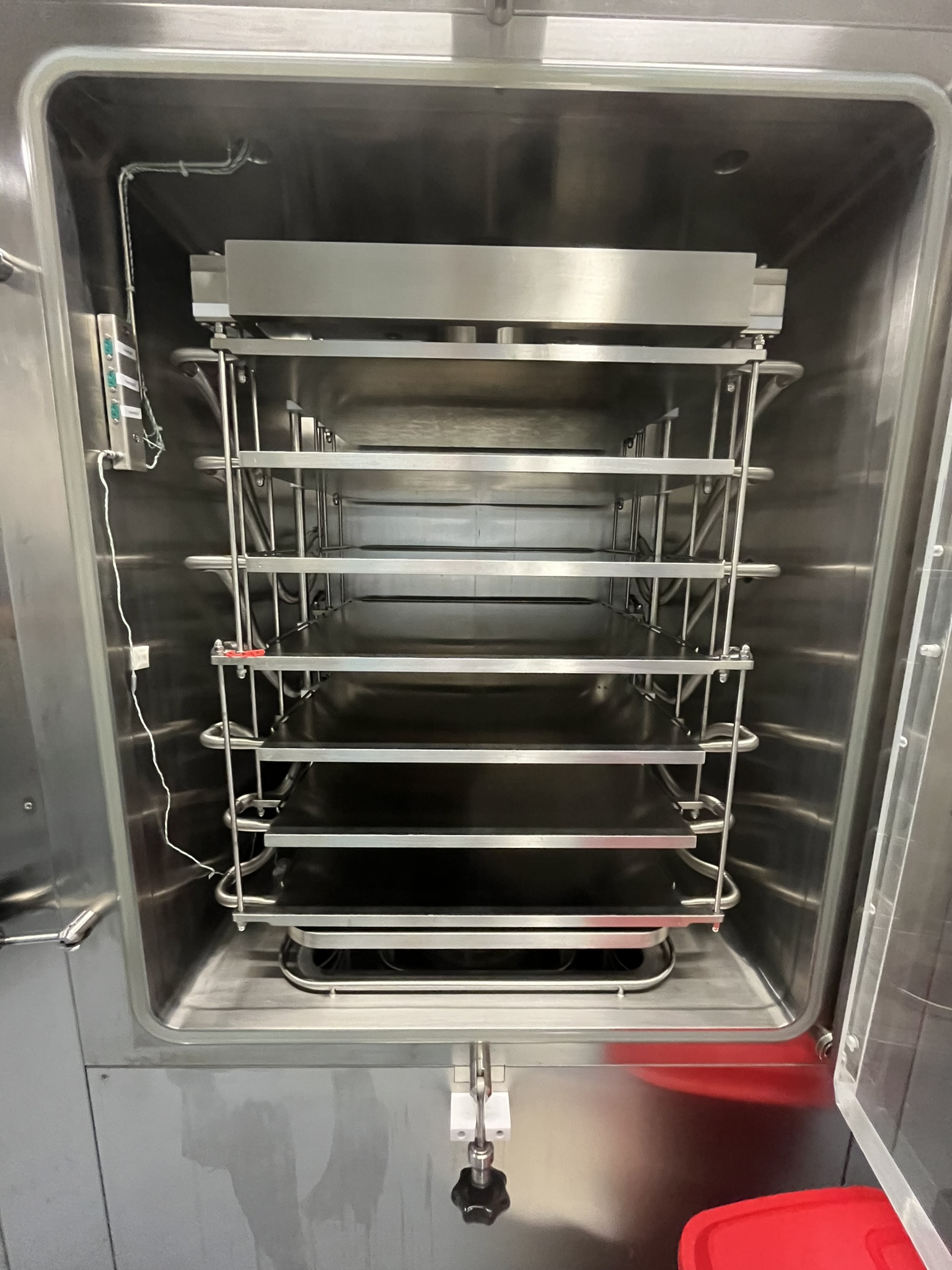 HOF GT Labor-Gefriertrockner (2,16 m2) für Vials mit „Stoppering“ zum Eindrücken der Gummistopfen nach Abschluss des Gefrierprozesses, Anzahl der Platten/Stellflächen 6+1, Stellplatten-Nutzfläche 600 x 600 mm (BxT), Plattenabstände 6 x 110 mm, Kammer-Nettoinhalt 645 Liter, zulässige Betriebstemperatur Kammer von -80°C bis +80°C, zulässiger Betriebsüberdruck Kammer von +0,01bis -1 bar, elektrischer Anschluss 400V/3Ph/50Hz, 37 kW, Siemens SIMATIC S7-300, Maschinengrundfläche ca. 2420 x1160 mm (BxT), Maschinenhöhe ca. 2620 mm, Maschinennettogewicht ca. 2600 kg, inkl. Containment-Kühltechnologie (EX-Zone 2, Temperaturklasse T1), welche die F-Gasverordnung der EU erfüllt, Kältemittel R170 mit Füllmenge 1,3 kg und R1270 mit Füllmenge 5,5 kg, zulässiger Betriebsüberdruck 23 bar