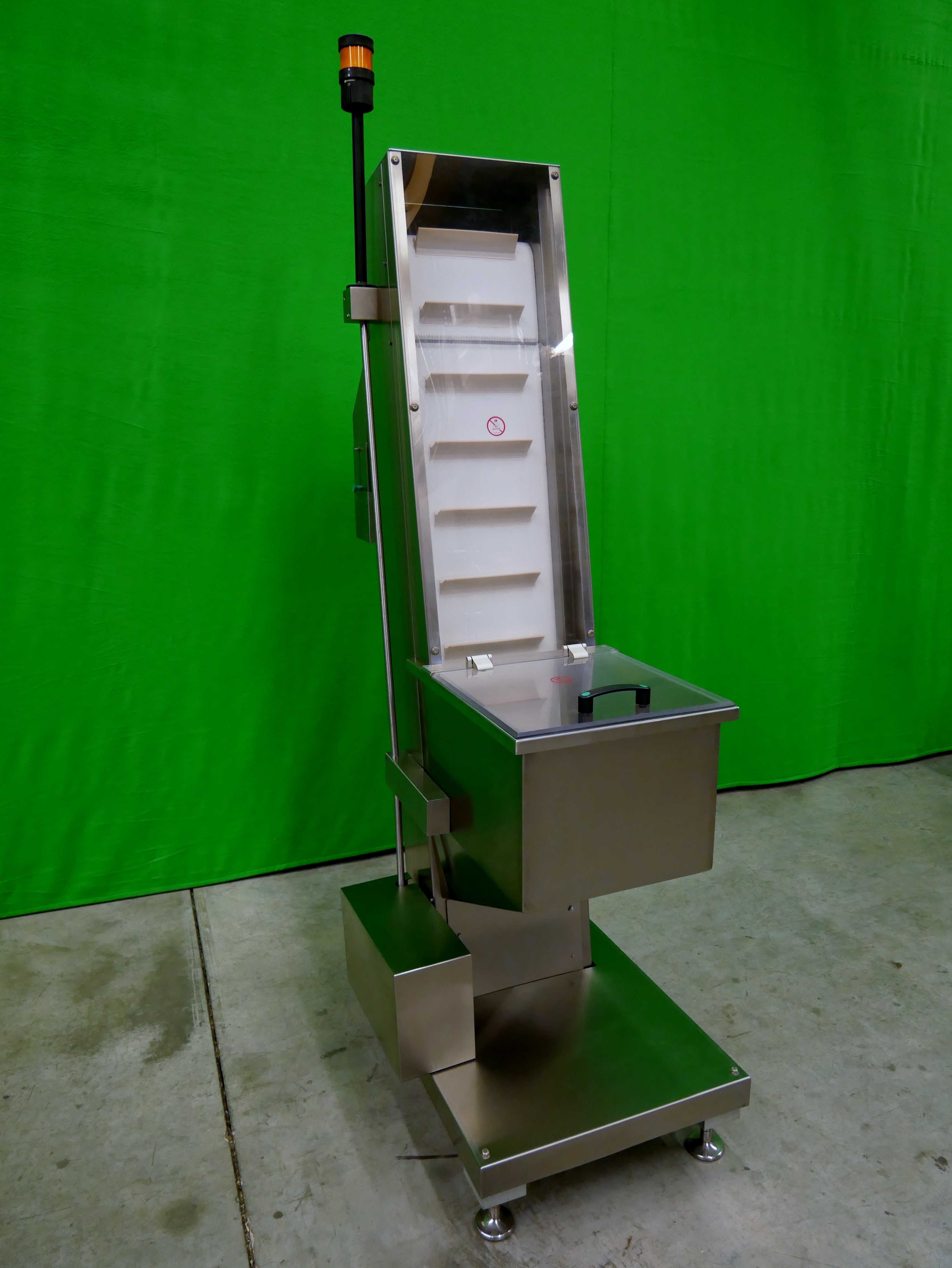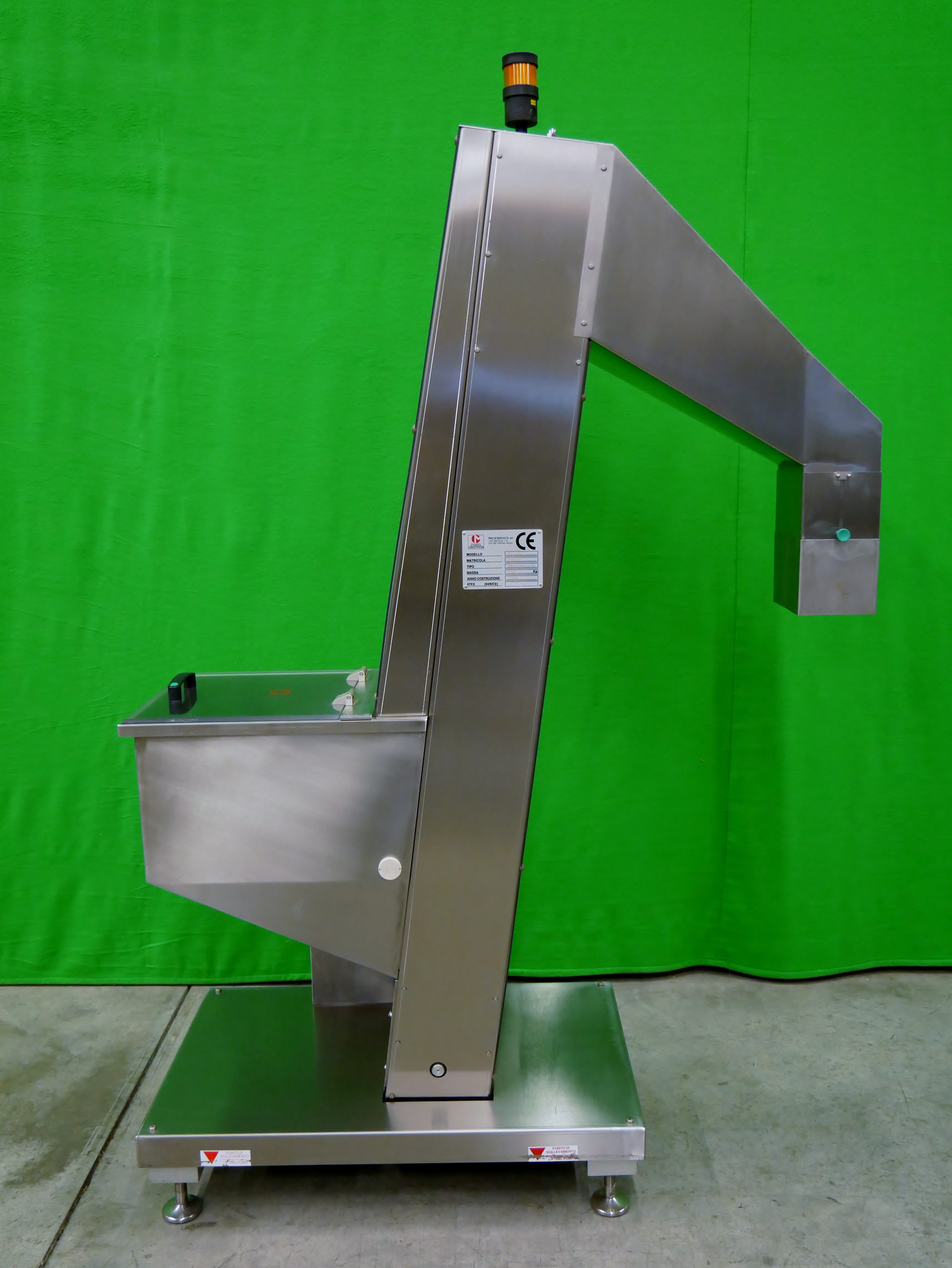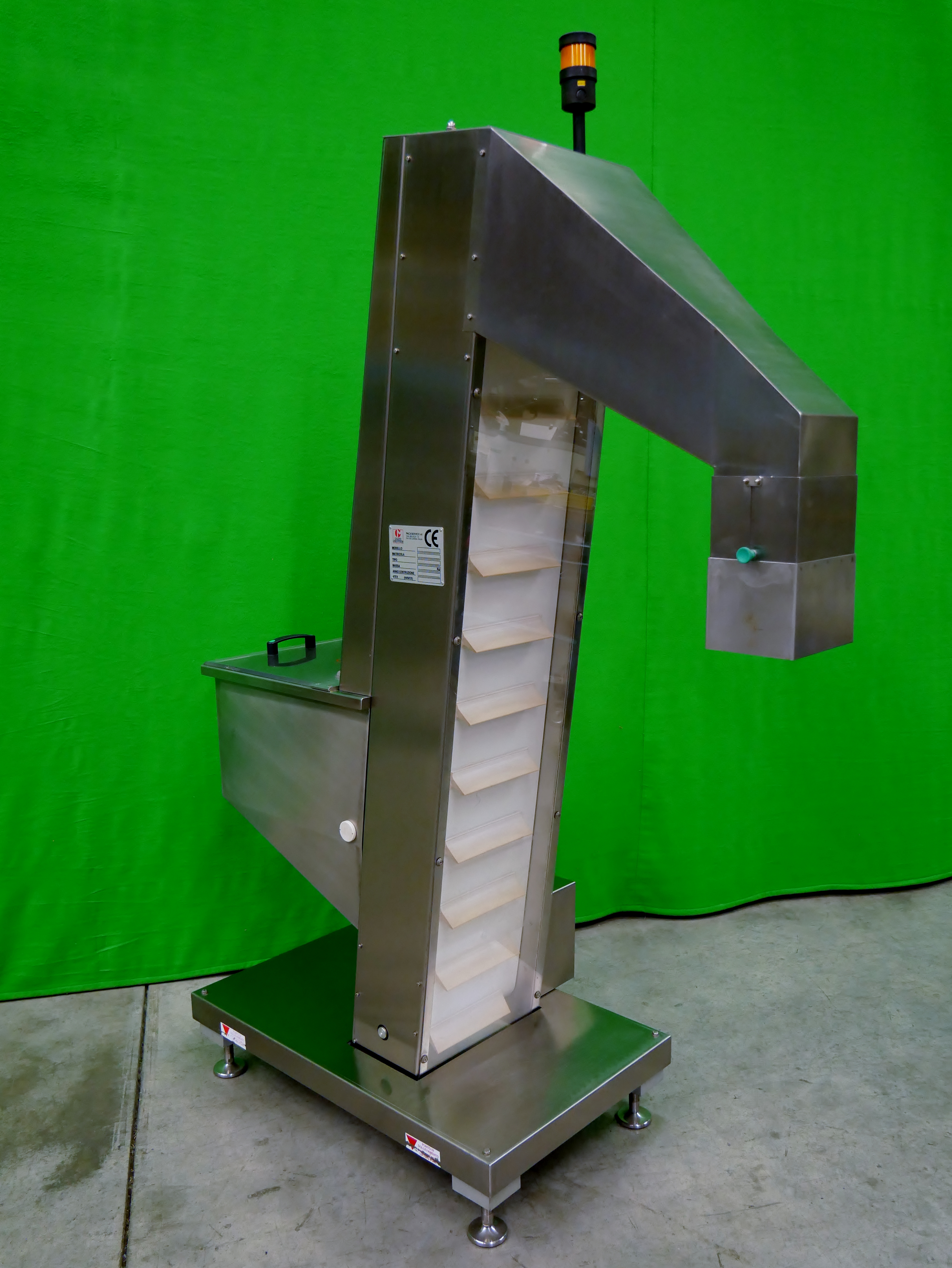 Pack Service (Marchesini-Gruppe) PS 233 Elevator, Aufgabeöffnung ca. 400 x 400 mm (BxT), Aufgabehöhe ca. 1000 mm, Bandbreite ca. 340 mm, Stegbreite ca. 240 mm, Steghöhe ca. 40 mm, Stegabstand ca. 150 mm, Auslaufhöhe verstellbar zwischen ca. 1100 bis 1200 mm, Gewicht ca. 250 kg