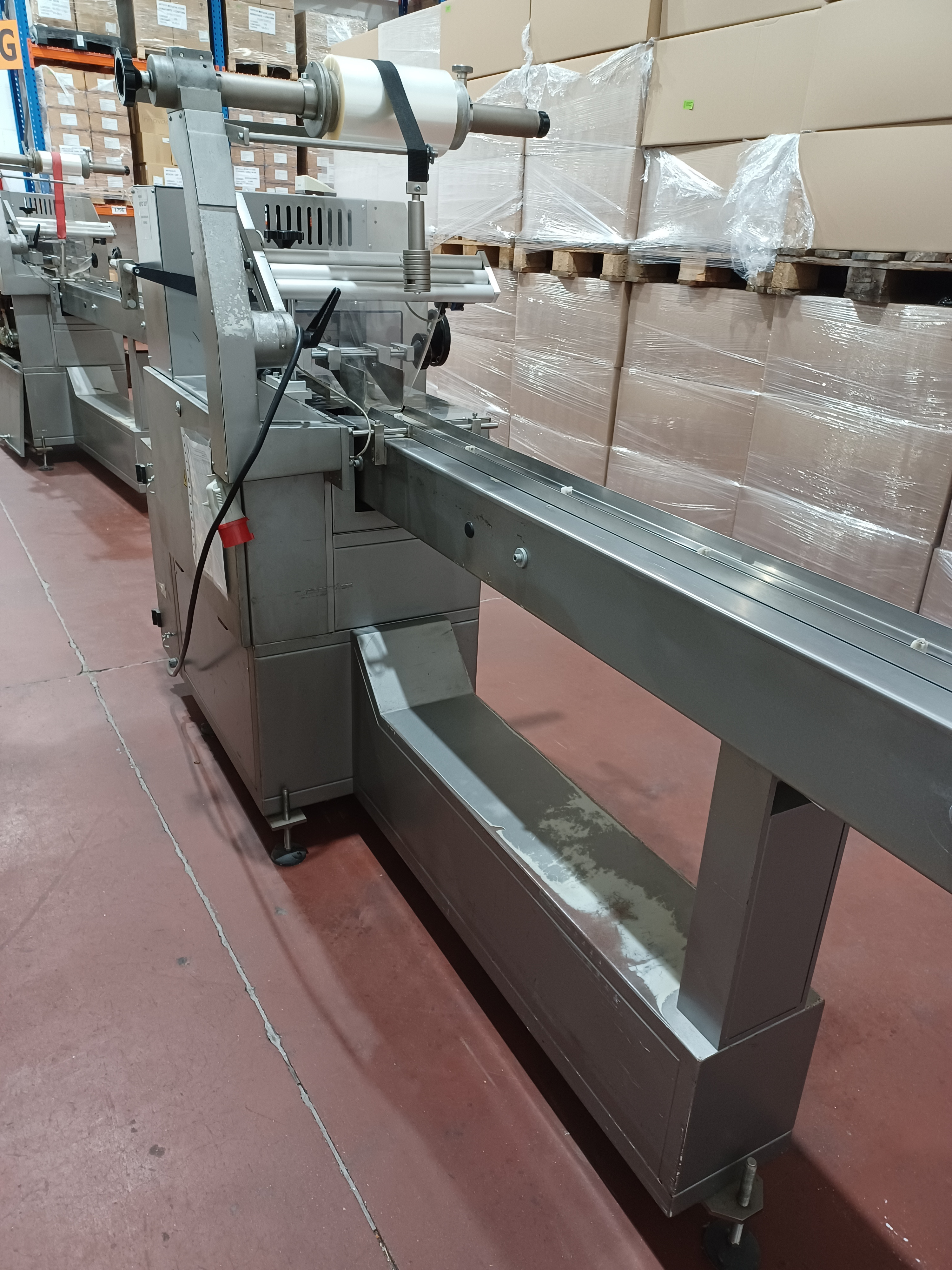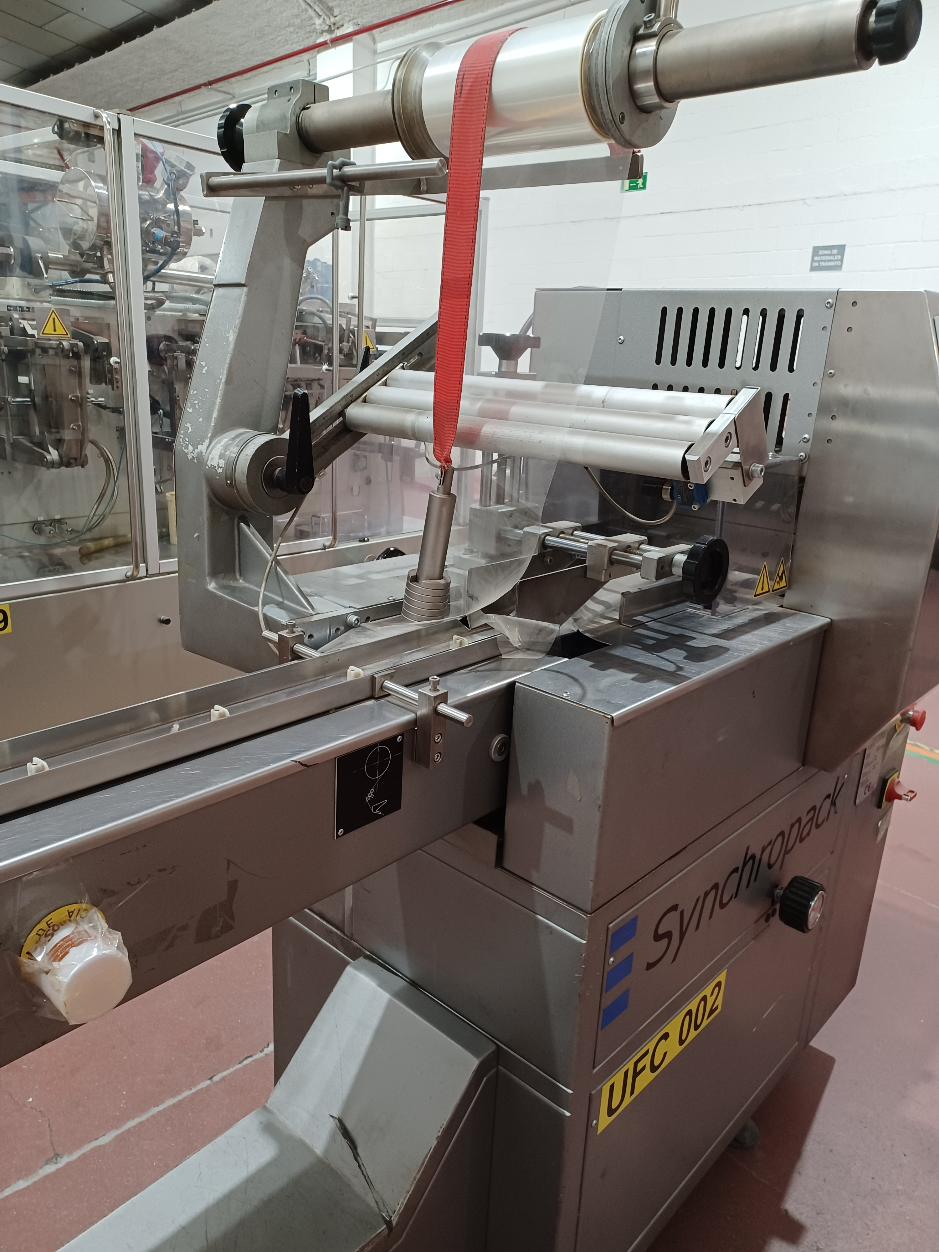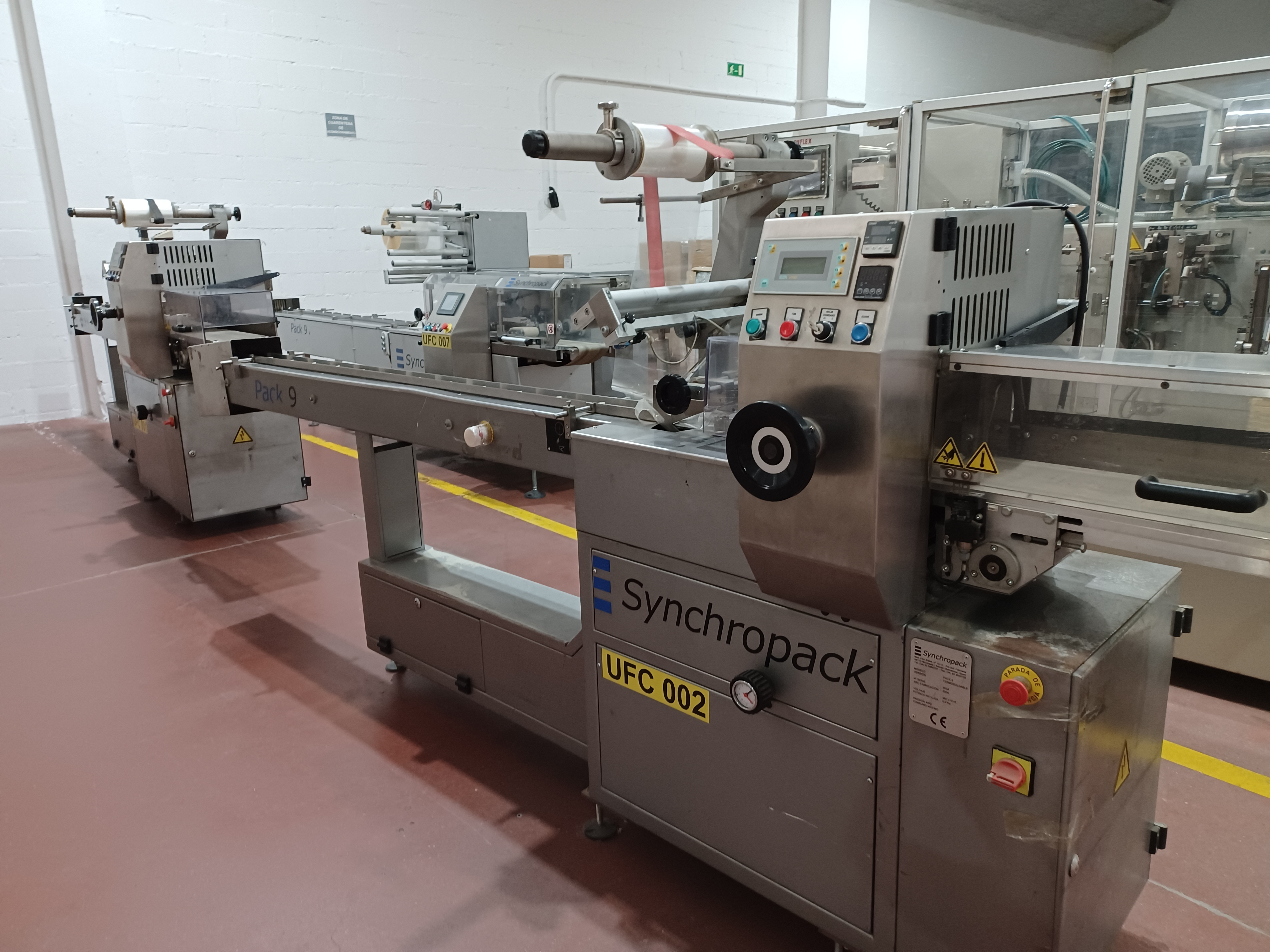 Synchropack Pack 9 Horizontale Elektronische Flowpack-Verpackungsmaschine für kleine und mittlere Produktionen und heißsiegelbare Folie, mit Zuführband, Formschulter, Längsschweißgruppe, Schneid-Schweiß-Gruppe, Auslaufband und Bedienerterminal, modularer Aufbau, einfache Installation, Bedienung und Formatwechsel, minimaler Wartungsaufwand, Bedienung von links nach rechts, Folienrollendurchmesser max. 300 mm, maximale Folienrollenbreite 450 mm, Rollenkerndurchmesser 76 mm, elektrischer Anschluss 380 V/ 50/ 60 Hz, 3 Phasen, Druckluft 6 bar, Leistung 15 – 150 Pakete/Min., Maschinenabmessungen 2650 x 790 x 1530 mm (L x B x H) , Arbeitshöhe 980 mm, Maschinennettogewicht ca. 500 kg, 2 Maschinen verfügbar.