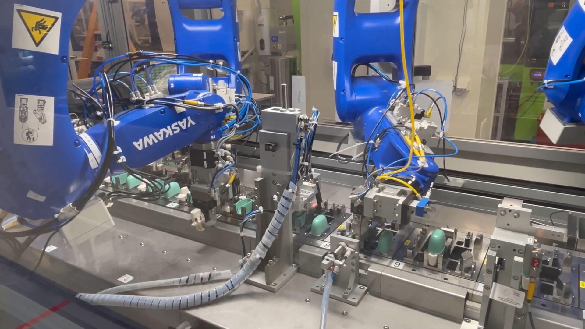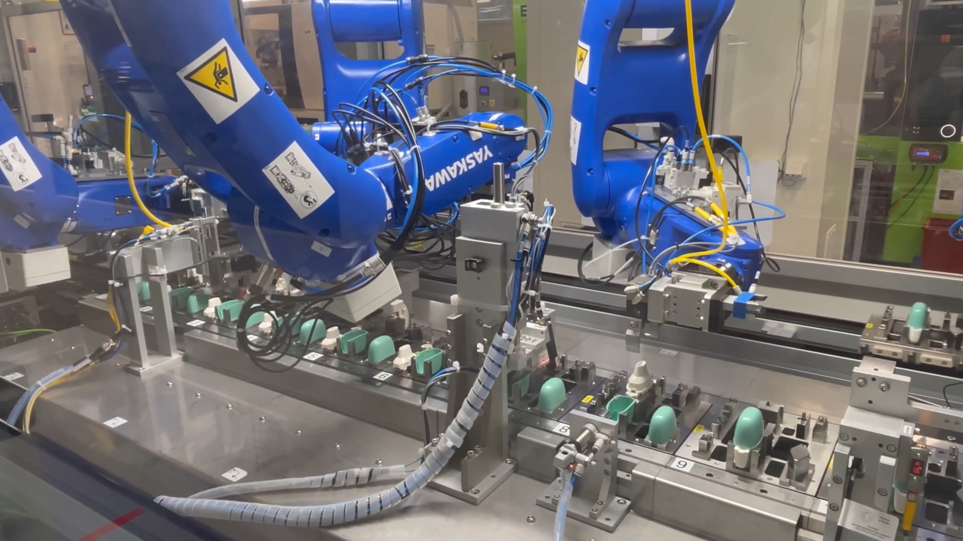 Phillips Medisize (Molex) - Assembly line for Unit-dose capsule inhaler devices for dry powder (DPIs), including automatic feeding and sorting of injection-molded parts (Base, Mouthpiece, Platform, Spring, Button, Bridge, Mesh, Bezel, Mouthpiece Cover) using vibratory feeders or bowl systems, fully automated assembly of parts, Pad print on Mouthpiece Cover, several inline functional Testing & Visual Inspections, and laser marking of variable data and verification, manual transfer of good device to trays, overall line dimensions approx. 9.700 x 1.600 x 2.700 mm (LxDxH)