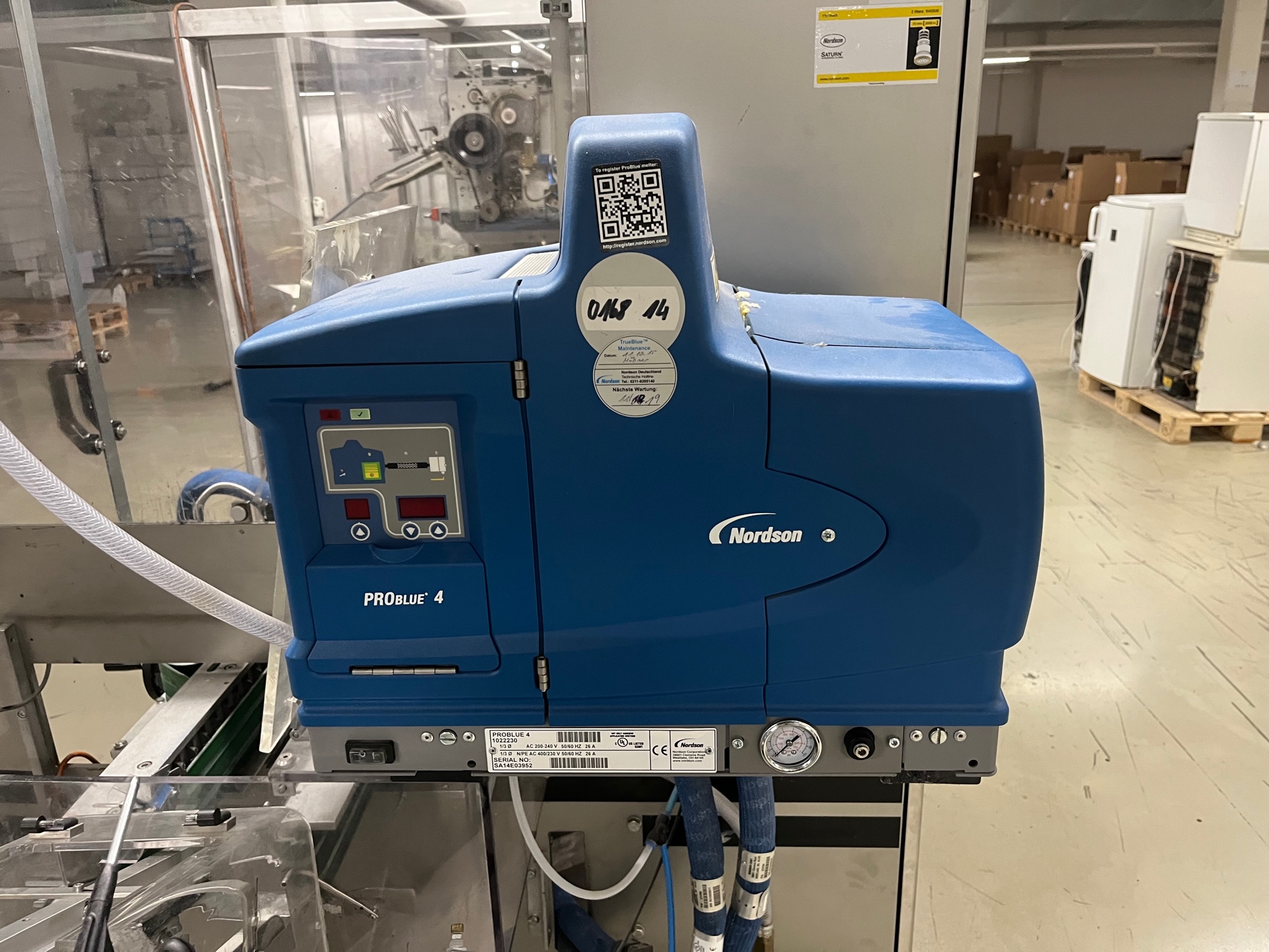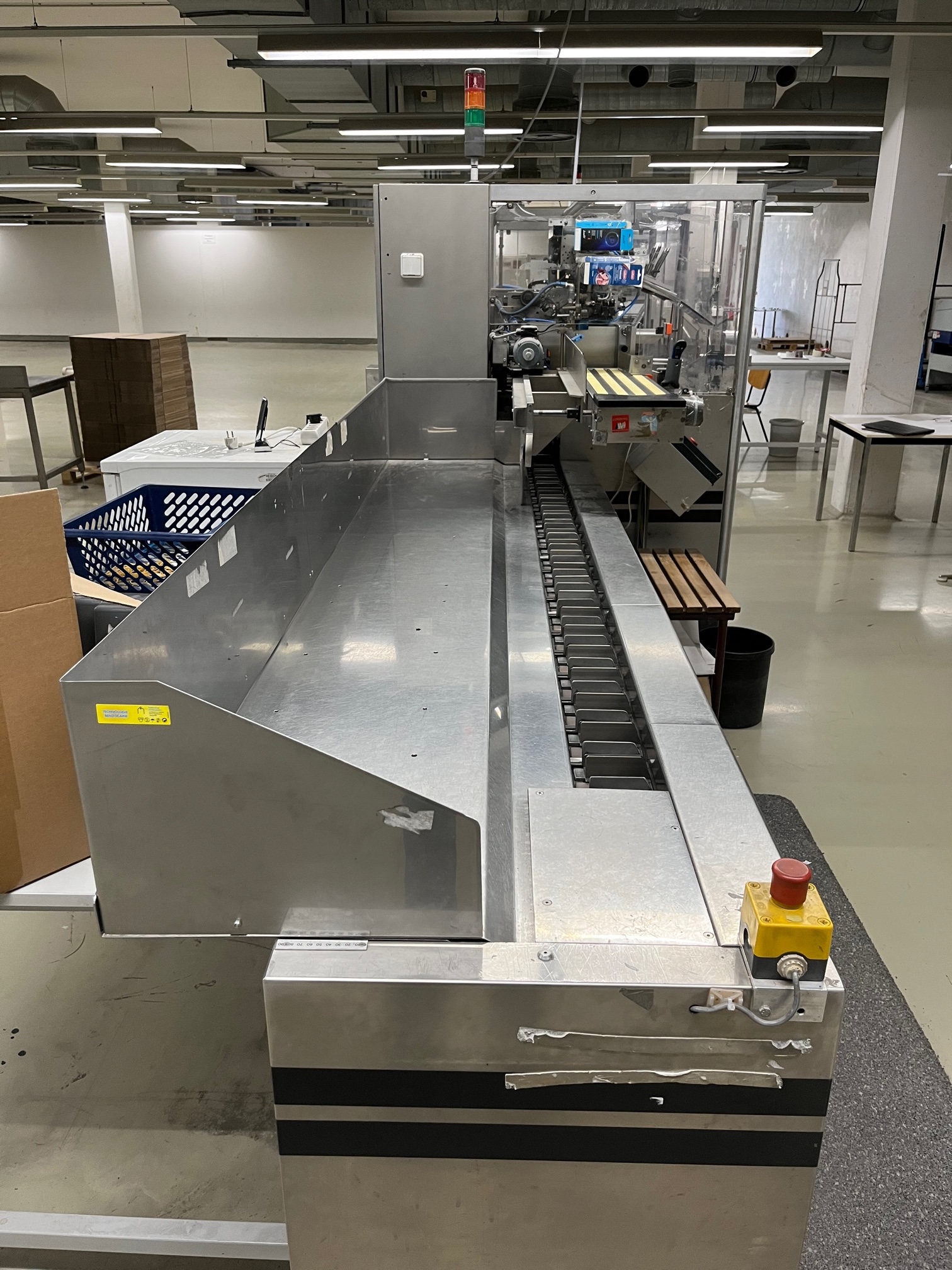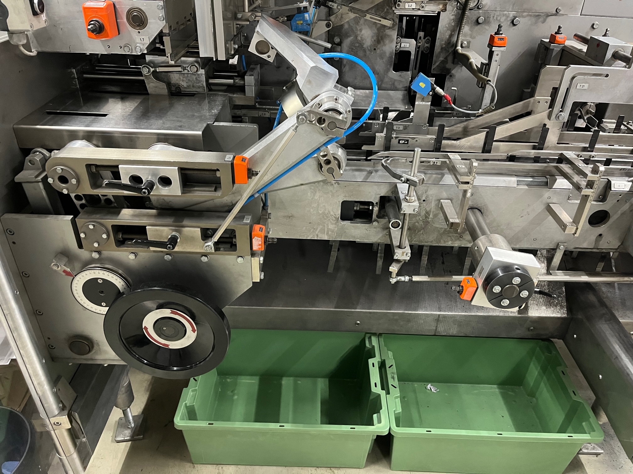 Harro Höfliger MKT 120 horizontal end load cartoner, intermittent motion, bucket infeed, with GUK FA21/4 Cartonac 91 leaflet feeder, glue closure with Nordson ProBlue 4 hot melt unit, minimum carton size 15 x 15 x 60 mm up to maximum 100 x 80x 200 mm, mechanical output up to 120 cartons per minute.