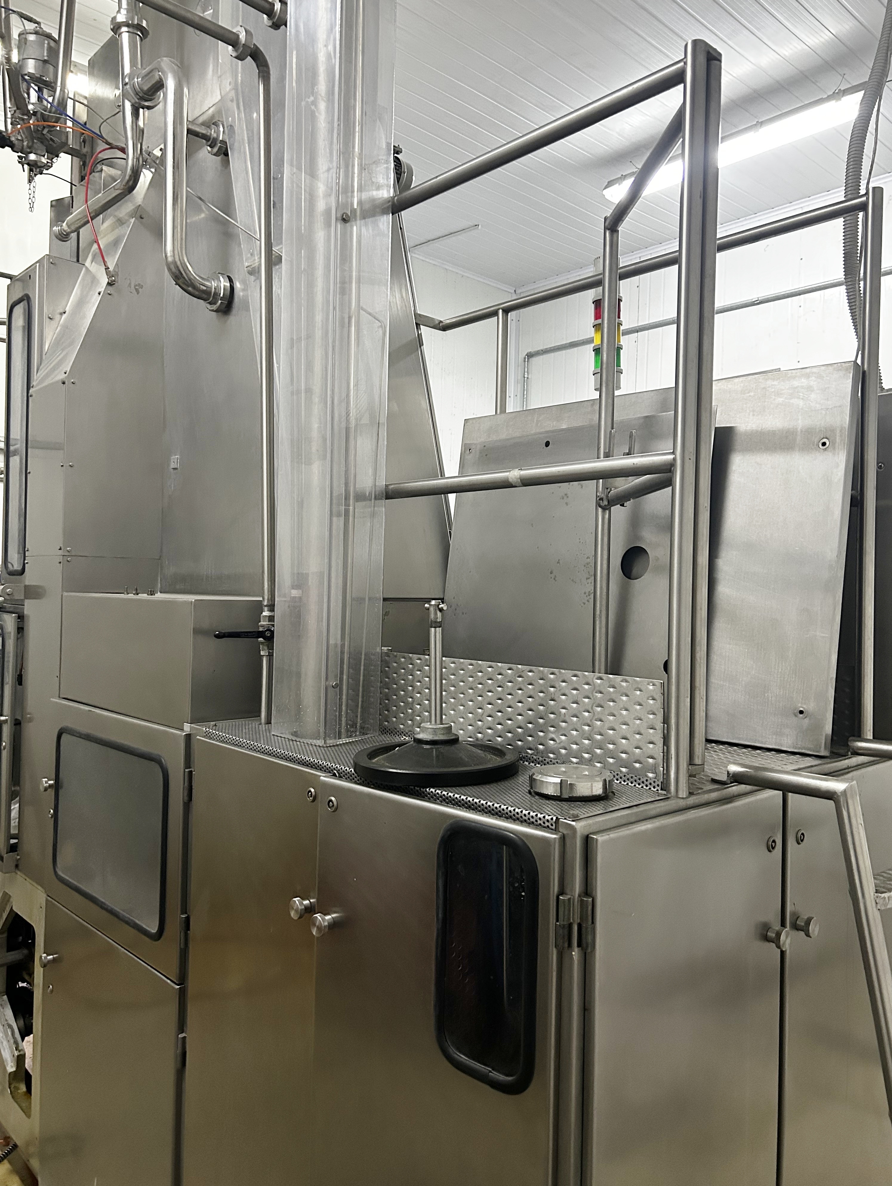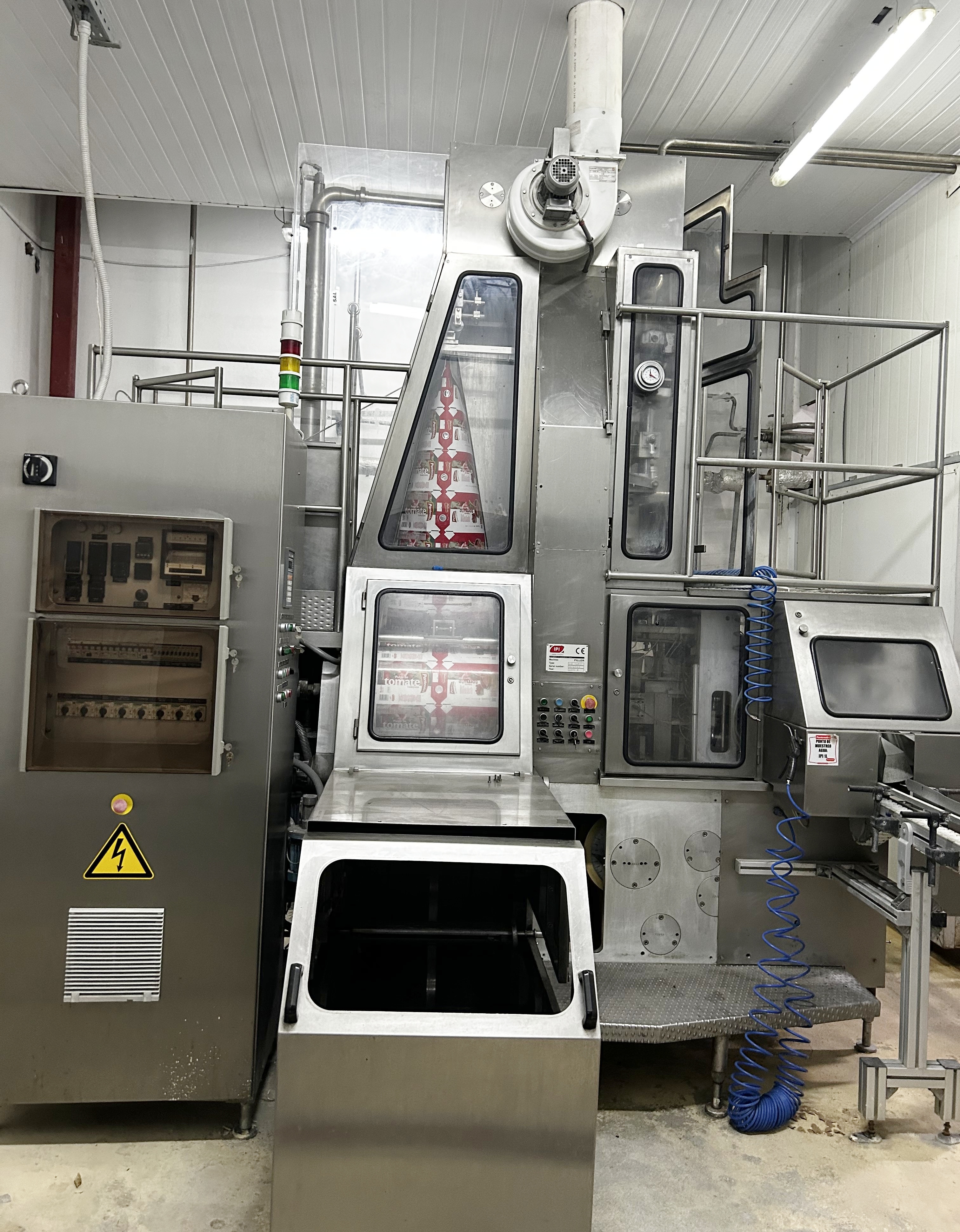 IPI modelo SA 50/2 Máquina llenadora aséptica de líquidos para formar, llenar y cerrar SLIM Brick cartones en una operación continua en un entorno estéril, actualmente configurada para cartones de 97 mm x 62 mm x 170 mm con un volumen de llenado de 1000 ml, incluyendo cinta transportadora de salida, conexión eléctrica 220/380 V/3 PH+N+T, 50/60 Hz, 25 kW, consumo de agua de refrigeración 11 l/min, dimensiones de la máquina aprox. 3300 x 1600 mm (largo x ancho), altura de la máquina aprox. 3500 mm, peso neto de la máquina aprox. 3320 kg, capacidad de produccion hasta 3.300 cartones por hora con un volumen de llenado de 1000 ml, 8.985 horas en producción, la máquina cerradora de tapas de rosca no está incluida. La máquina se encuentra en buenas condiciones de operación y ha sido revisada periódicamente por el fabricante IPI.