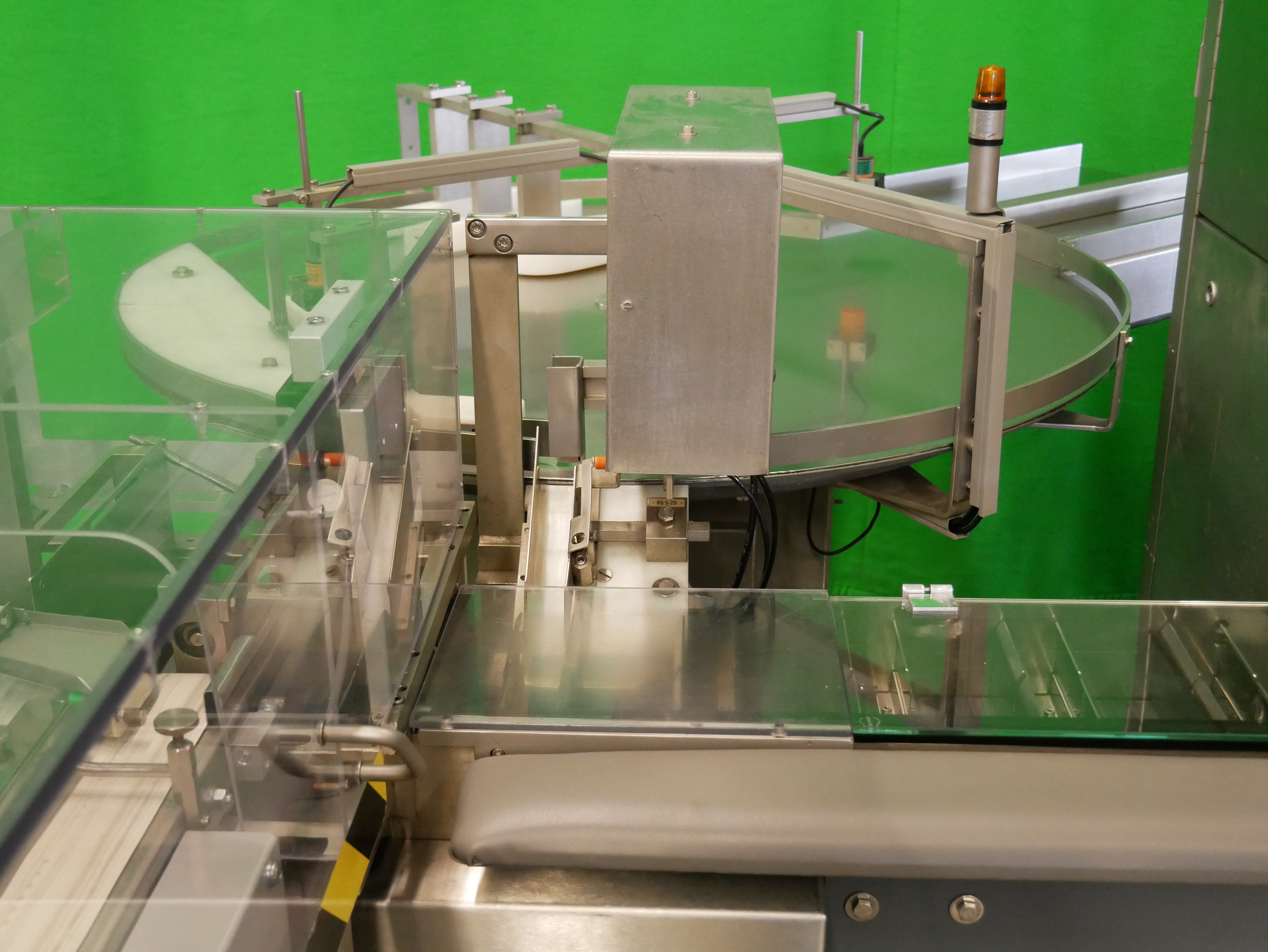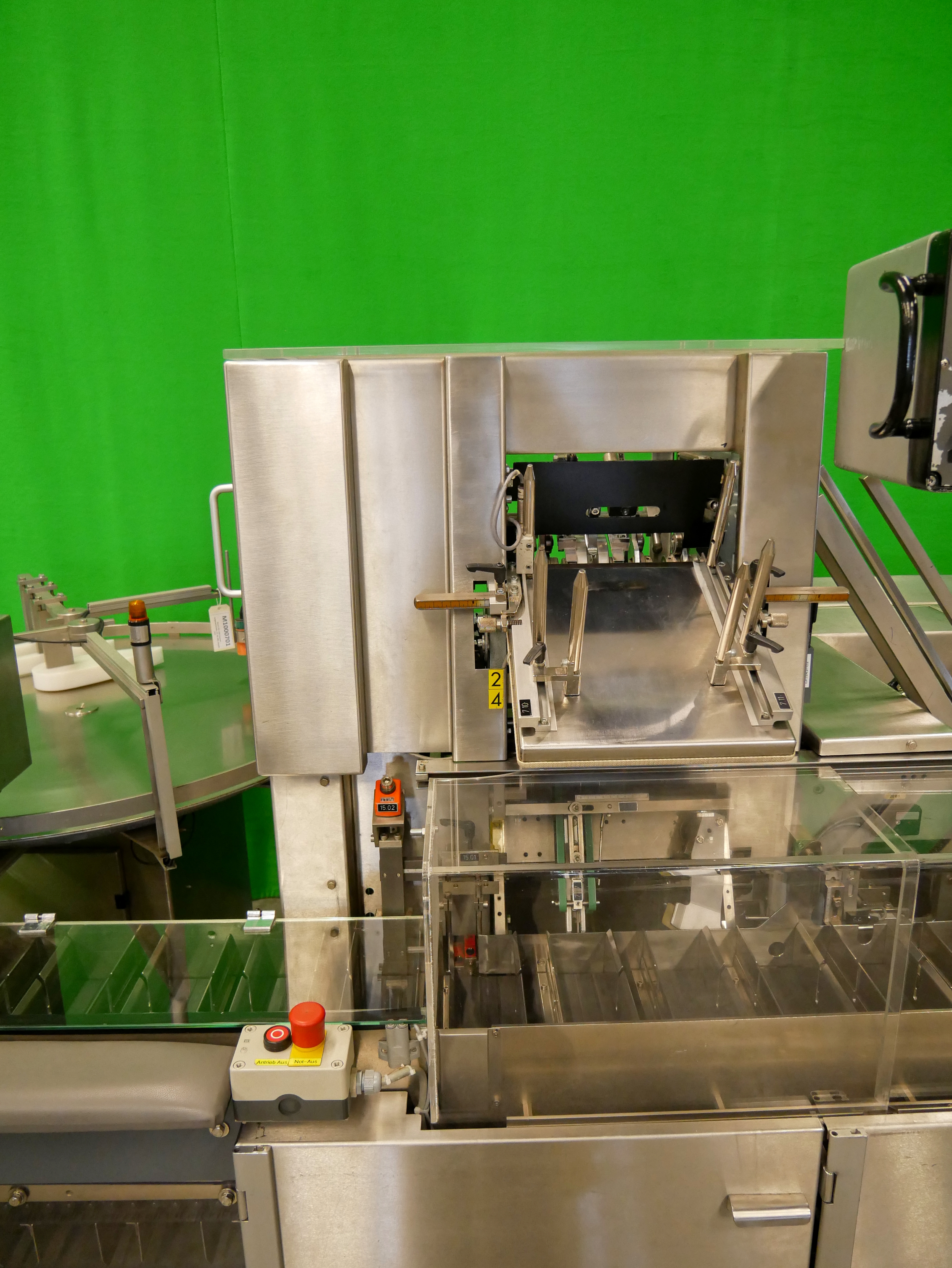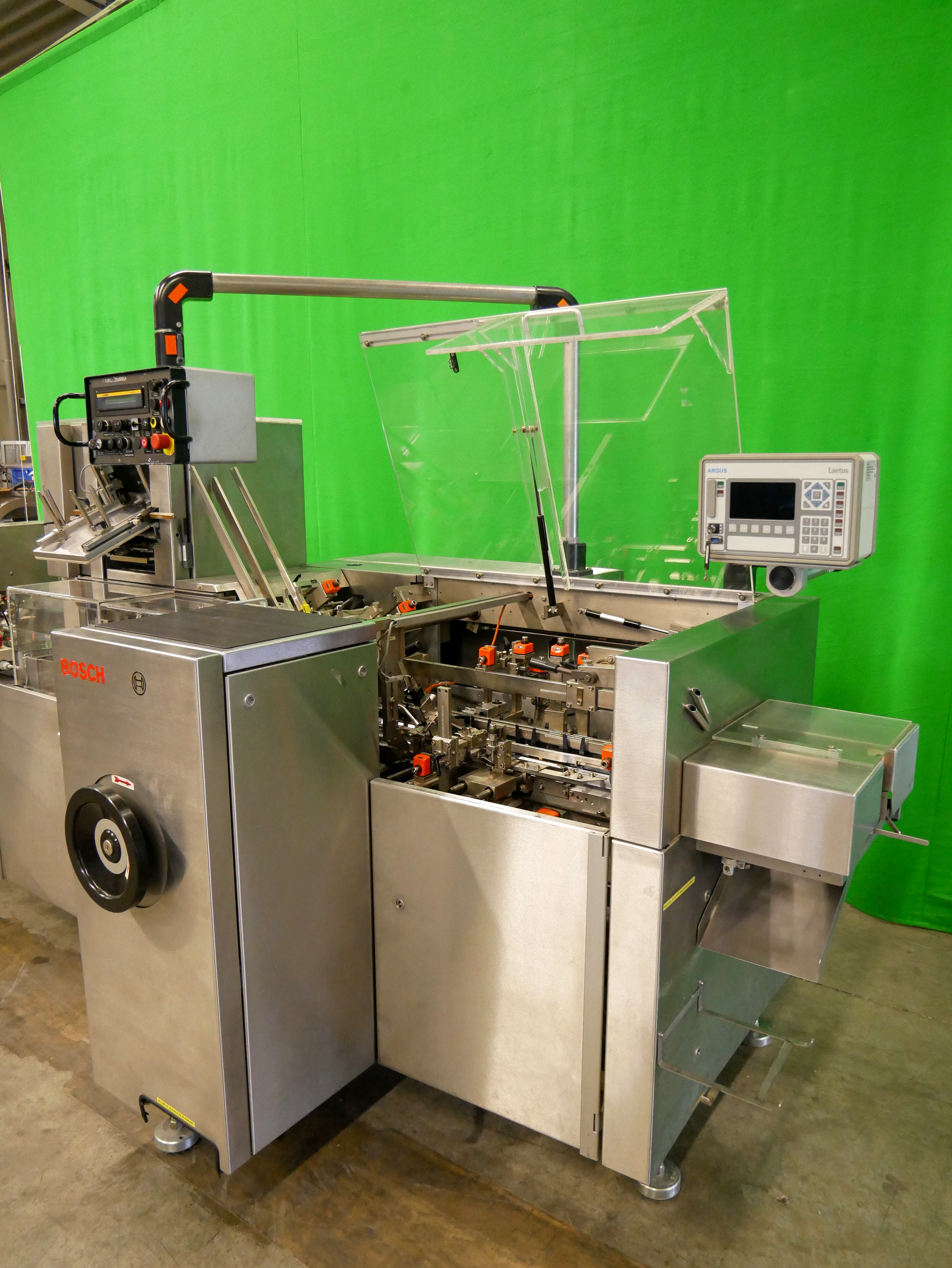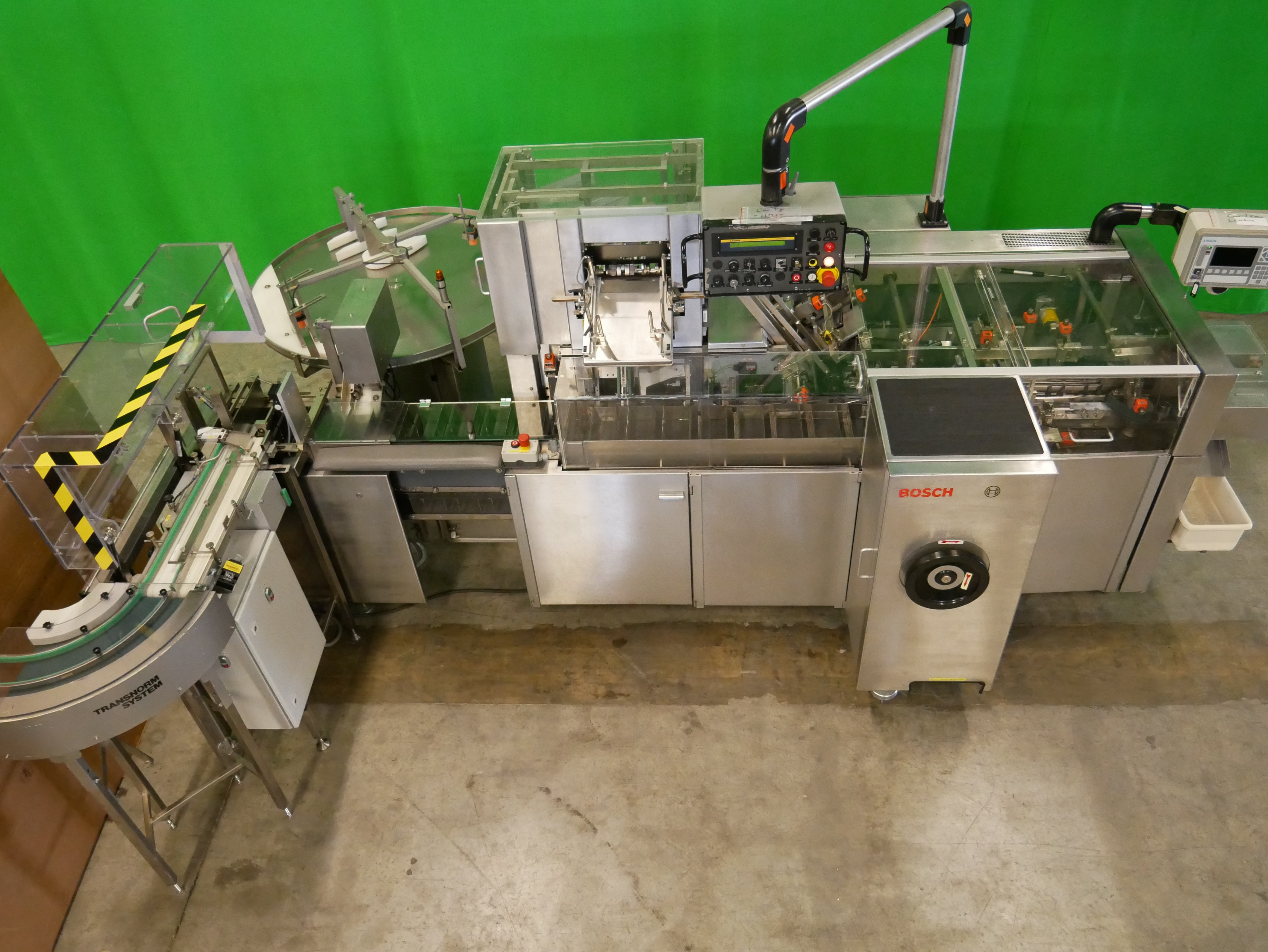 Bosch Car T5 Estuchadora horizontal para viales/botellas, blísteres, etc., con operación intermitente, alimentación de blísteres, etc. mediante Transform System cinta curva y cinta de alimentación (180 mm x 700 mm (ancho x largo de la cinta)) con apilador escalonado, alimentación de viales/botellas mediante Bosch URK 1200 mesa giratoria (diámetro de 1200 mm, adecuado para viales/botellas con un diámetro de 18-85 mm y una altura de 20 a 175 mm) con mesa de ingreso (490 x 580 mm (ancho x largo)) y dispositivo de inserción de botellas en la cadena de vasos de la estuchadora, rango de formato de estuche plegable desde mín. 20 x 16 x 60 mm (A x B x AL), hasta máx. 95 x 70 x 200 mm (A x B x AL), cierre con solapas desplazadas, incl. GUK FA21/4 plegadora de folletos desde pila (4 bolsas plegables, formato mín. 60 x 80 mm, máx. 210 x 300 mm, pliegue más pequeño de 15 mm), con codificador de solapas (estampado ciego, una cara, 3 líneas), pre-insertidor de folletos, Laetus Argus 6012 lector de códigos para estuches plegables y folletos con unidad de rechazo, capacidad hasta 100 estuches plegables por minuto, dimensiones de la máquina aprox. 3900 x 2500 mm (L x An), altura de la máquina aprox. 2000 mm