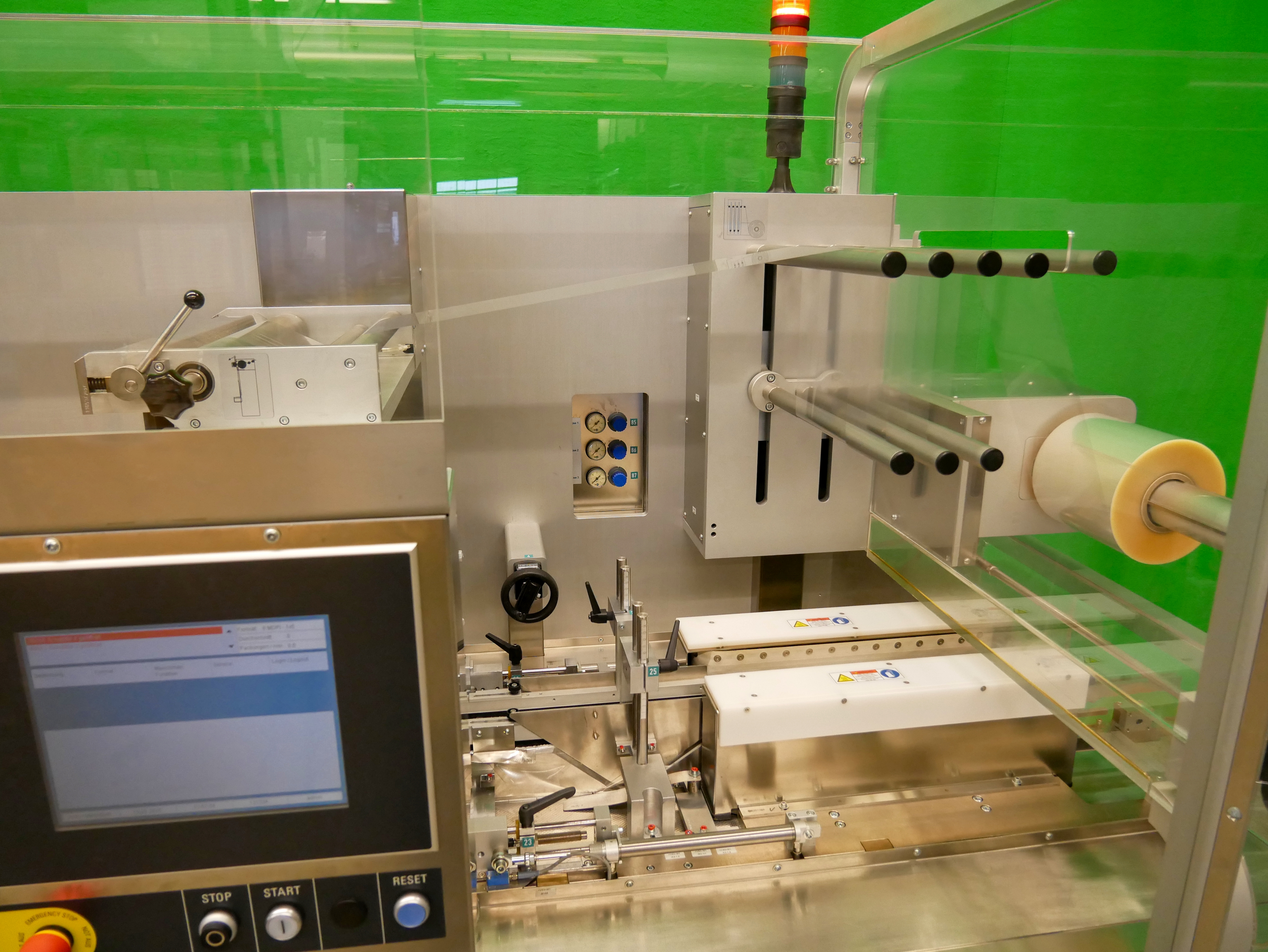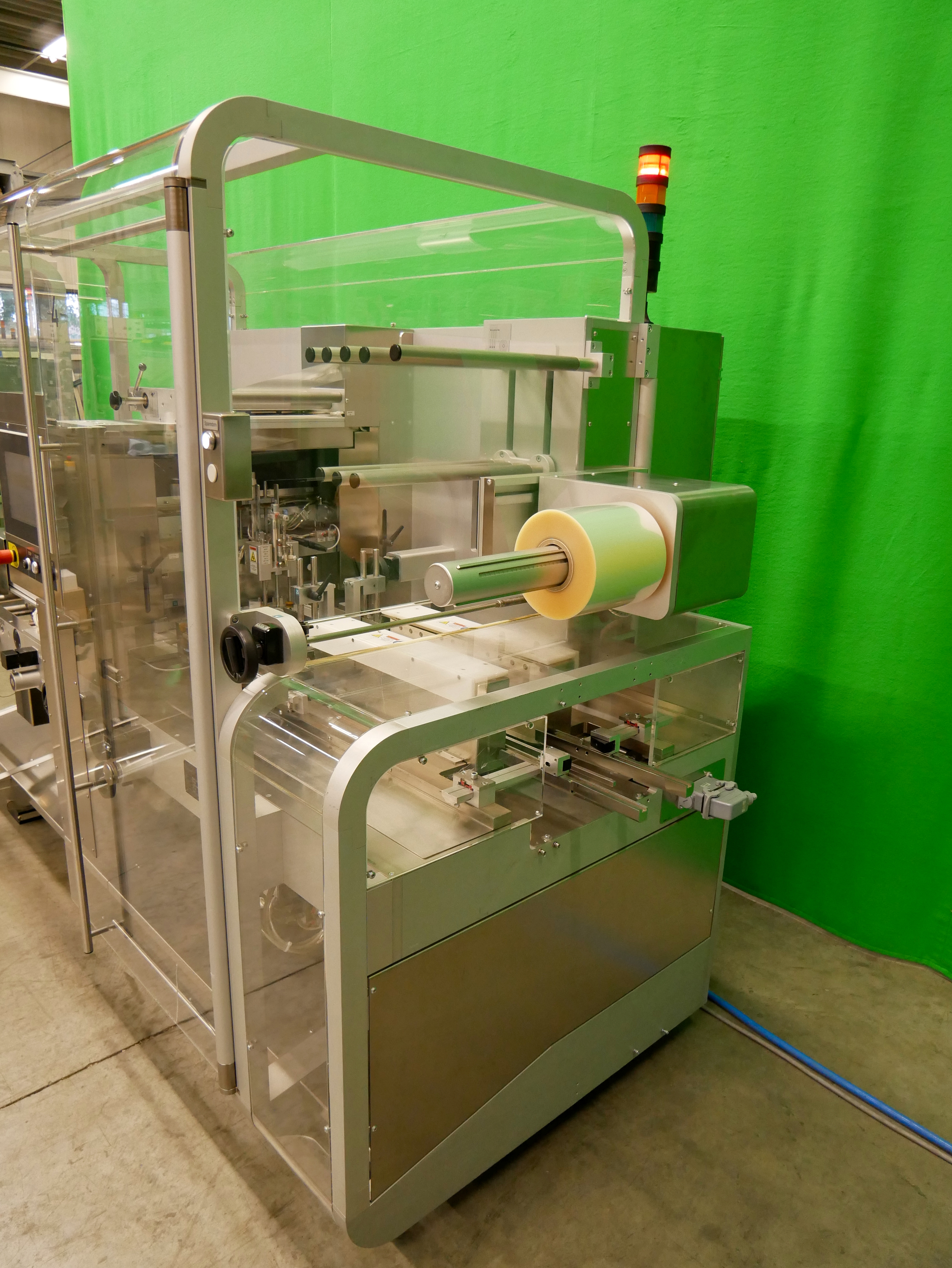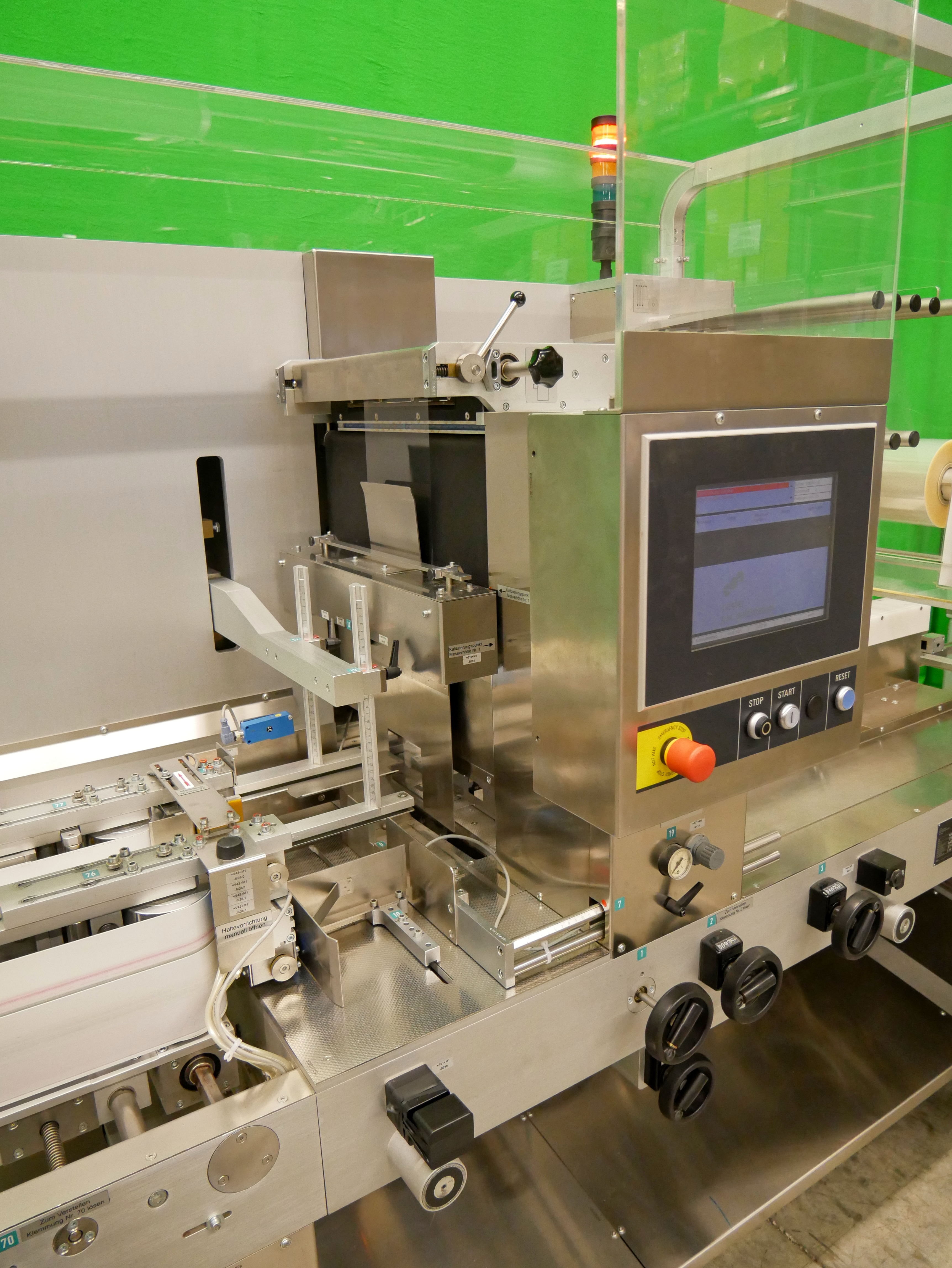 Pester PEWO-fold 1 Compact Máquina embaladora de estuches plegables individuales y conjuntos, en folio de OPP, PVC, PE, etc., ancho de folio de 90 mm a 230 mm, espesor de folio de 0,015 mm a 0,050 mm, diámetro del rollo de folio hasta un máximo de 350 mm, diámetro del núcleo de folio 76 mm, rango de formato desde mín. 60 x 60 x 20 mm, hasta máx. 400 x 350 x 140 mm, con estrella giratoria en alimentación de estuches plegables (girando el estuche por 90°), con ELAU PacDrive C400 control de máquina, conexión eléctrica 3x400 V+N+PE/50Hz, consumo de energía 8,7 KW, consumo de corriente 12,6 A, presión de funcionamiento 4 bar, altura de entrada y salida aprox. 900-950 mm, dimensiones de la máquina aprox. 2970 x 1600 mm (largo x ancho), altura de la máquina aprox. 2150 mm, peso neto de la máquina aprox. 1800 kg.