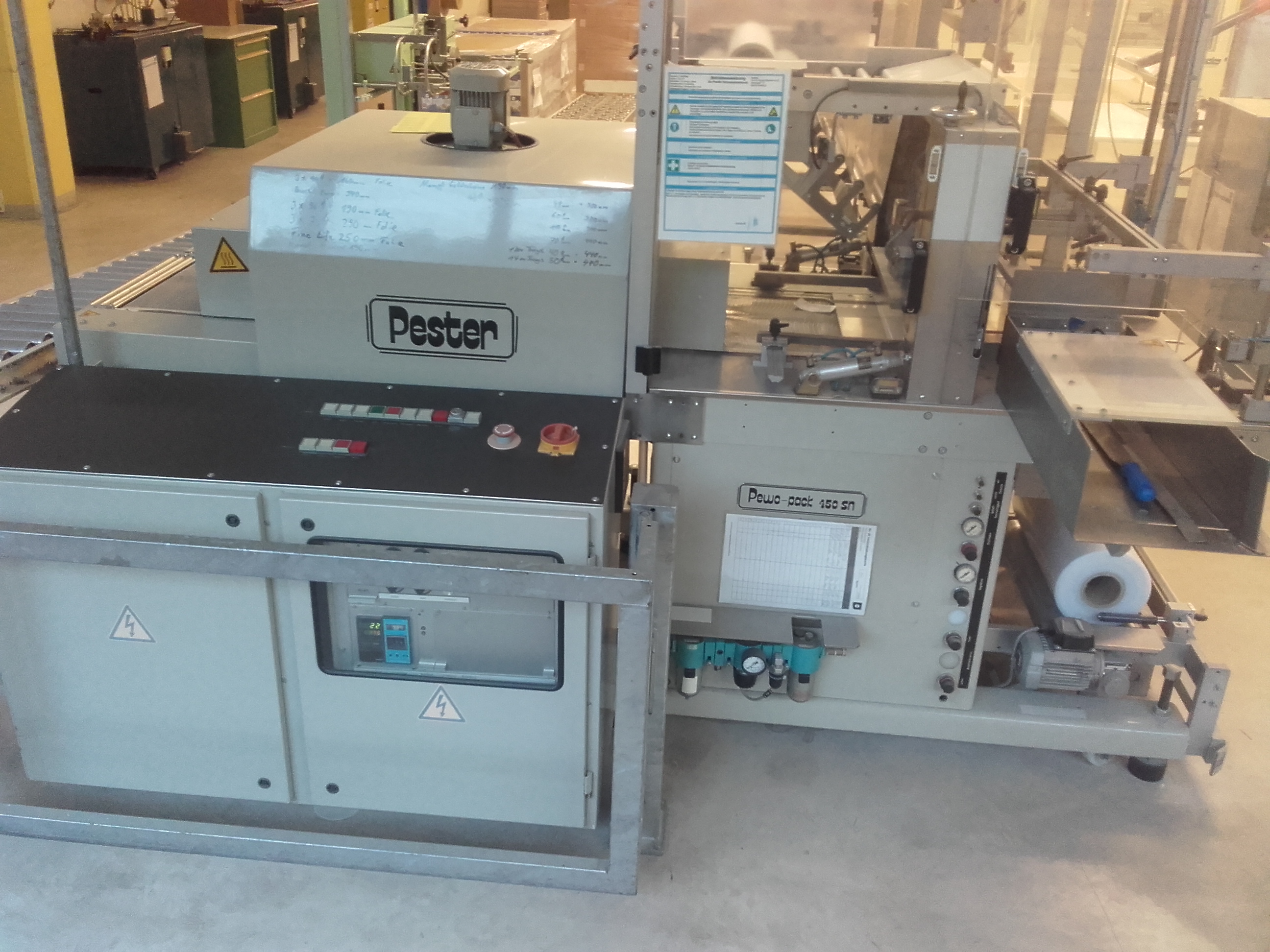 Pester PEWO-Pack 450SN Bundler/ Encelofanadora para cajas plegables, con apilador y tunel de retracción PEWO-therm II con una apertura de hasta 430 x 180 mm (An x Al), ancho de sellado de máx. 450 mm, ancho de inserción de max. 540 mm, longitud de inserción max. 300 mm, altura de inserción máx. 250 mm, entrada rectangular (longitud aprox. 1600 mm x ancho de la cinta aprox. 150 mm), adecuada para los tipos de película PE, PP y PP estirados, anchura de la película de 30 mm a 450 mm, diámetro máx. del rollo de pelicula de 300 mm, diámetro del núcleo del rollo 70/76 mm, capacidad de hasta 24 ciclos por minuto, peso neto de la máquina aproximadamente 380 kg.