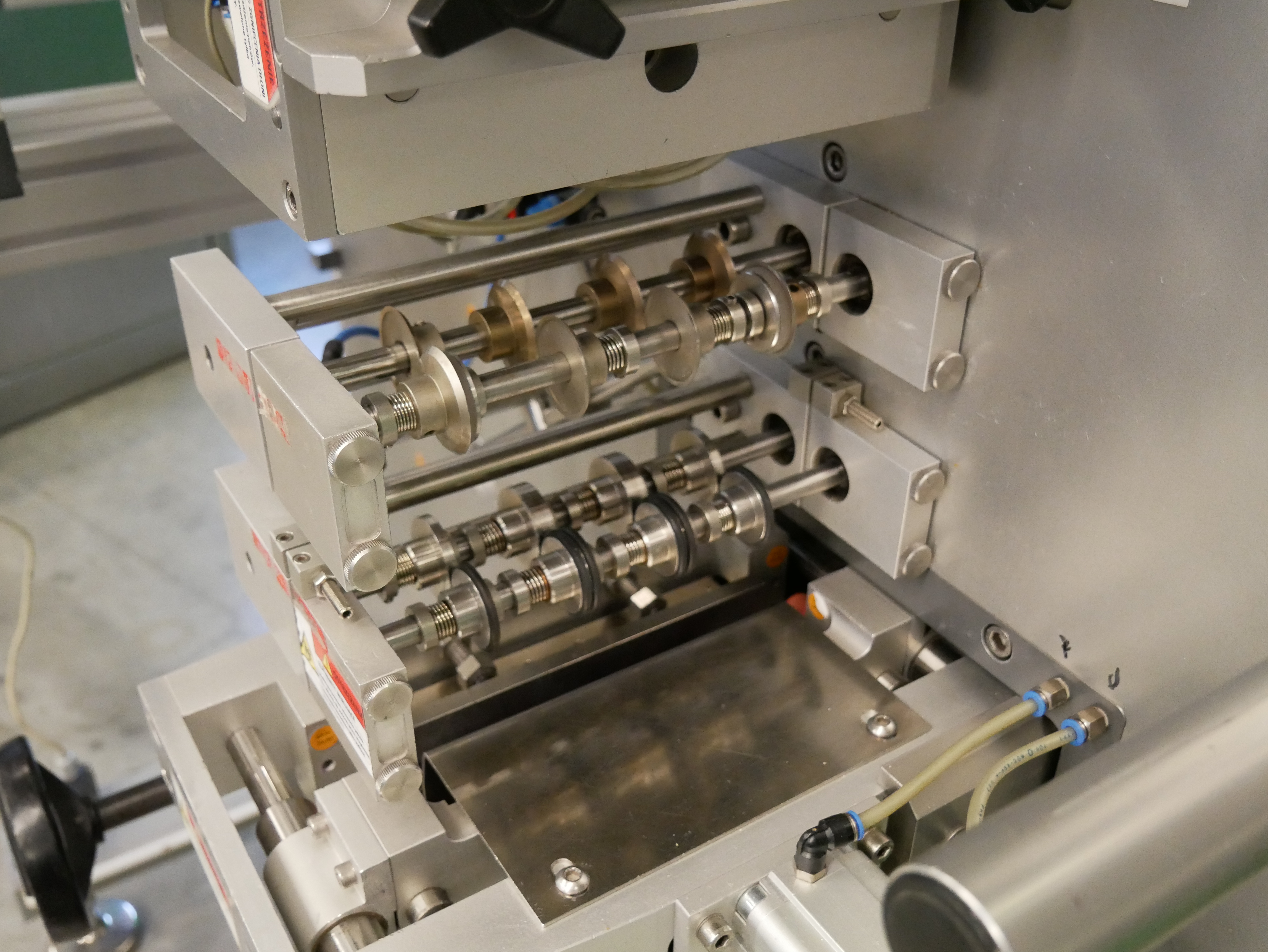 Romaco-Siebler HM1/160 Envasadora vertical de strips termoselladas de cuatro bordes para comprimidos, de 3 pistas, ancho máximo de película 170 mm, incluye piezas de formato para tabletas con dimensiones de 7,2 x 5,6 x 17,5 mm y 11,4 x 6, 31/WR8. 5, diámetro del núcleo del rollo de película 76 mm, diámetro máximo del rollo de película 450 mm, con Siemens SIMATIC S7-300, en muy buen estado de operación con aprox. sólo 1600 horas de funcionamiento.