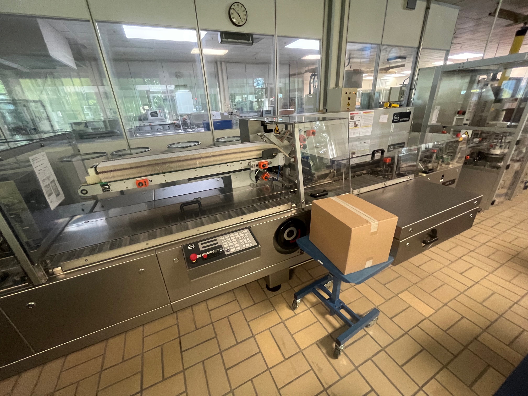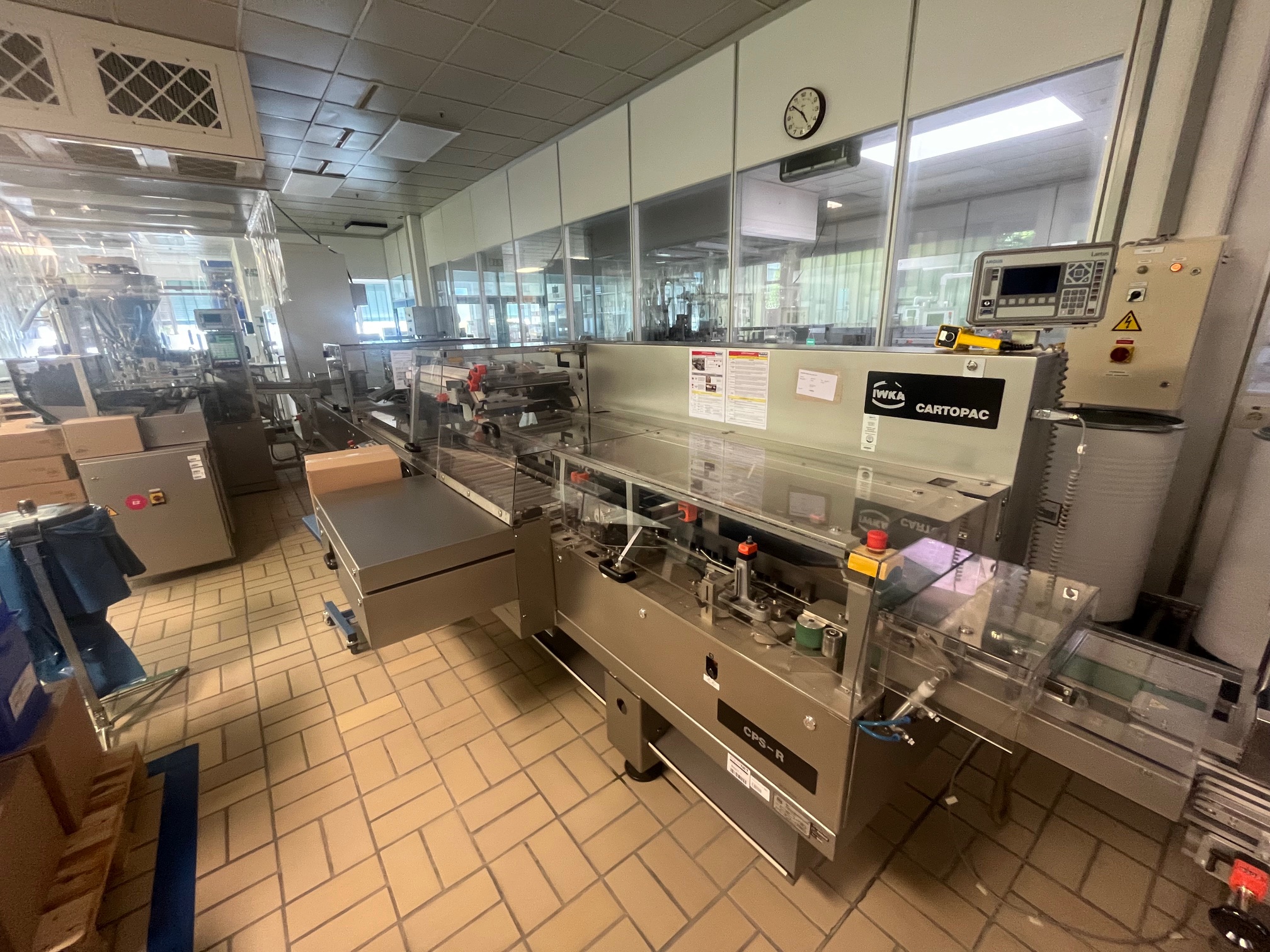 IWKA CPS-R estuchadora horizontal de operación continua, rango de formatos de cajas plegables: A (ancho): 16 – 80 mm, B (alto): 25 – 125 mm, C (profundidad): 55 – 180 mm, con GUK plegadora de folletos desde pila, Laetus Argus lector de códigos de cajas plegables y folletos, cierre con solapas desplazadas, capacidad de hasta 300 cajas plegables/ min.,