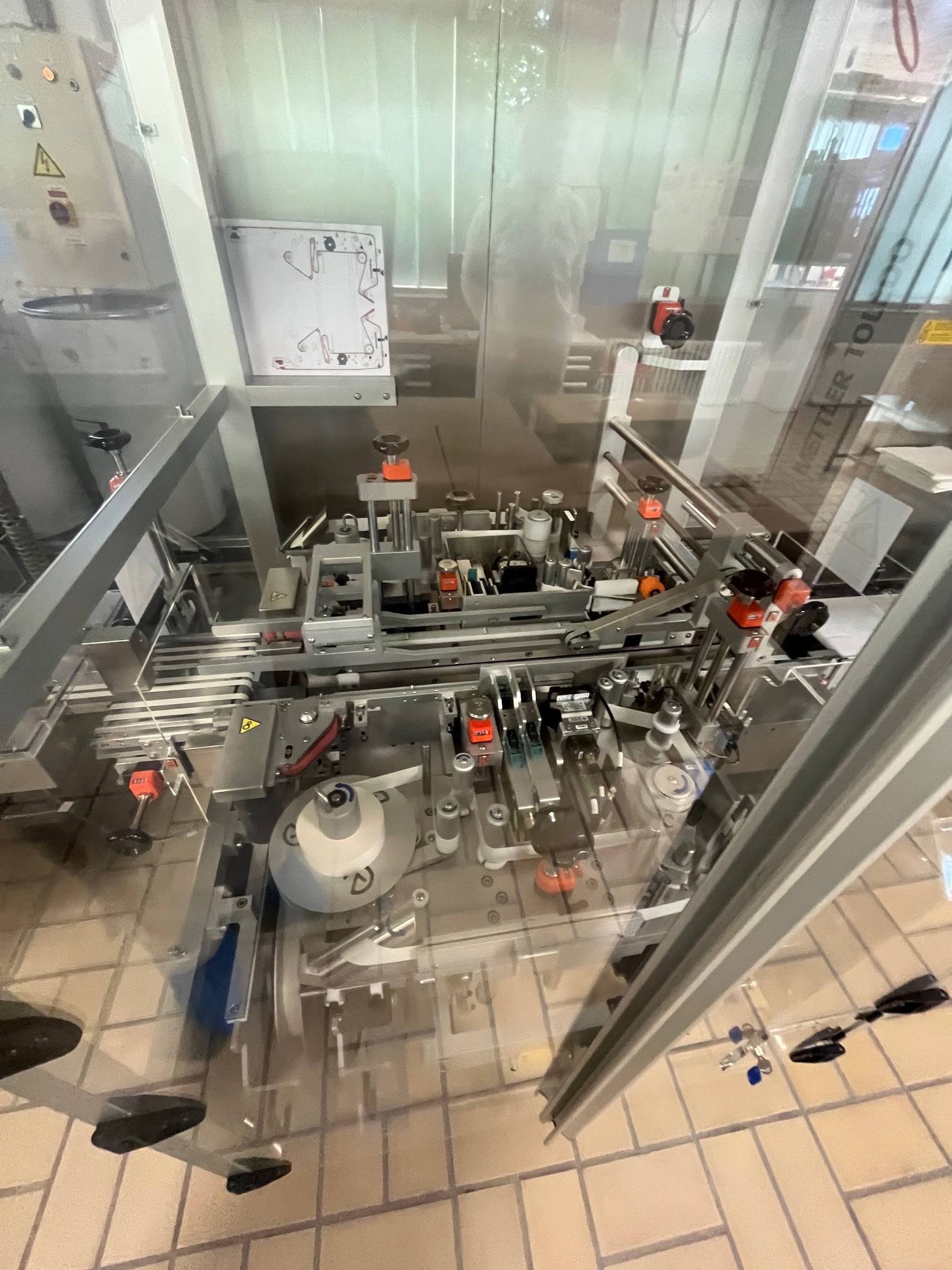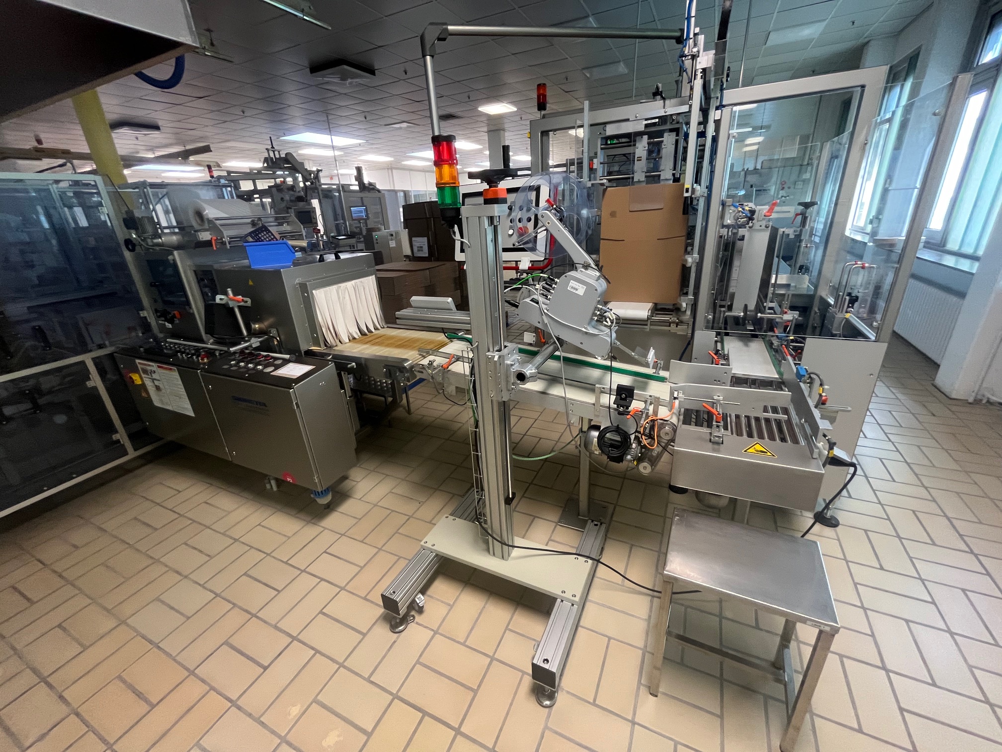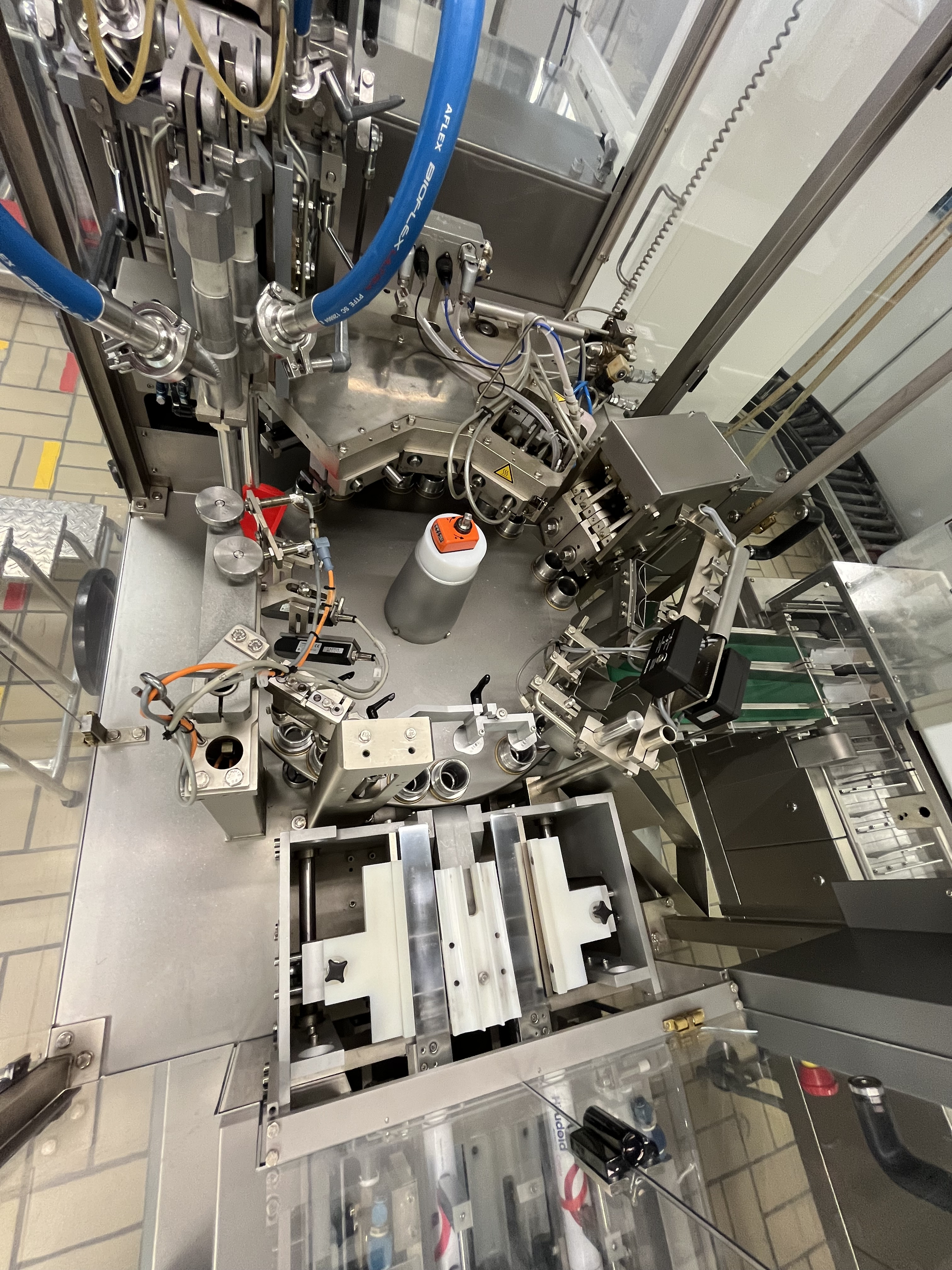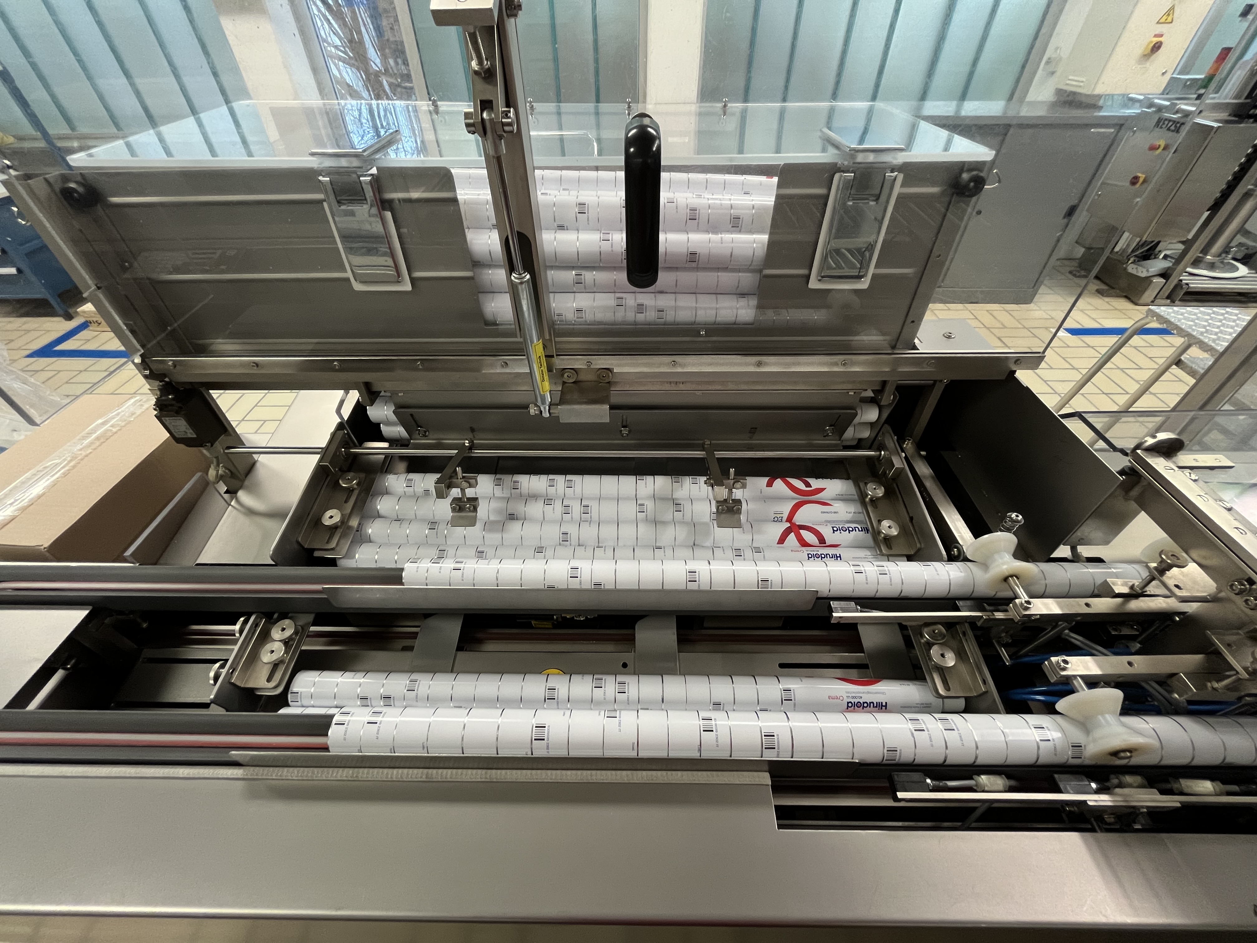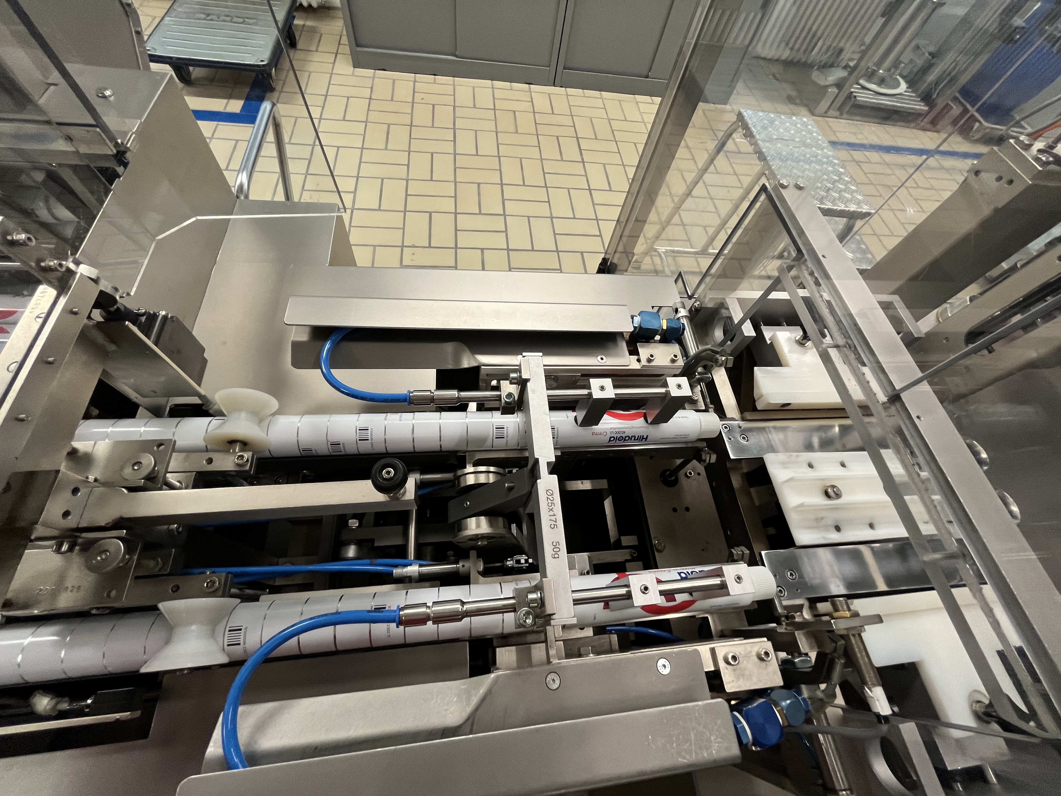 La línea se usaba para el envasado de tubos cónicos de aluminio con una capacidad de hasta 180 tubos por minuto,