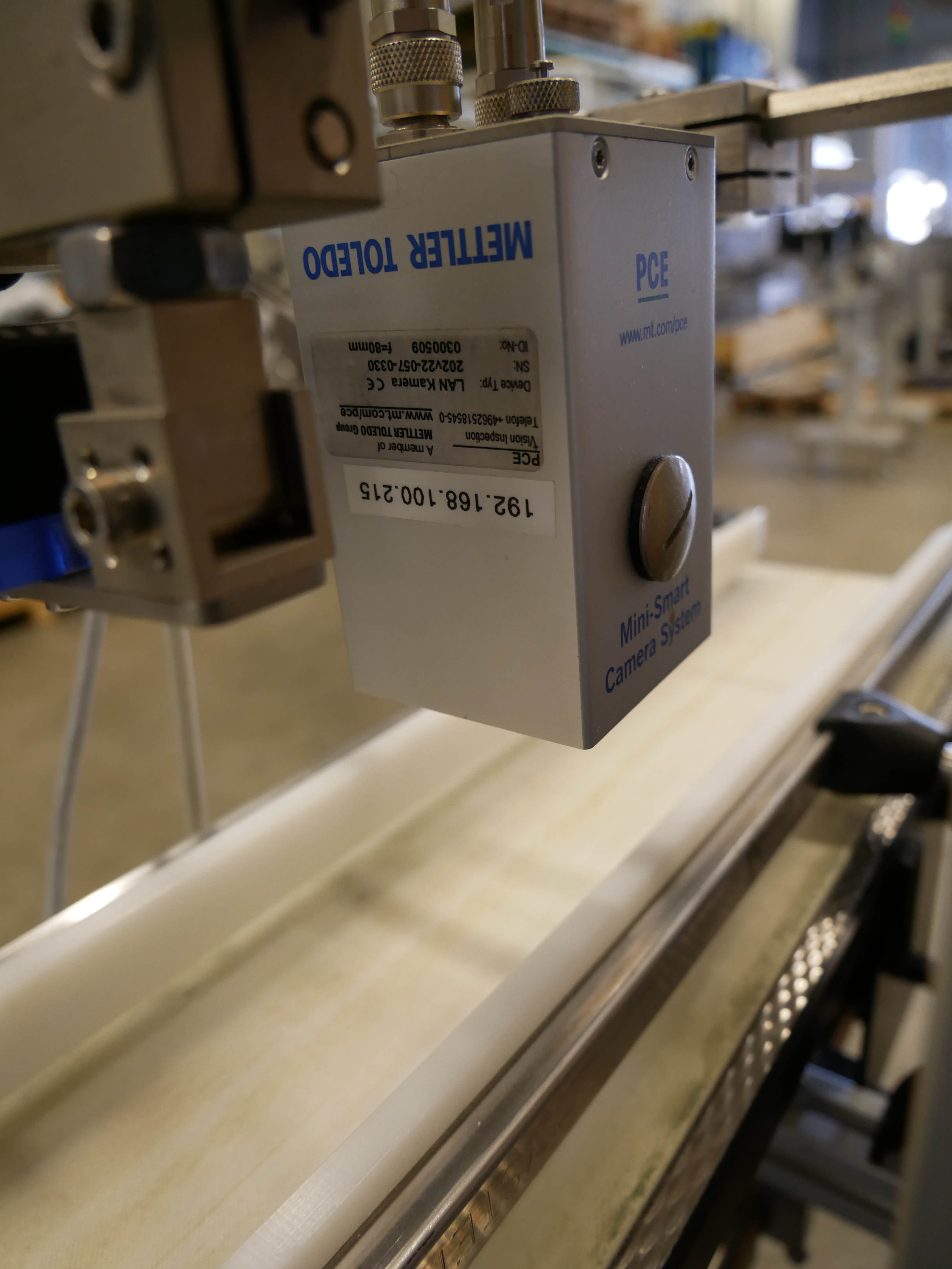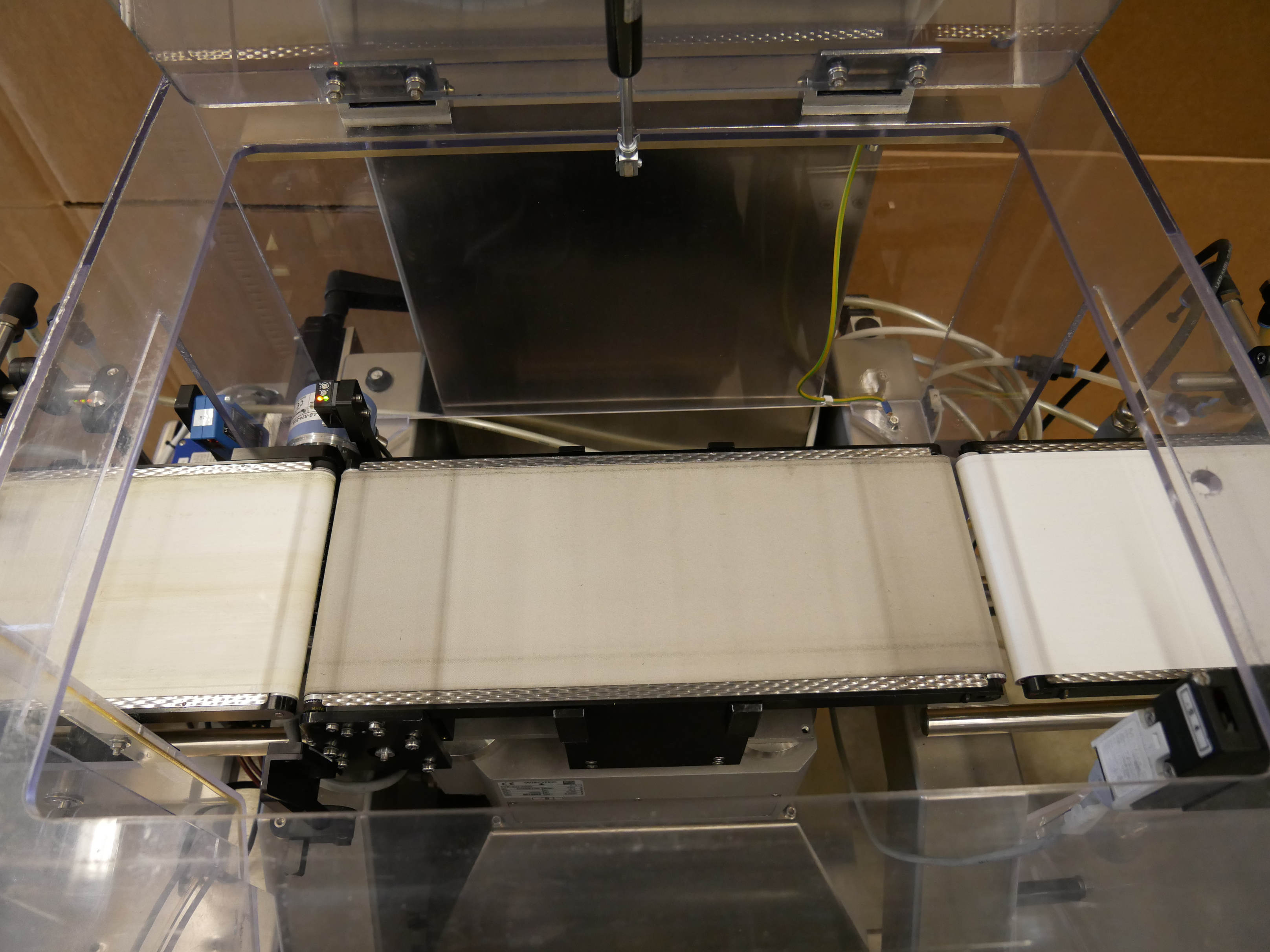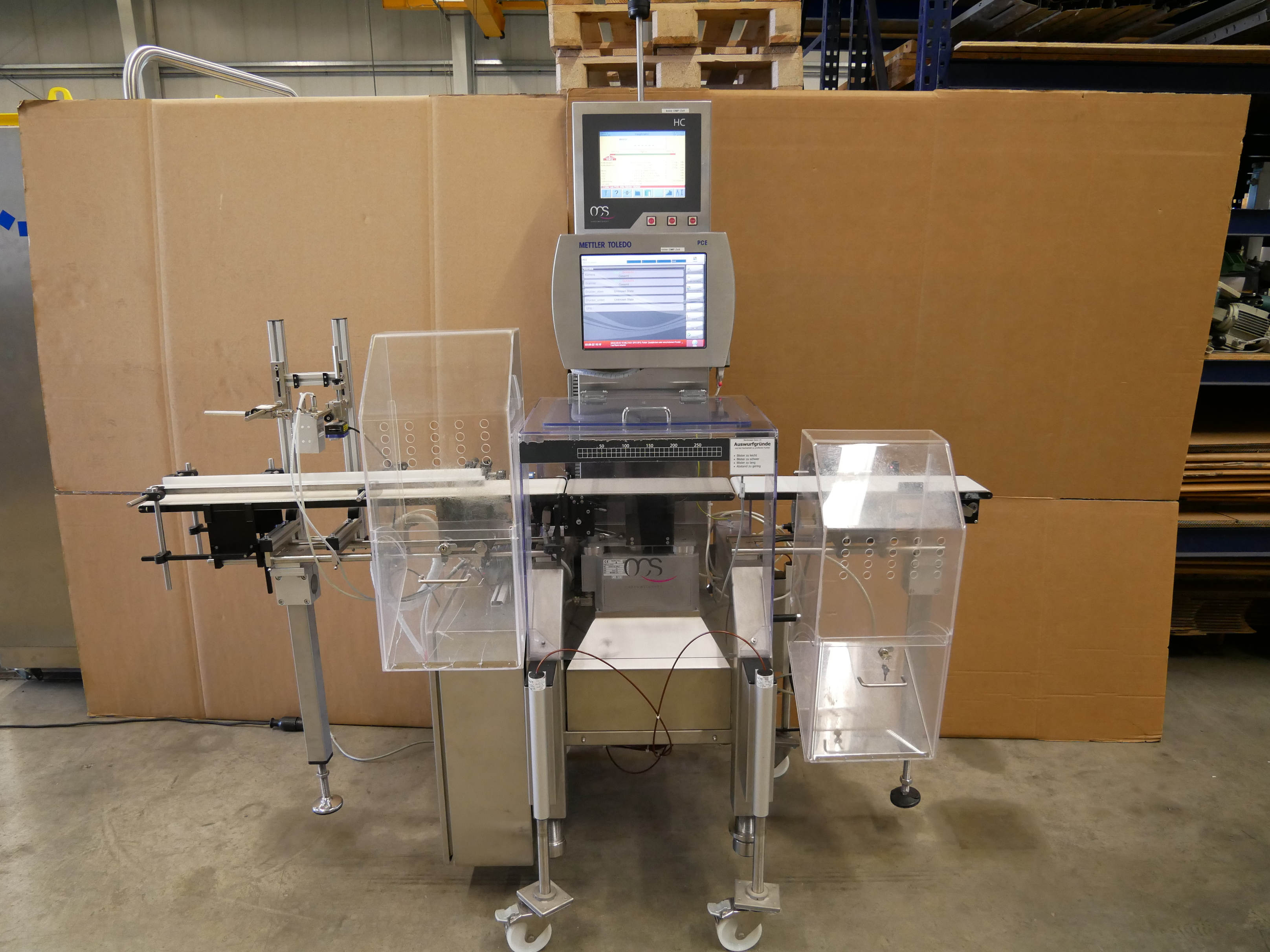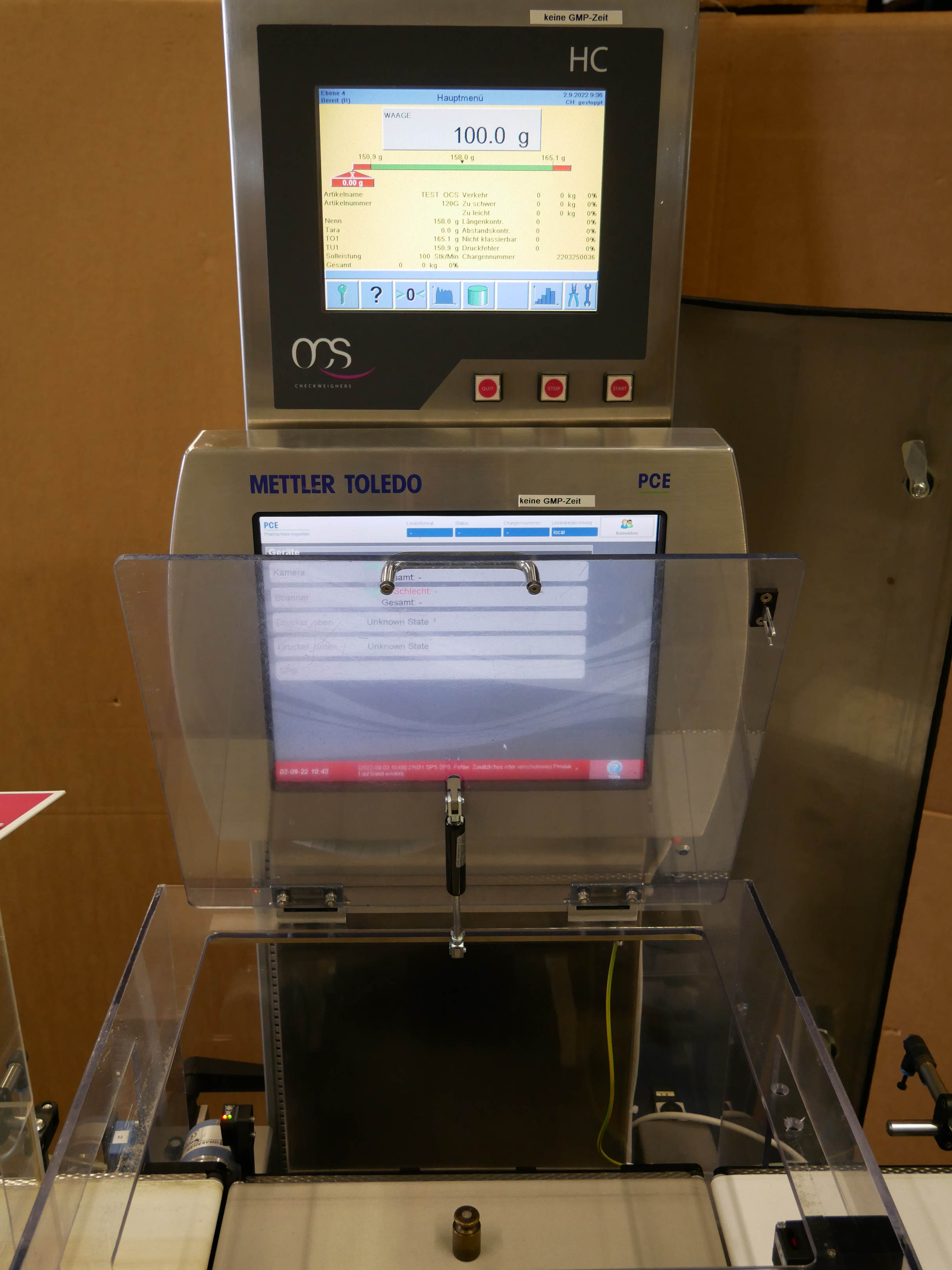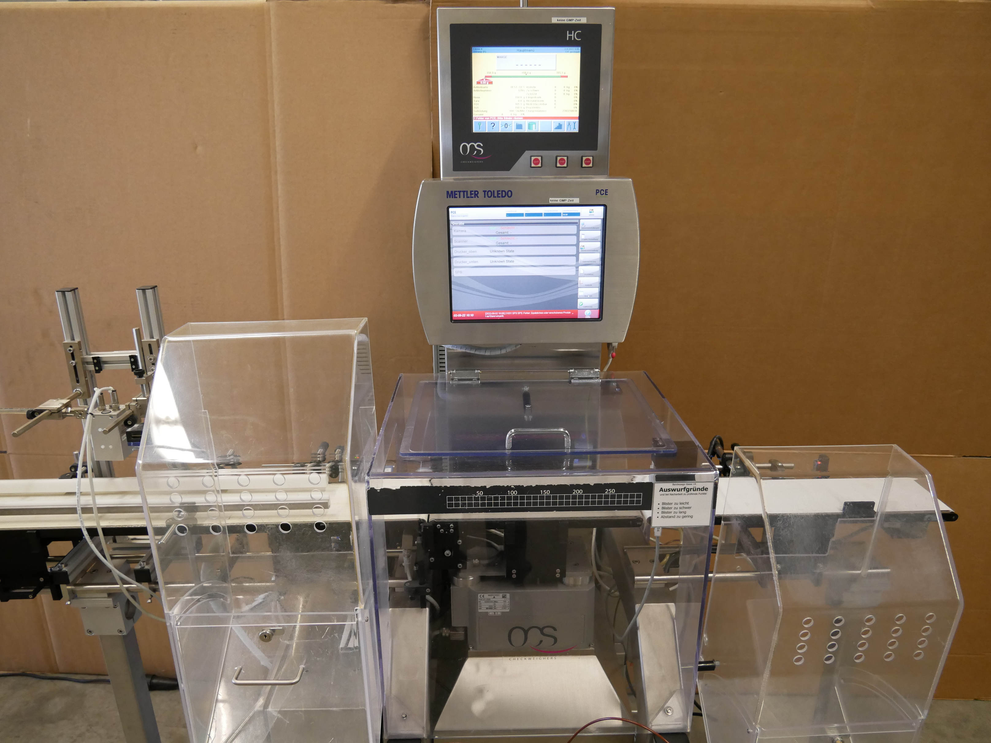 OCS modelo HC Controladora de peso, con célula de pesaje tipo EC 2000, con unidad de rechazo y expulsión de productos no aceptados con recipiente colector, rango de pesaje hasta 750 g, valor de calibración e=0,1 g, grado de precisión +/-0,1 g, ancho de cinta de aprox. 150 mm, largo de cinta de entrada de aprox. 990 mm, largo de cinta de salida de aprox. 580mm y largo de cinta de pesaje 380 mm, dirección de funcionamiento de izquierda a derecha, capacidad max. 300 pesadas por minuto, conexión eléctrica 230 V, 50/60 Hz, 0,8 KVA, dimensiones de la máquina aprox. 2000 x 900 mm (LxAn), altura de la máquina aprox. 2300 mm, peso neto de la máquina aprox. 170 kg, incluida cámara PCE Mini-Smart LAN para control de impresión (impresora no incluida) y escáner láser de trama para leer códigos farmacéuticos, códigos de barras, etc.