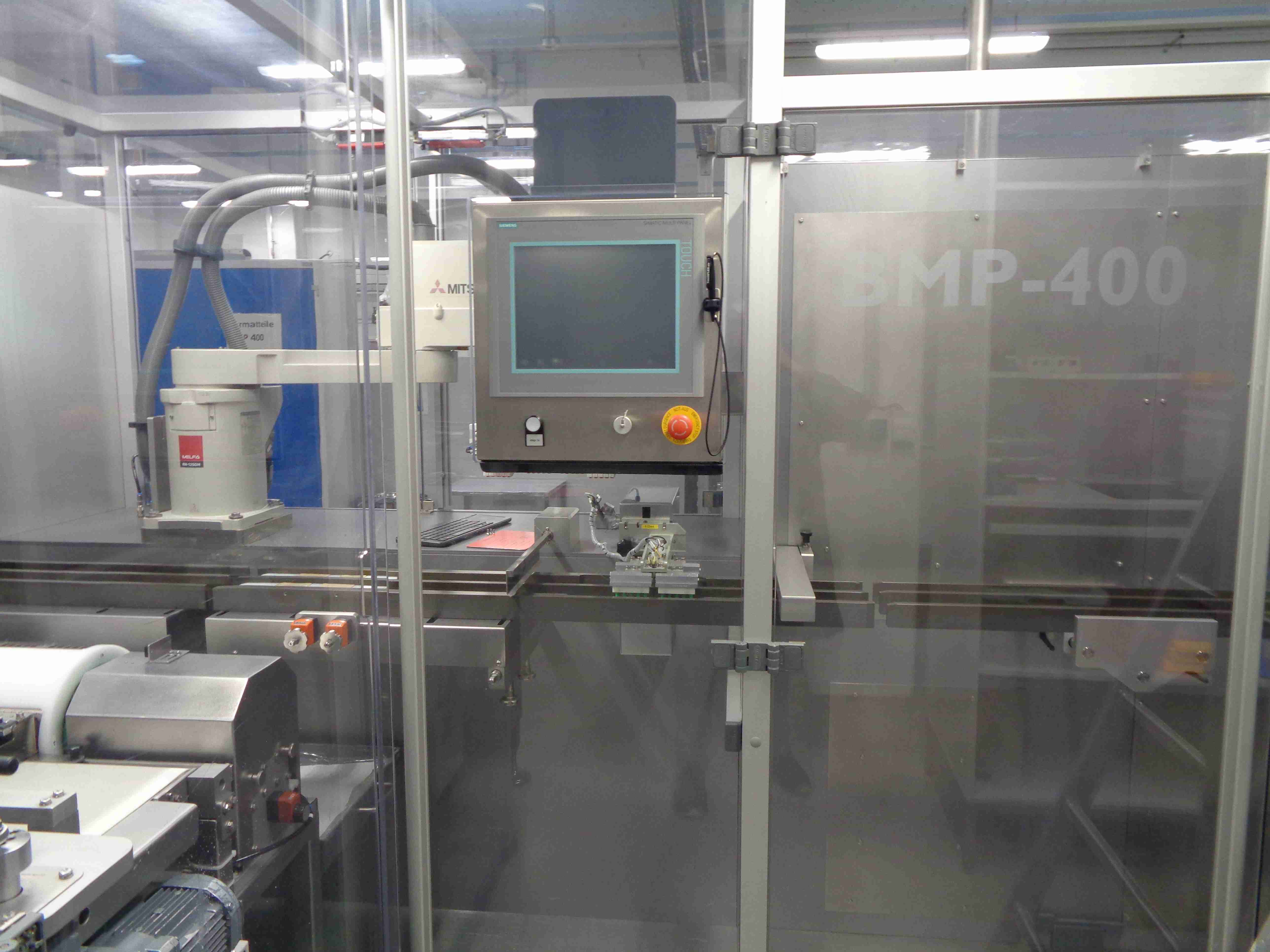 Heino Ilsemann BMP-400 Emblistadora para ampollas en “squeeze packs” sin película protectora, con alimentación automática de ampollas, profundidad máxima de formación 35 mm, ancho máximo de película 270 mm, formato máximo de blister 250 x 180 mm, capacidad máxima de troquelado 40 ciclos/min., producción de hasta 320 blíster/min.