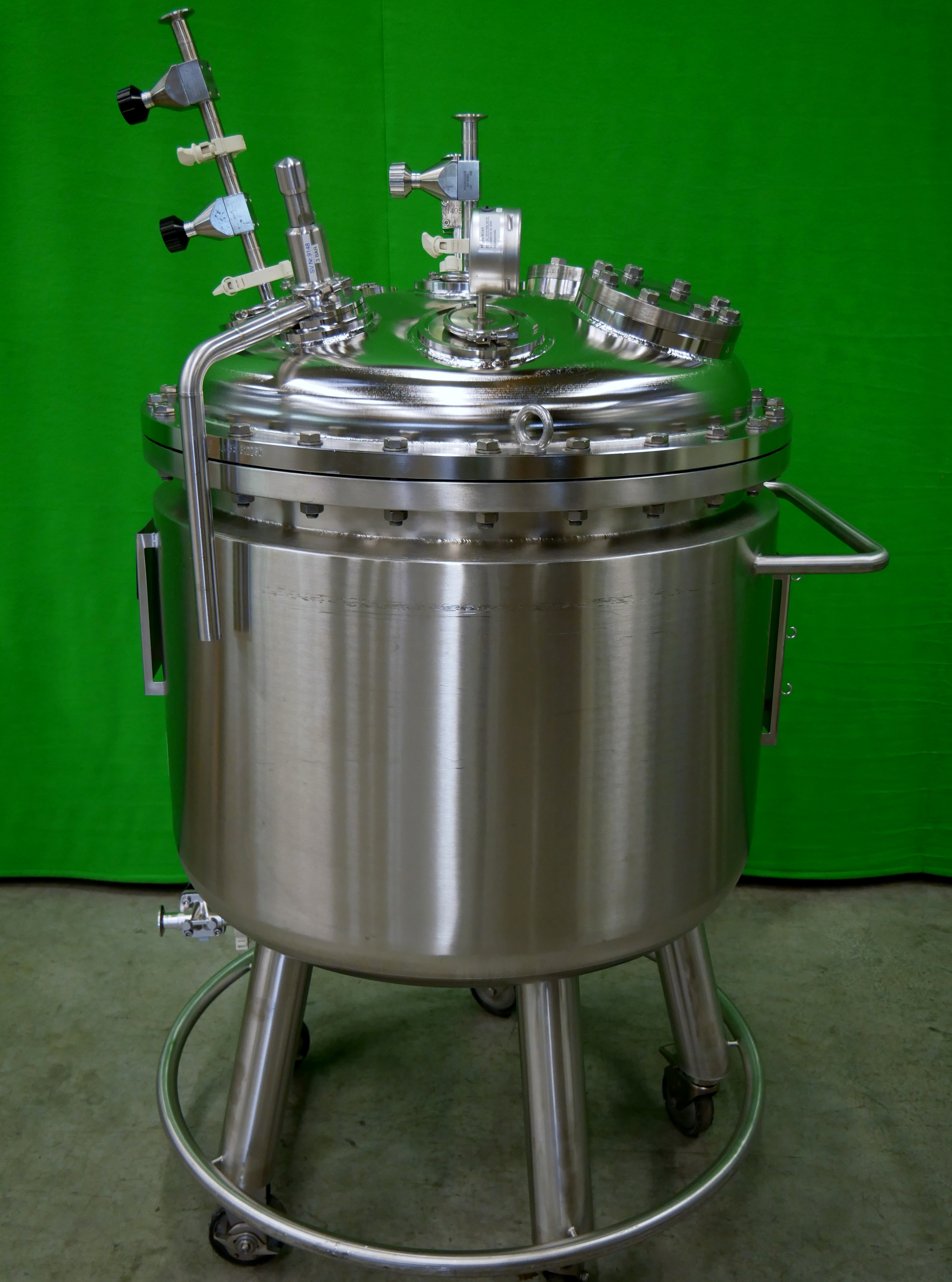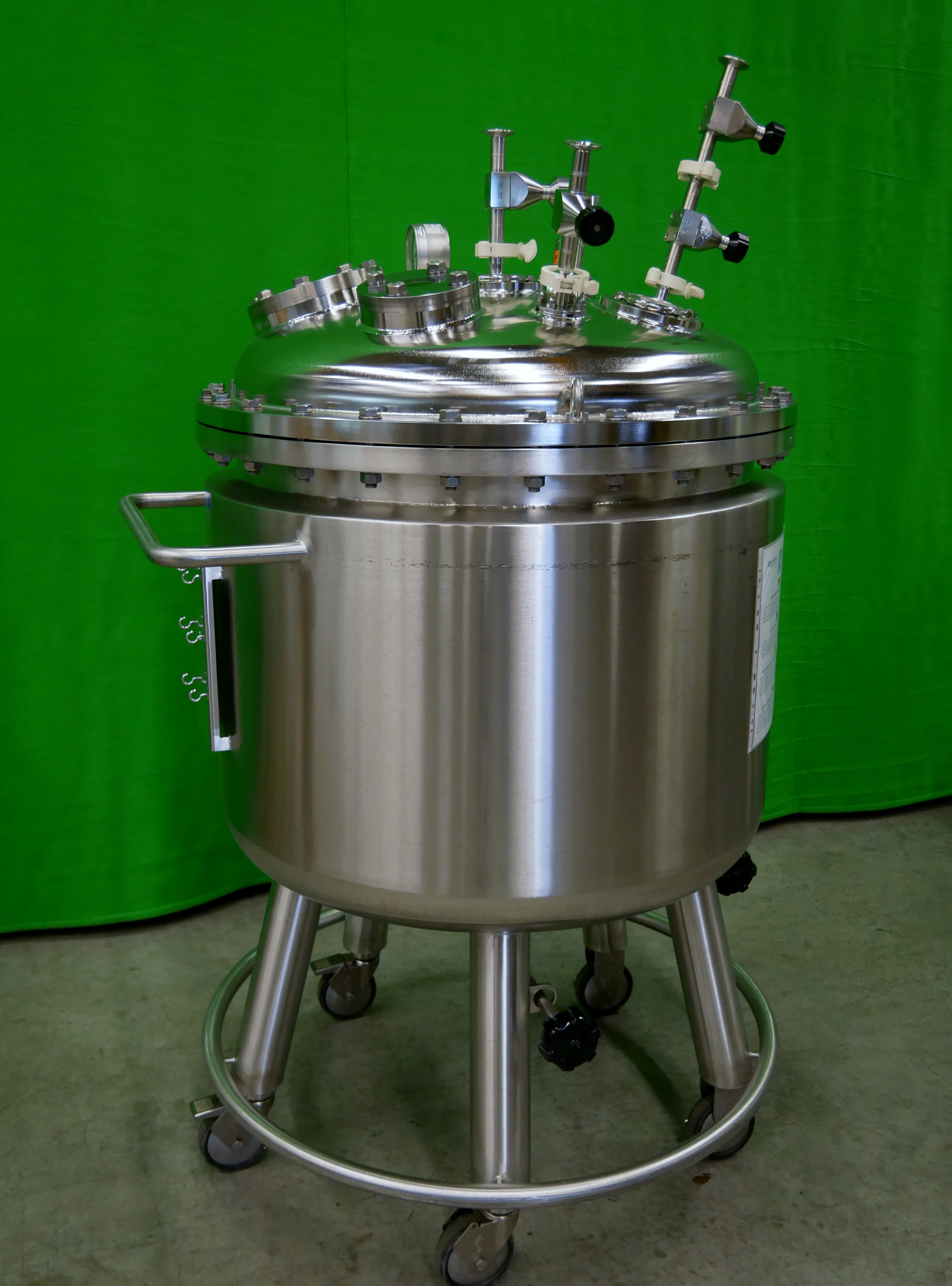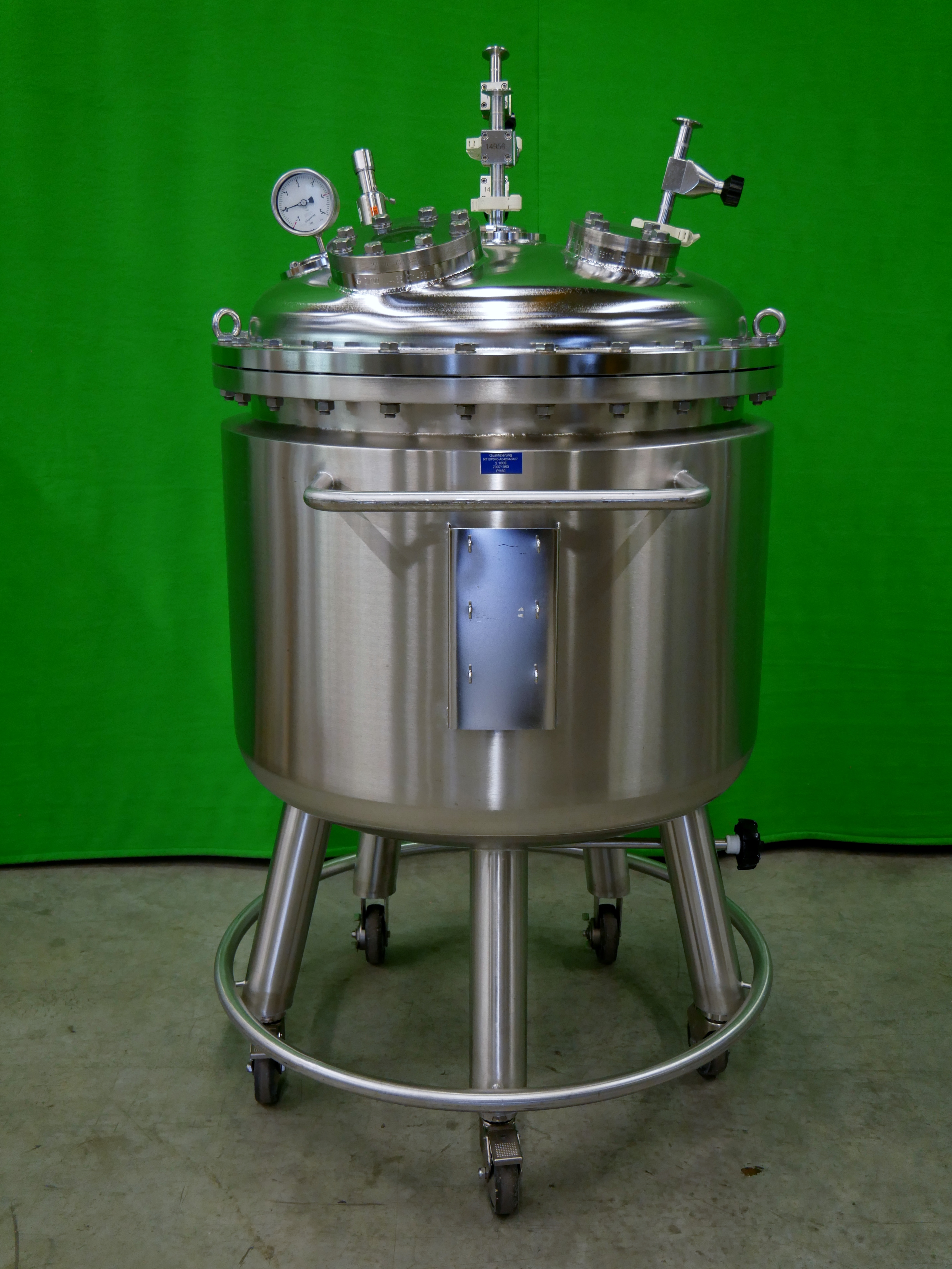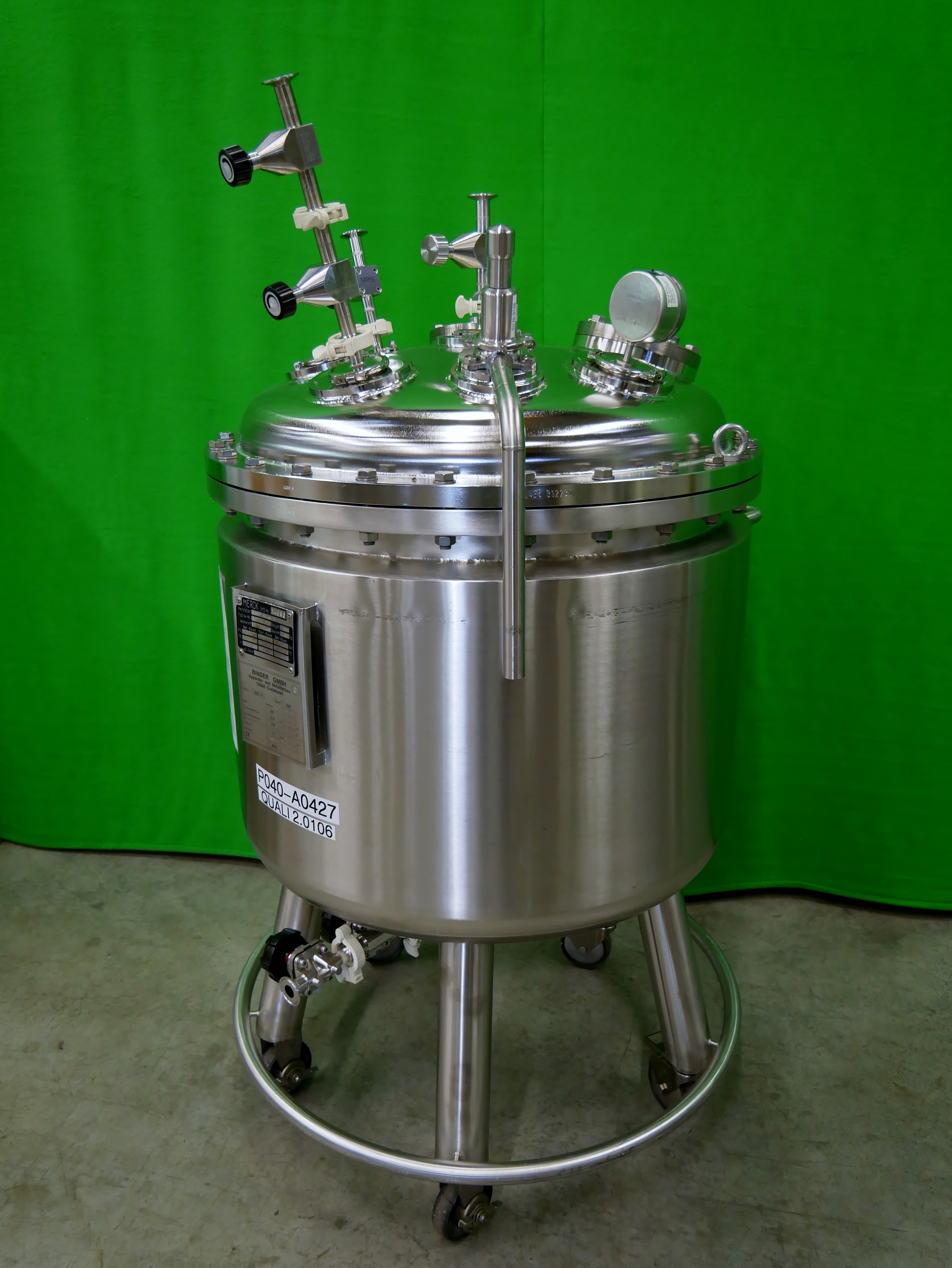 Binder Contenedor móvil de acero inoxidable con camisa de aislamiento, con capacidad de 335 l, presión permitida de funcionamiento dentro del recipiente -1/4 bar, temperatura permitida de funcionamiento máx. 150 ºC, presión de prueba 7,1 bar, 2 mirillas colocadas en la tapa del contenedor (con los diámetros de 50 y 90 mm), incluye manómetro de presión y diferentes conexiones en tapa para entrada de producto, ventilación y purga, para reserva y para el sistema CIP con bolas de pulverización con área de pulverización de 360º, salida inferior, diámetro interior del contenedor de aprox. 800mm, diámetro exterior de aprox. 900mm, altura total del contenedor de aprox. 1800mm, peso neto de aprox. 310 kg, montado sobre ruedas (8 unidades disponibles)