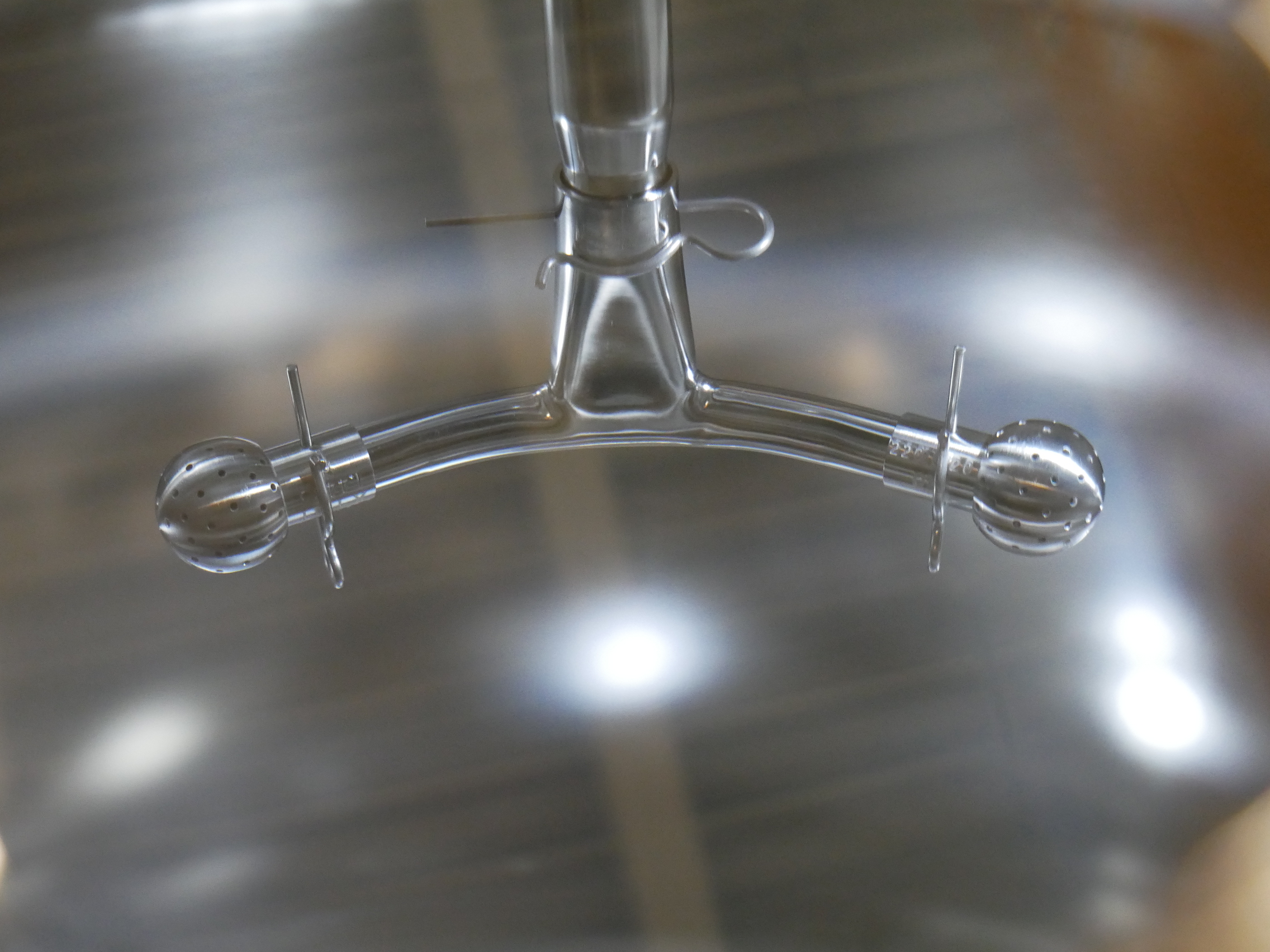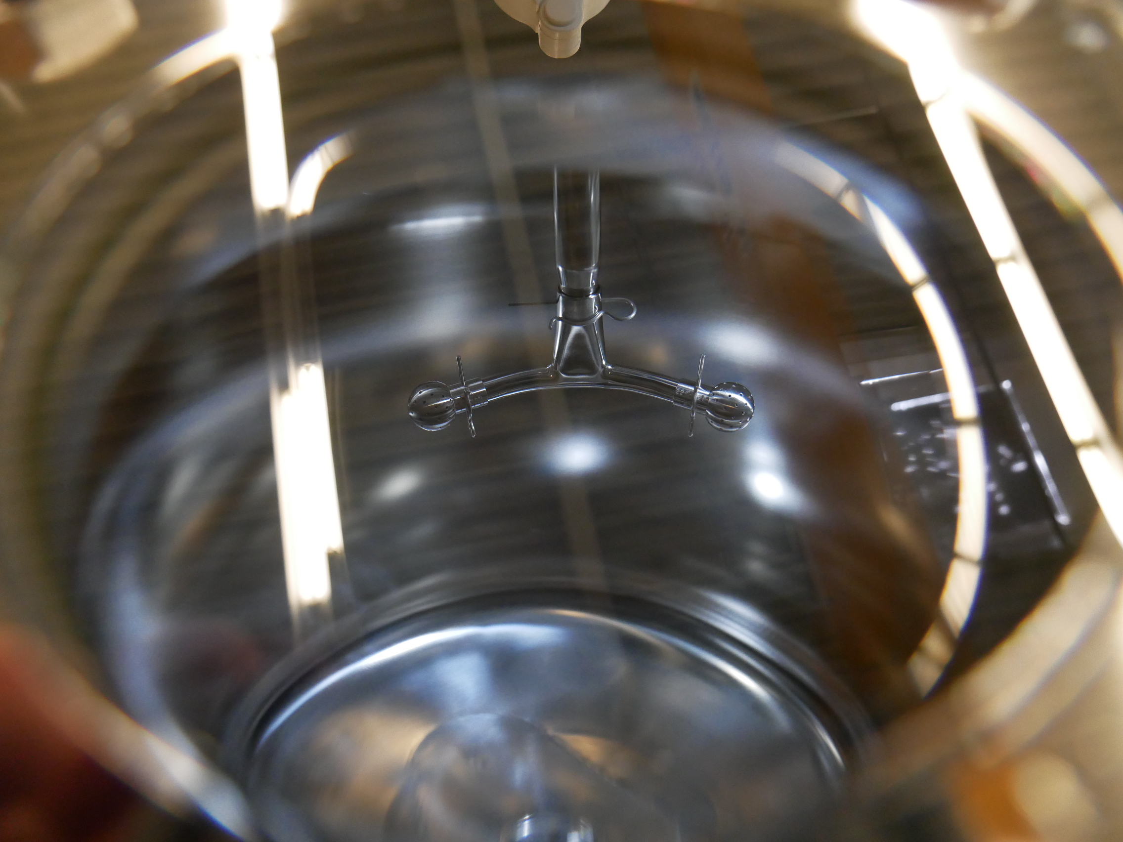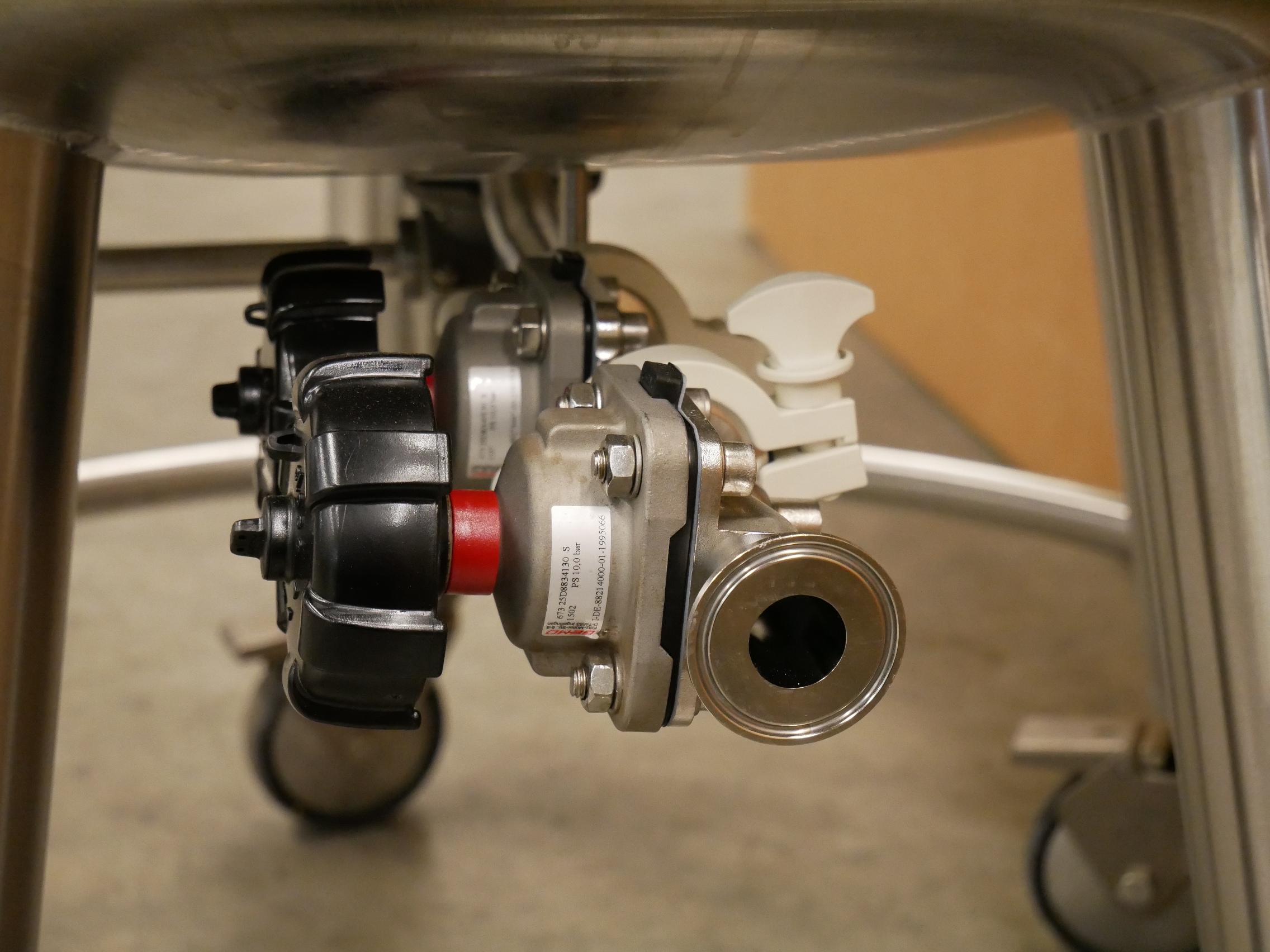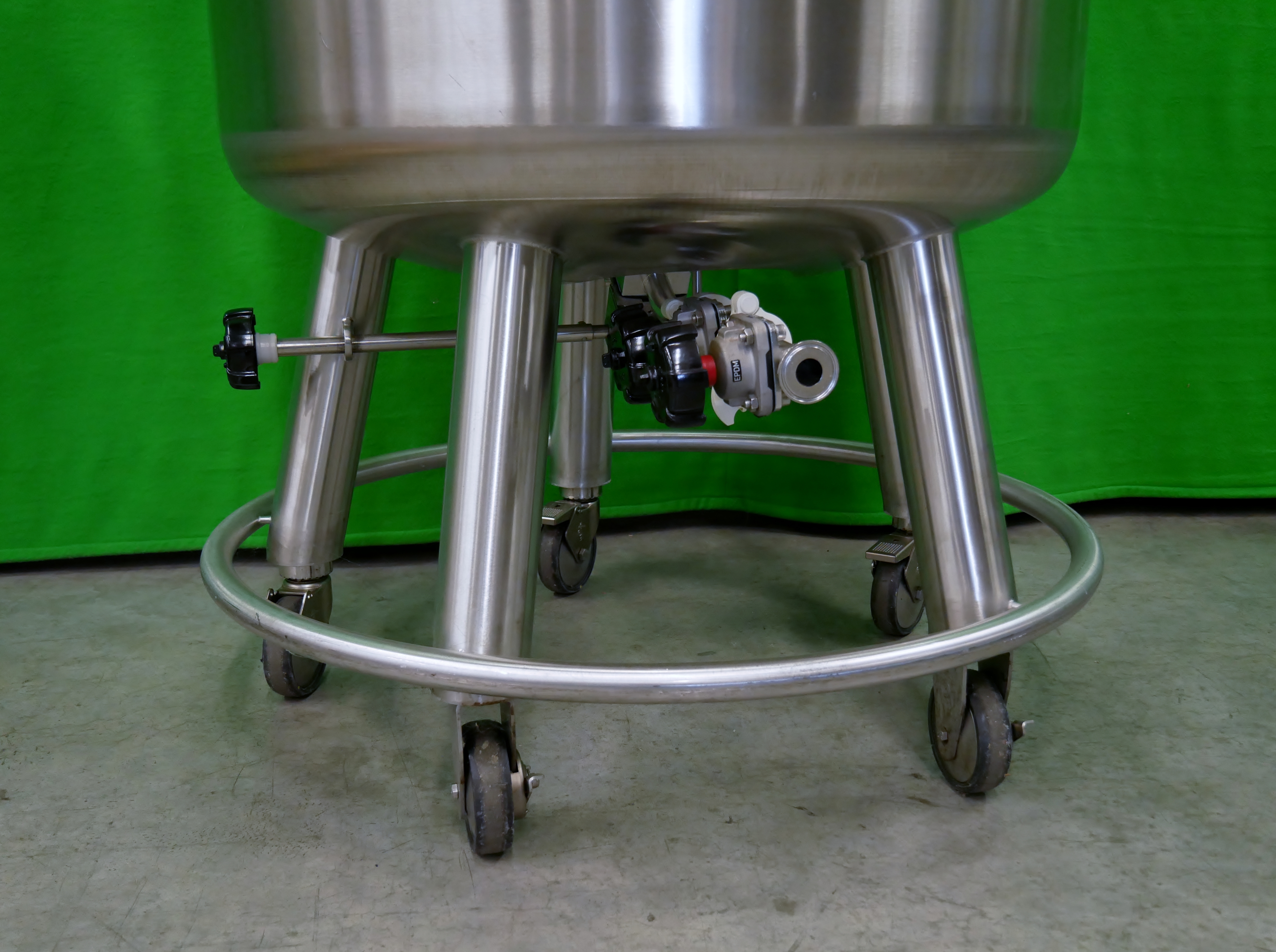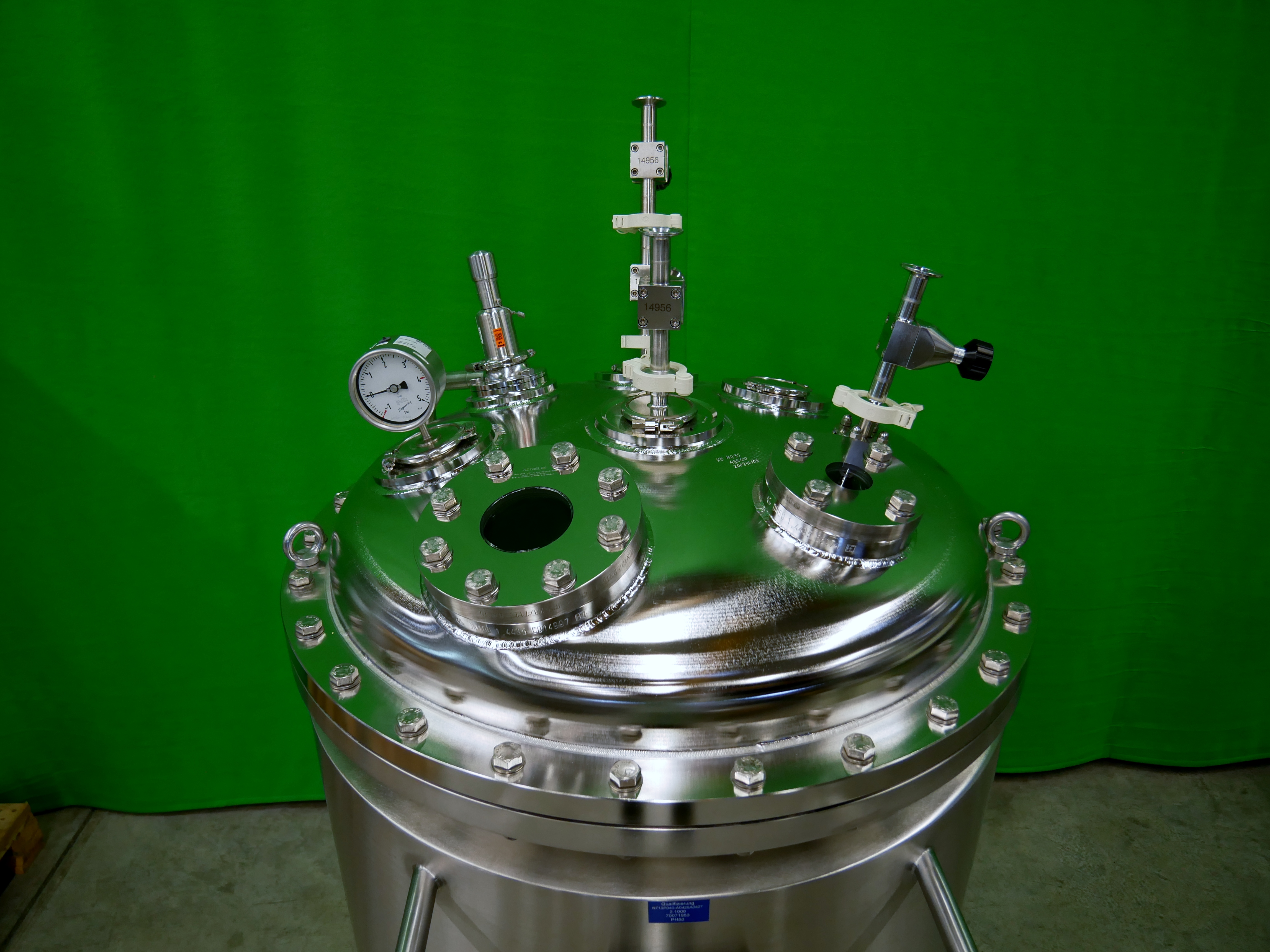 Binder Contenedor móvil de acero inoxidable con camisa de aislamiento, con capacidad de 335 l, presión permitida de funcionamiento dentro del recipiente -1/4 bar, temperatura permitida de funcionamiento máx. 150 ºC, presión de prueba 7,1 bar, 2 mirillas colocadas en la tapa del contenedor (con los diámetros de 50 y 90 mm), incluye manómetro de presión y diferentes conexiones en tapa para entrada de producto, ventilación y purga, para reserva y para el sistema CIP con bolas de pulverización con área de pulverización de 360º, salida inferior, diámetro interior del contenedor de aprox. 800mm, diámetro exterior de aprox. 900mm, altura total del contenedor de aprox. 1800mm, peso neto de aprox. 310 kg, montado sobre ruedas (8 unidades disponibles)