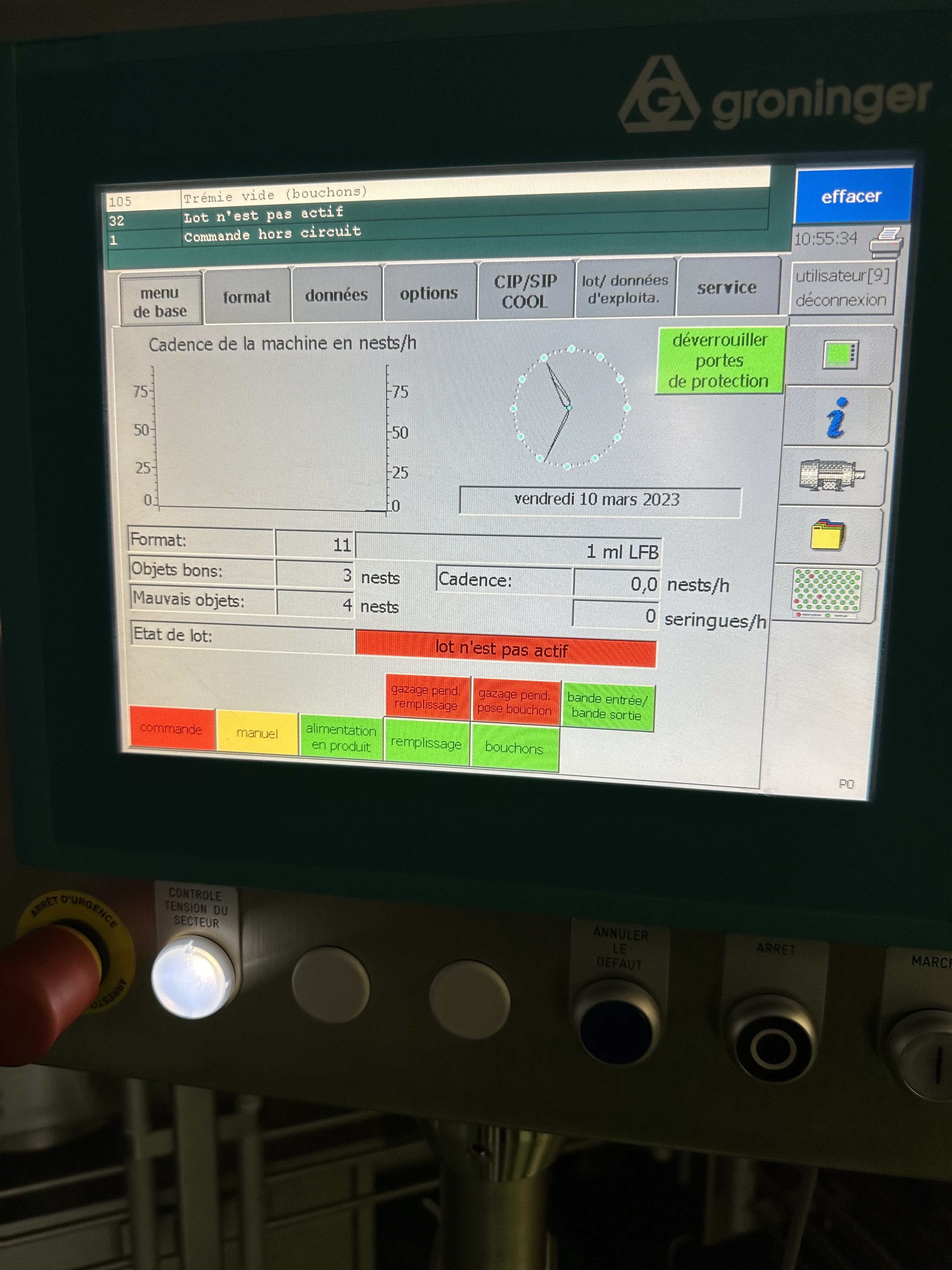Groninger Línea de producción para jeringas anidadas (RTU) compuesta por MWU 010 Sesembaladora de bolsas semiautomática, MWF 100 Máquina Delid/Deliner automática y DFVN 5000 máquina llenadora/ selladora (con sistema CIP/SIP, sistema RKP de llenado con recirculación, apto para suspensiones, etc.), capacidad de hasta 9.000 jeringas por hora, incluyendo las siguientes piezas de formato para el procesamiento de jeringas:
