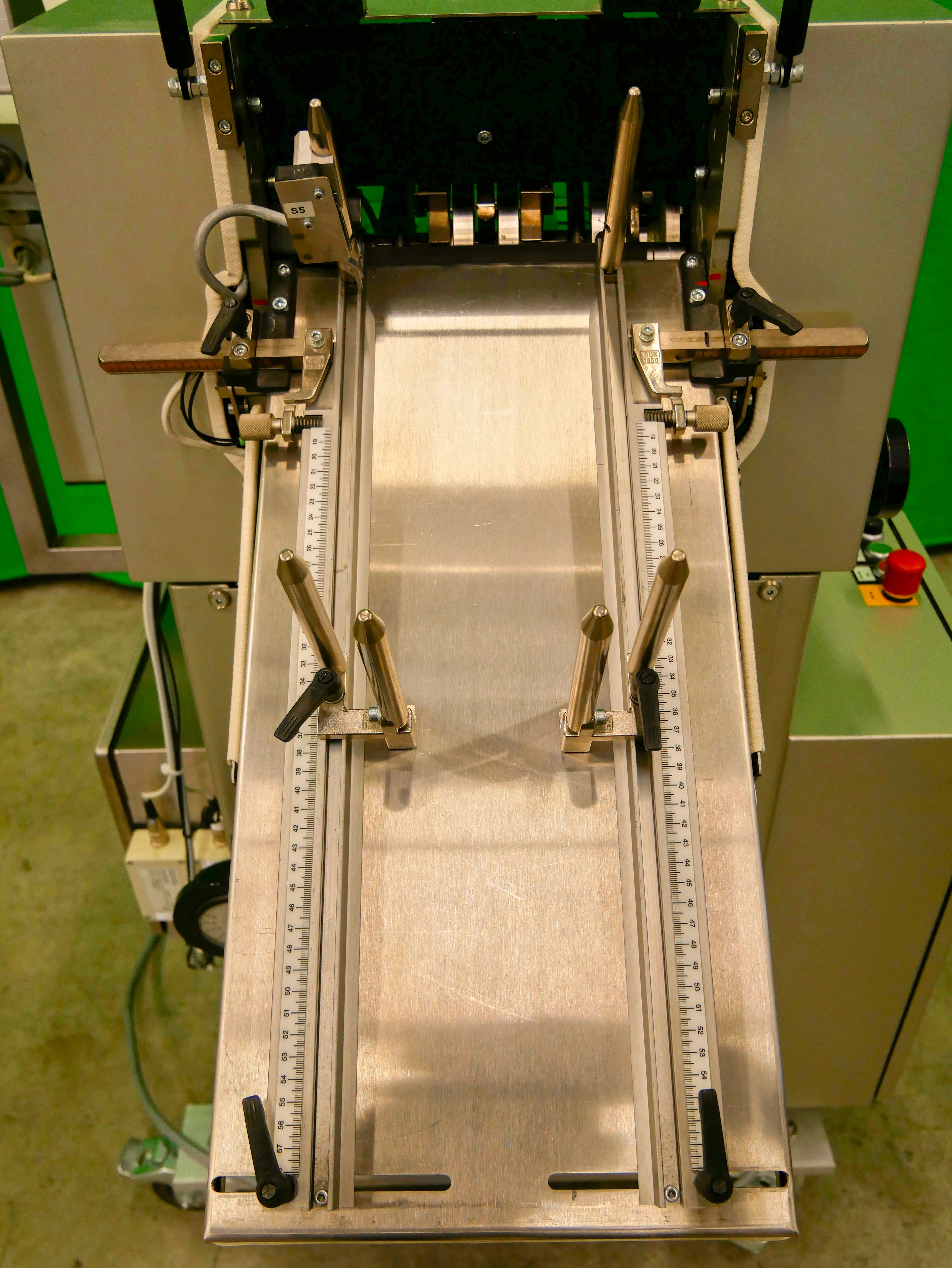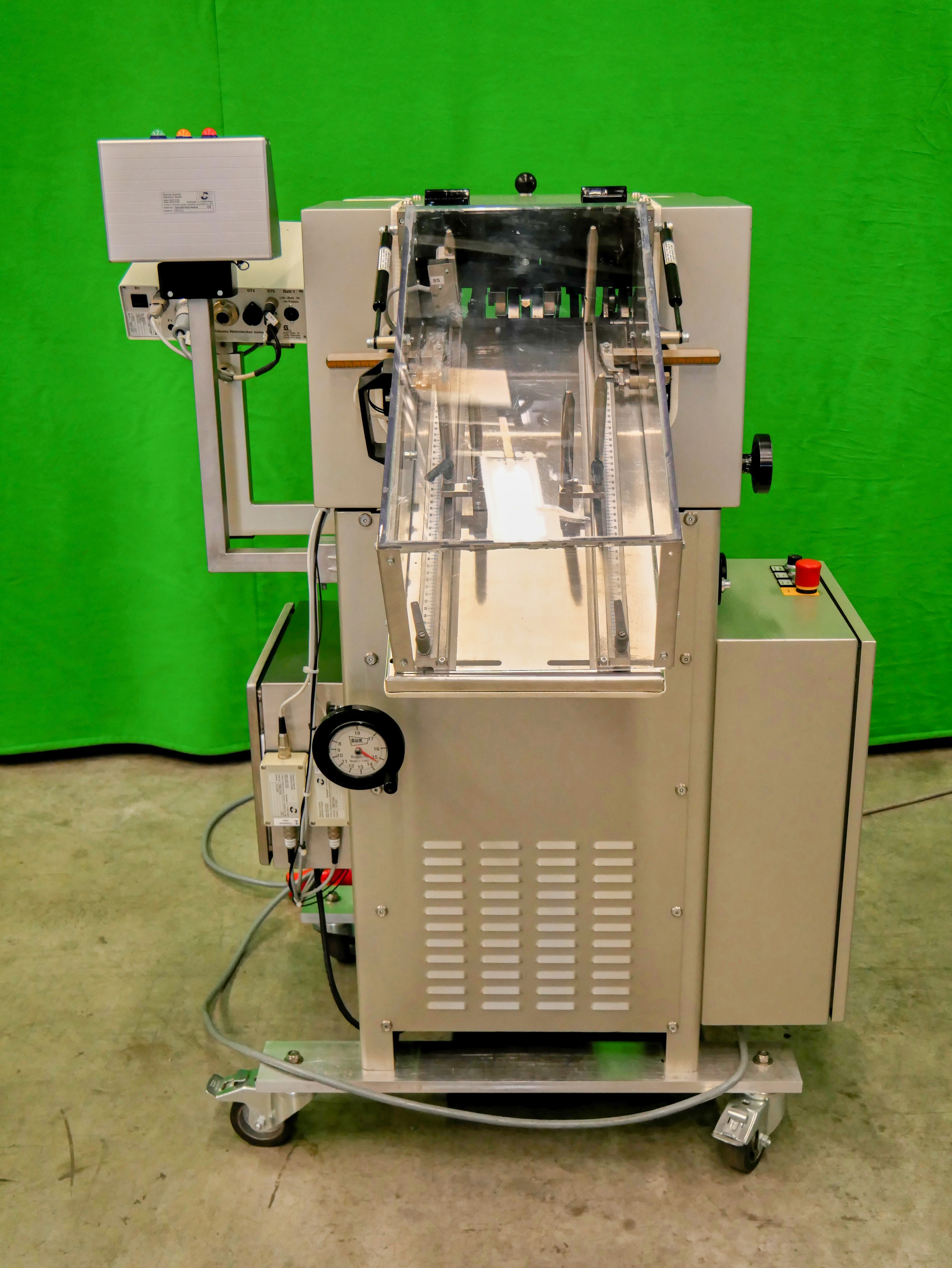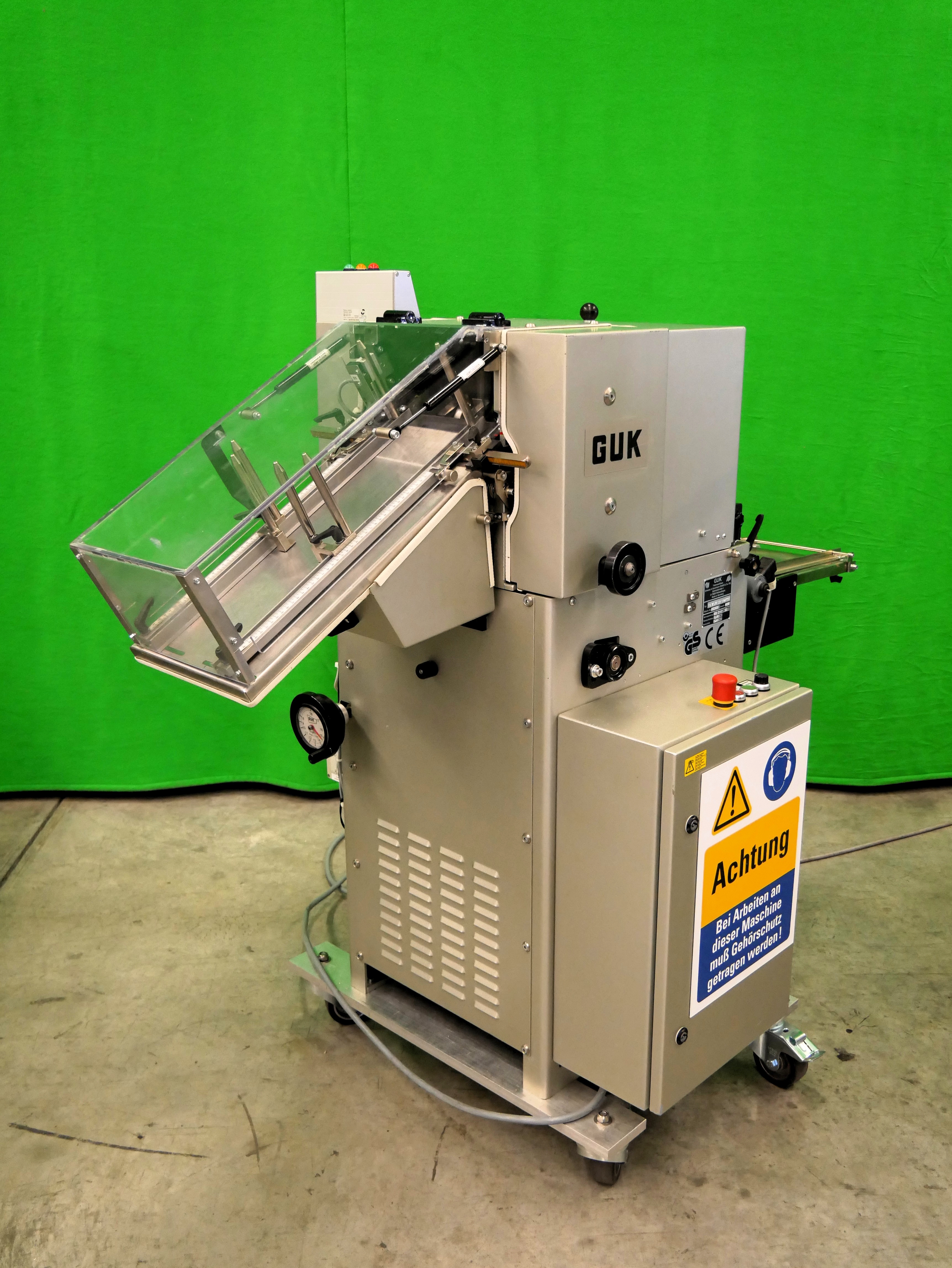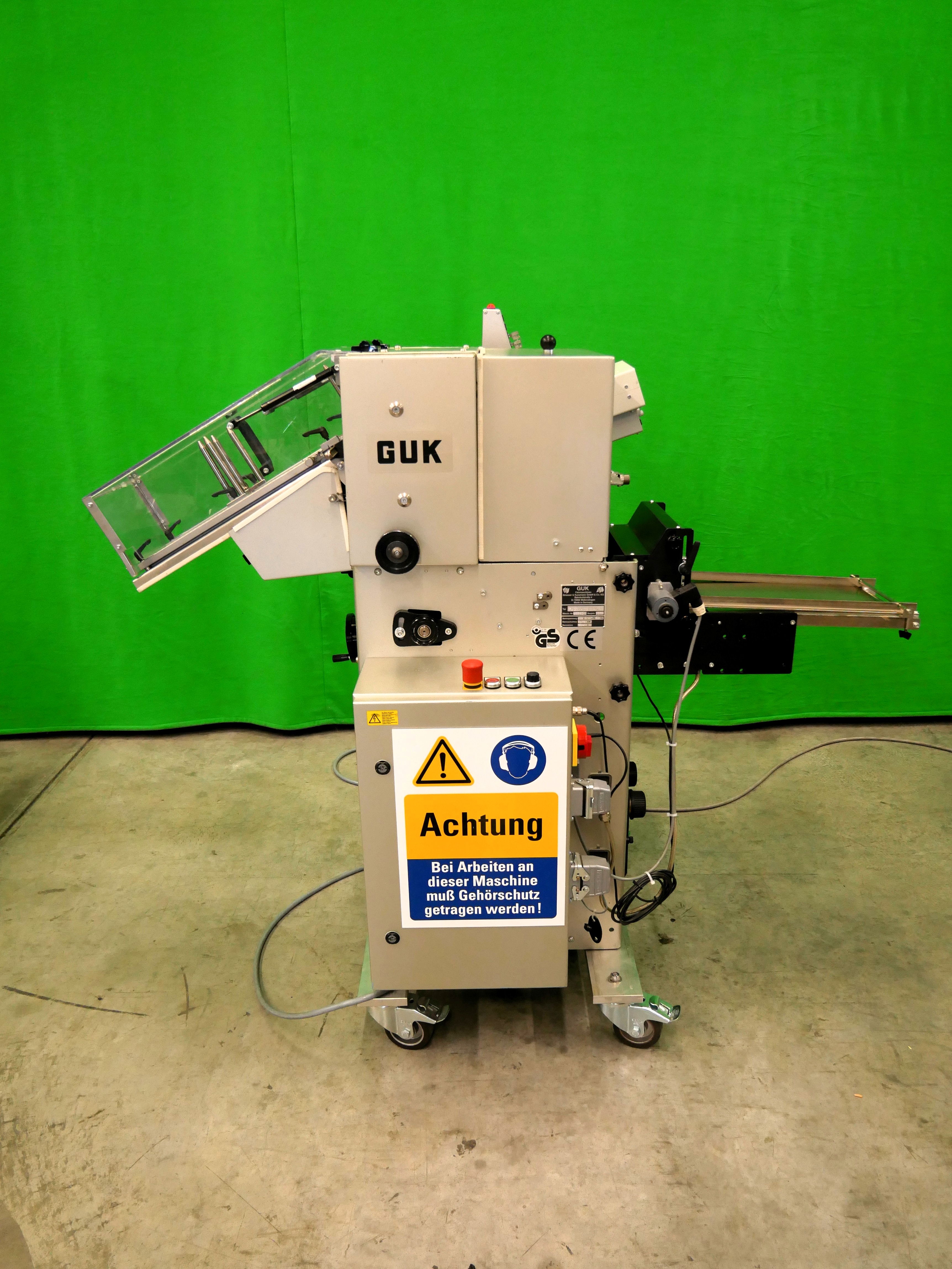 GUK FA 21/4 S2 SVA/730 Máquina plegadora de folletos estacionaria, 4 bolsillos de plegado, formato de hoja (desplegada): mín. 60 x 90 mm, máx. 215 x 320 mm, pliegue mínimo 15 mm, grosor de papel recomendado 50-70 g/m², alimentador automático de succión de tambor SVA/730, PCE lector de código farmacéutico, detección de doble hoja, capacidad de hasta 460 pliegues/min, accionamiento de variación continua, conexión eléctrica 400 V/3 fases/50 Hz, potencia nominal 1,76 kW, dimensiones de la máquina aprox. 1650 x 1075 mm (largo x ancho), altura de la máquina aprox. 1470 mm, peso neto de la máquina aprox. 300 kg, máquina en versión móvil sobre ruedas.
