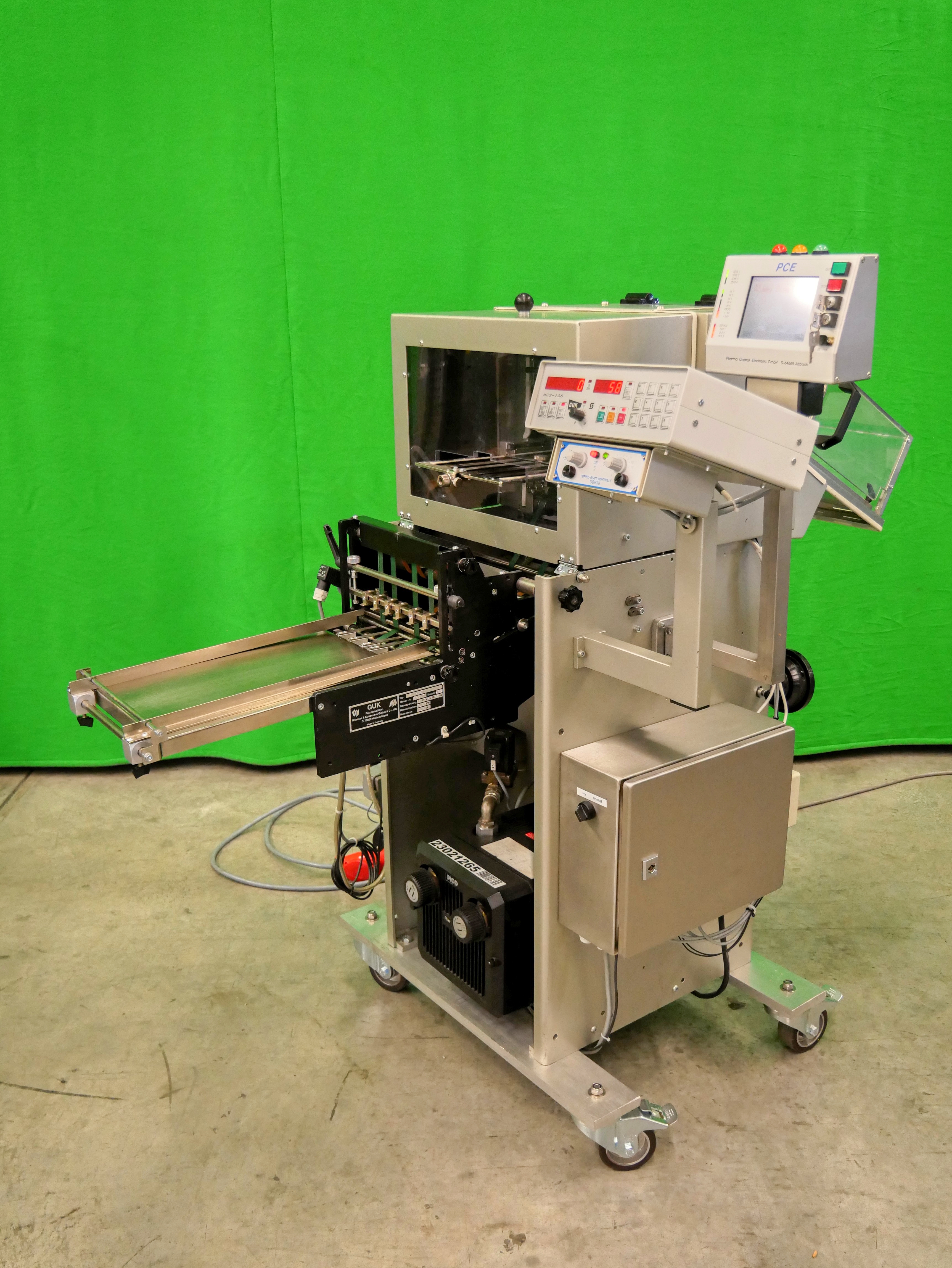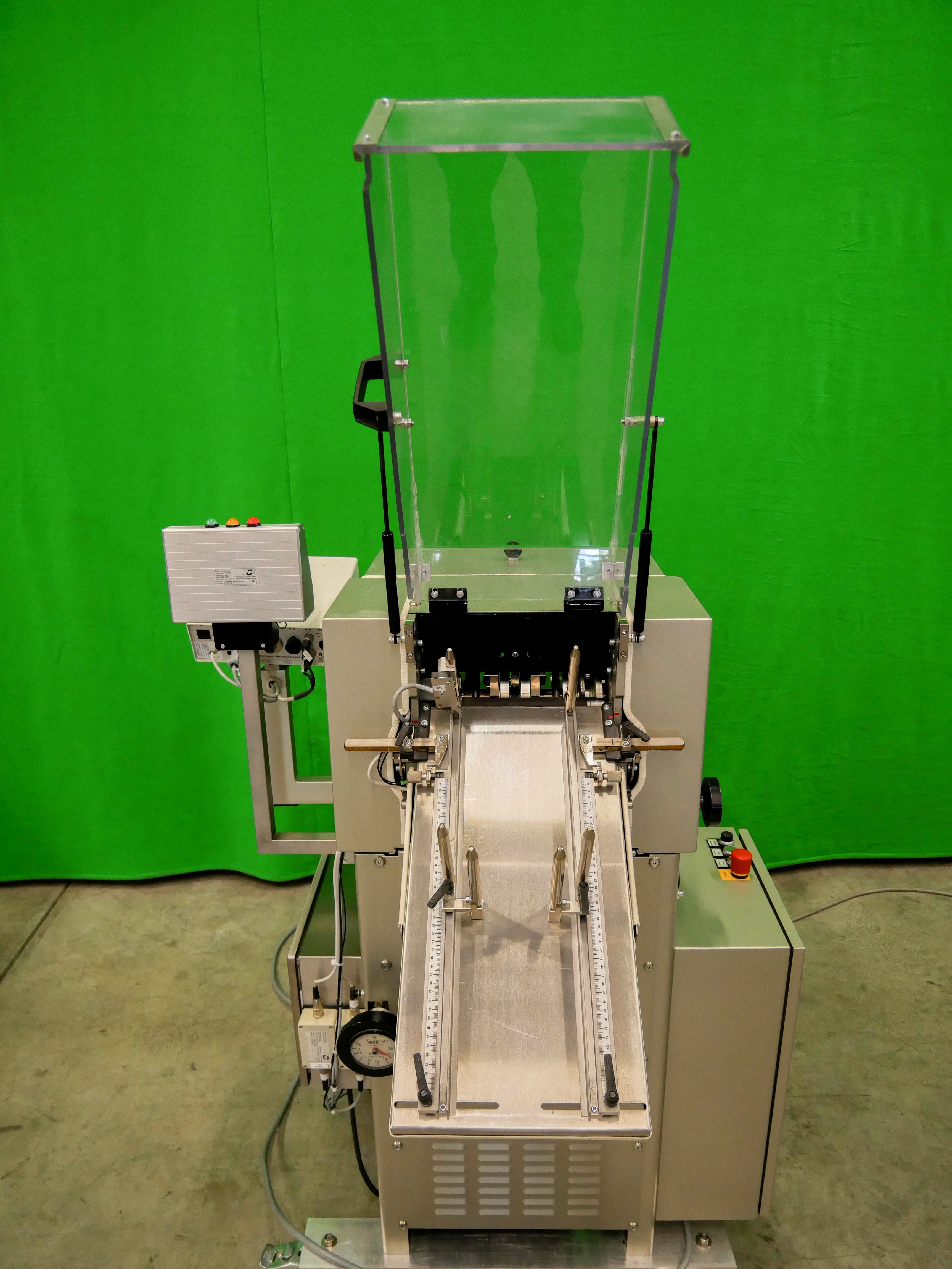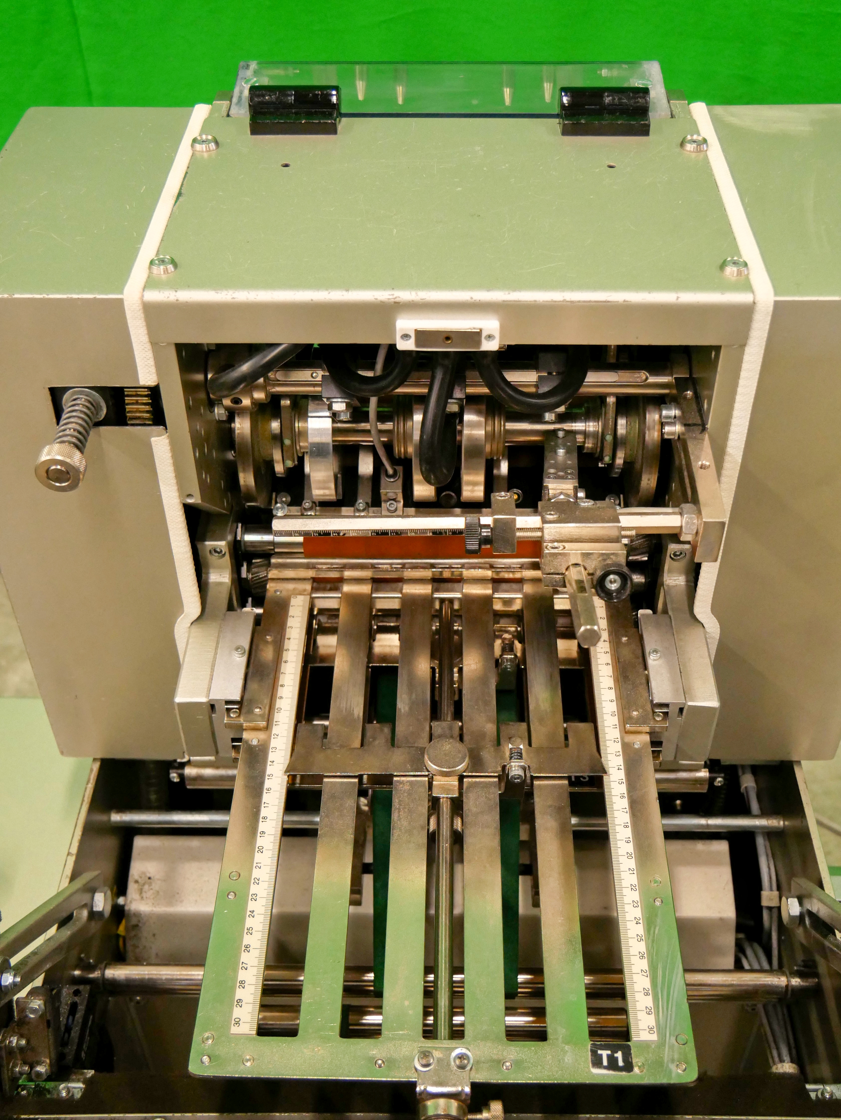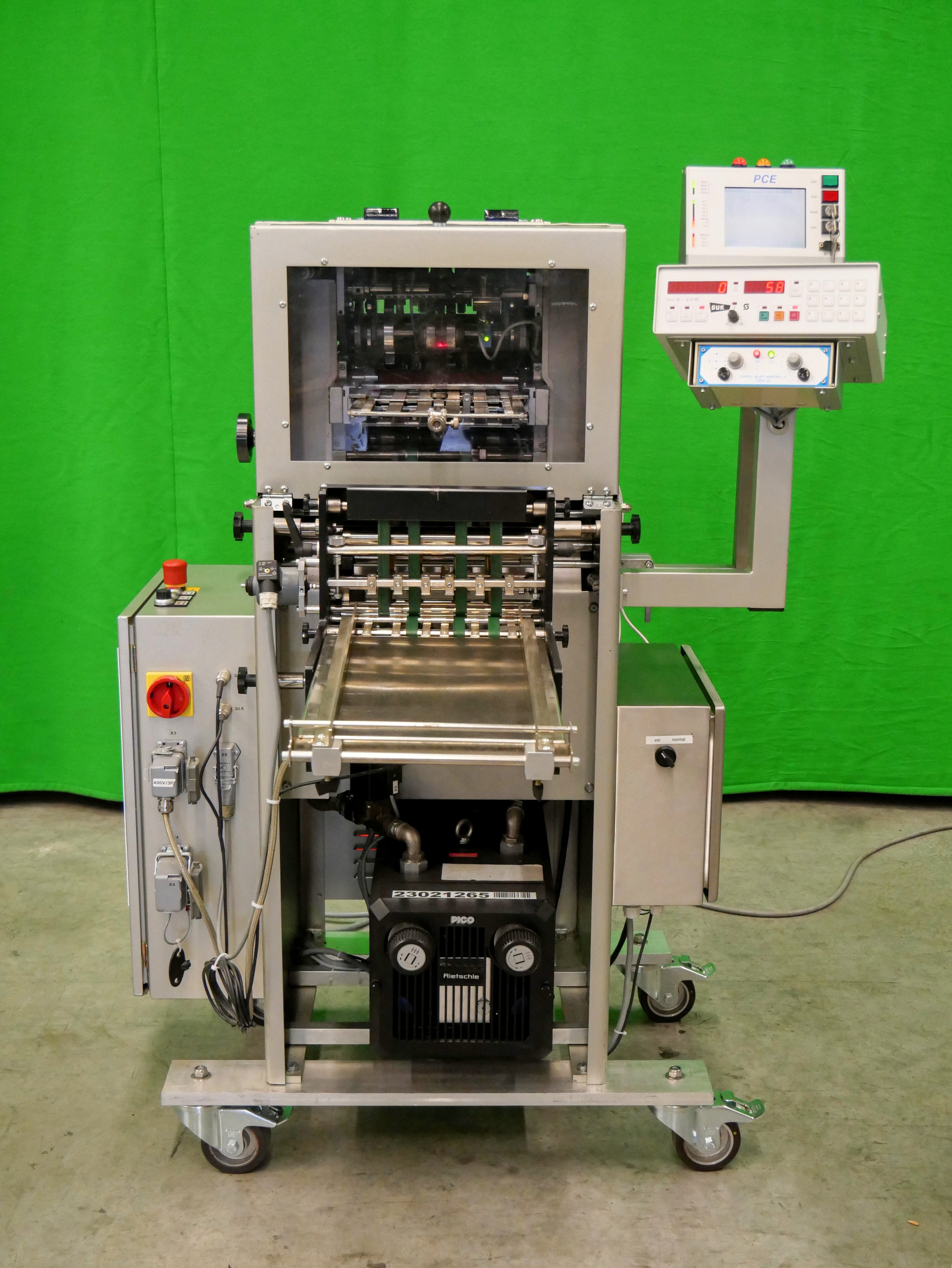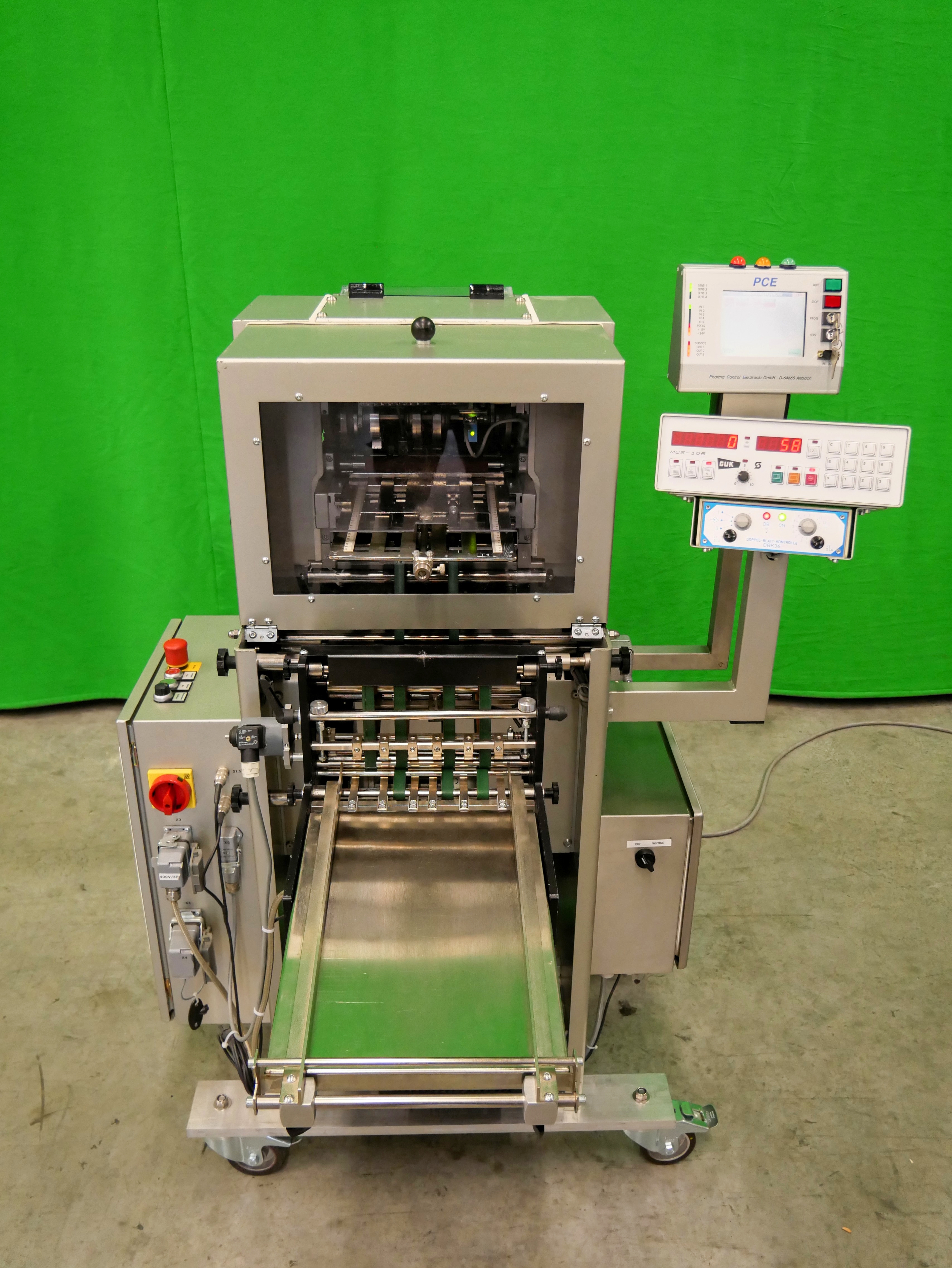 GUK FA 21/4 S2 SVA/730 Máquina plegadora de folletos estacionaria, 4 bolsillos de plegado, formato de hoja (desplegada): mín. 60 x 90 mm, máx. 215 x 320 mm, pliegue mínimo 15 mm, grosor de papel recomendado 50-70 g/m², alimentador automático de succión de tambor SVA/730, PCE lector de código farmacéutico, detección de doble hoja, capacidad de hasta 460 pliegues/min, accionamiento de variación continua, conexión eléctrica 400 V/3 fases/50 Hz, potencia nominal 1,76 kW, dimensiones de la máquina aprox. 1650 x 1075 mm (largo x ancho), altura de la máquina aprox. 1470 mm, peso neto de la máquina aprox. 300 kg, máquina en versión móvil sobre ruedas.