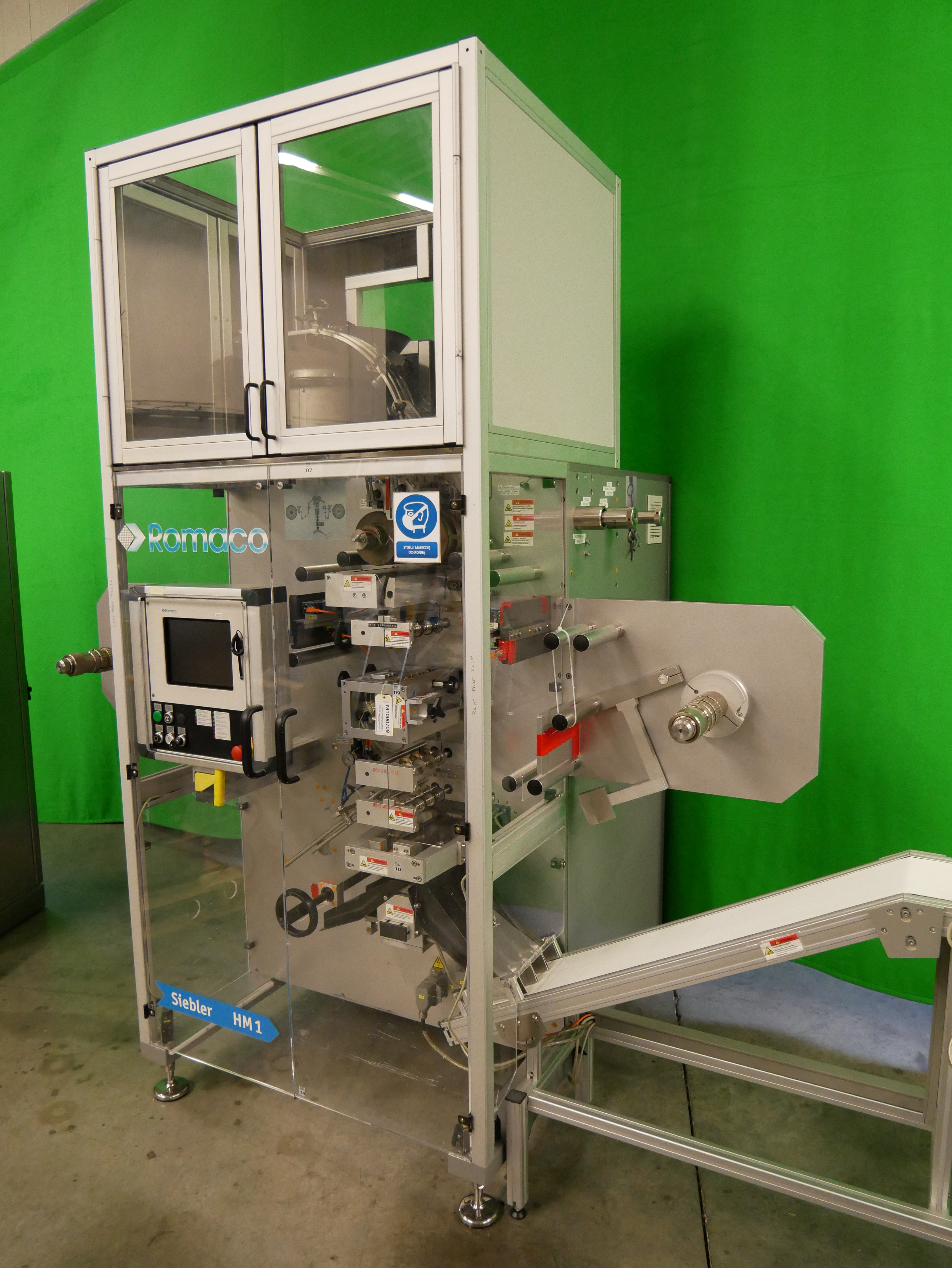 Romaco-Siebler HM1/160 Envasadora vertical de strips termoselladas de cuatro bordes para comprimidos, de 3 pistas, ancho máximo de película 170 mm, incluye piezas de formato para tabletas con dimensiones de 7,2 x 5,6 x 17,5 mm y 11,4 x 6, 31/WR8. 5, diámetro del núcleo del rollo de película 76 mm, diámetro máximo del rollo de película 450 mm, con Siemens SIMATIC S7-300, en muy buen estado de operación con aprox. sólo 1600 horas de funcionamiento.