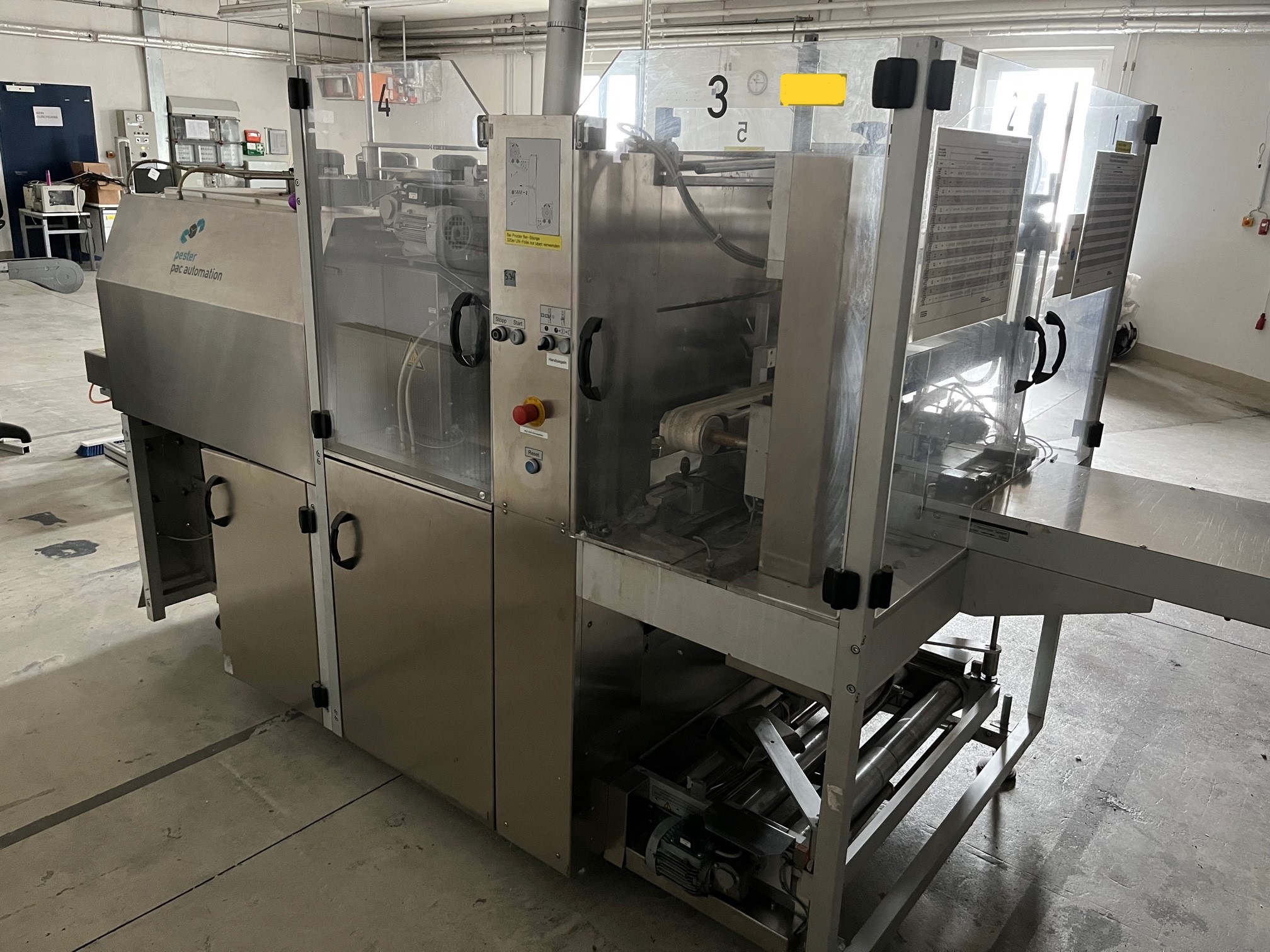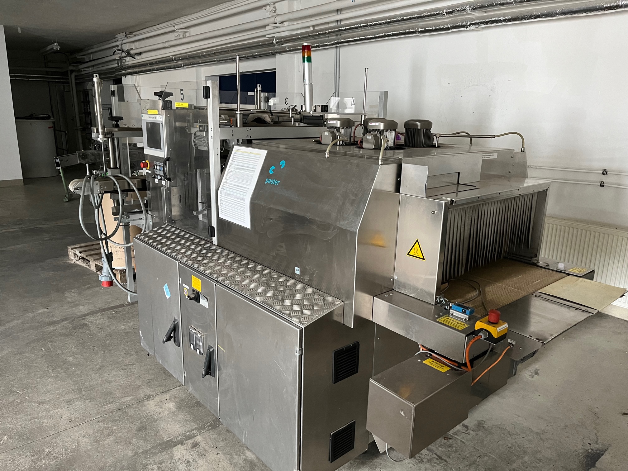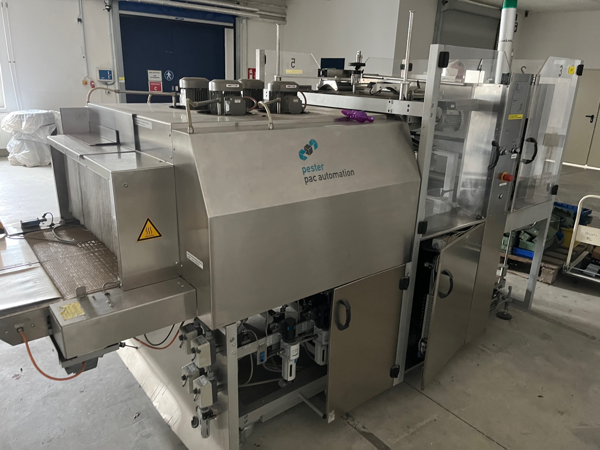 Pester PEWO-pack 800 + PEWO-therm III 800 E Emballage rétractable pour bouteilles/boîtes aérosols, entrée de bande à angle droit avec station de regroupement, transport d'évacuation et refroidissement (en cas de panne, l'intérieur complet, y compris les gaines de circulation d'air et de chauffage, est refroidi et un transport d'évacuation pneumatique est en outre activé au moyen d'un moteur à air.), largeur de soudure max. 800 mm, largeur d'entrée du produit max. 850 mm, longueur d'entrée du produit max. 350 mm, hauteur d'entrée du produit max. 250 mm, hauteur d'entrée/sortie 900-950 mm, type de film PE, largeur du film 50-800 mm, épaisseur du film 0,025-0,1 mm, diamètre du rouleau max. 300 mm, capacité jusqu'à 25 paquets par minute, raccordement électrique 3x400V/50-60Hz, puissance absorbée 16,8 kW, pression de service env. 5 bar, surface de base de la machine env. 3670 x 1350 mm (Lxl), poids net de la machine env. 700 kg, autrefois utilisé pour l'emballage de bouteilles et de boîtes d'aérosols