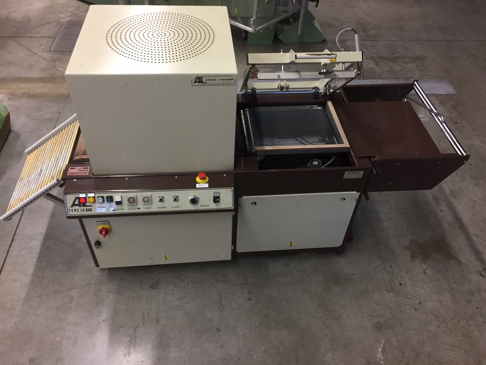 AC Automation LC800 Soudeuse d'angle semi-automatique avec tunnel de rétraction, largeur de bande environ 350 mm, passage de tunnel environ 350 x 180 mm, cadre de soudage environ 500 x 400 mm (L du sens de marche x l), base de la machine environ 2600 x 1000 mm, hauteur de la machine environ 1400 mm