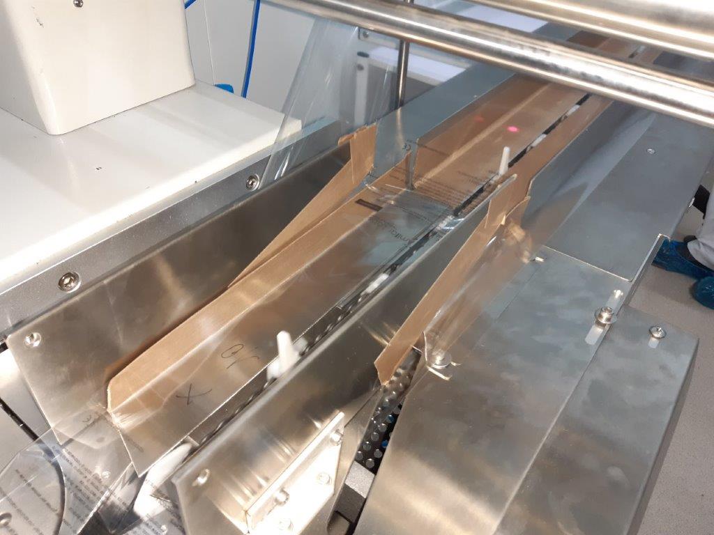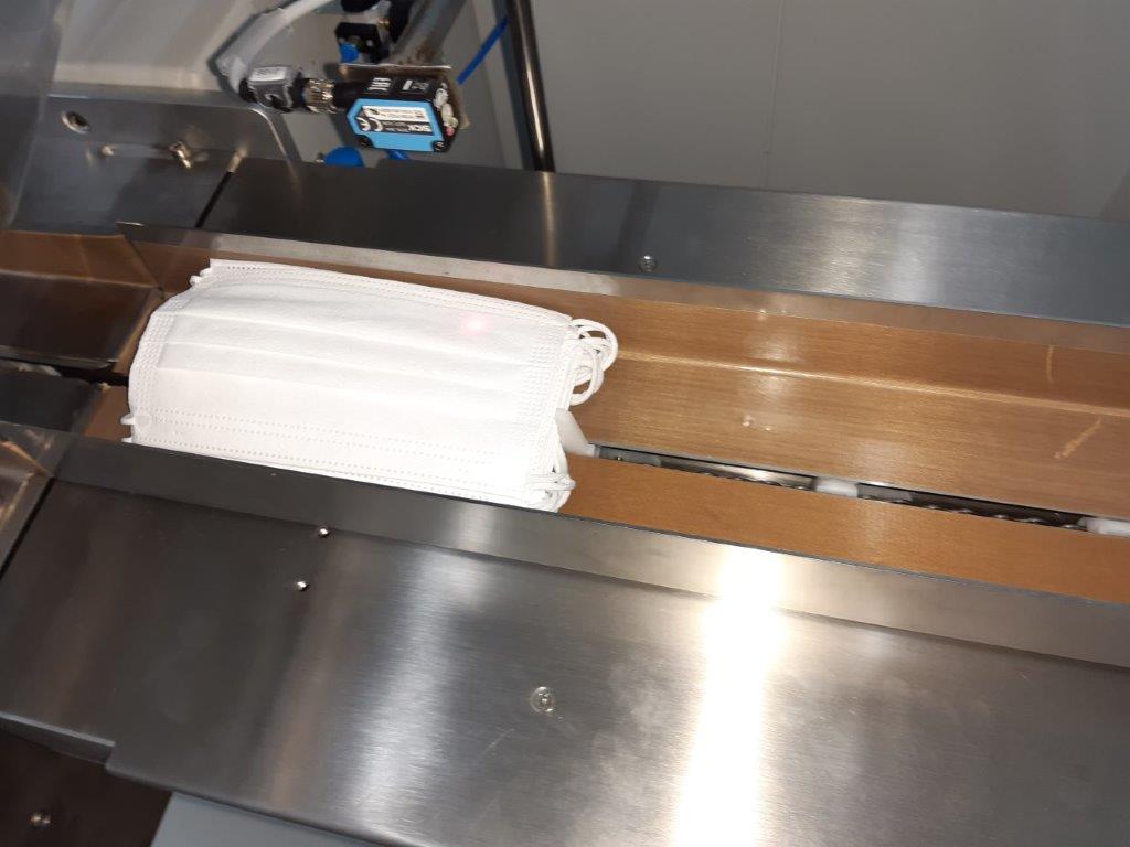 - 2 bandes transporteuses qui amènent les faisceaux de masques vers le flowpacker en aval