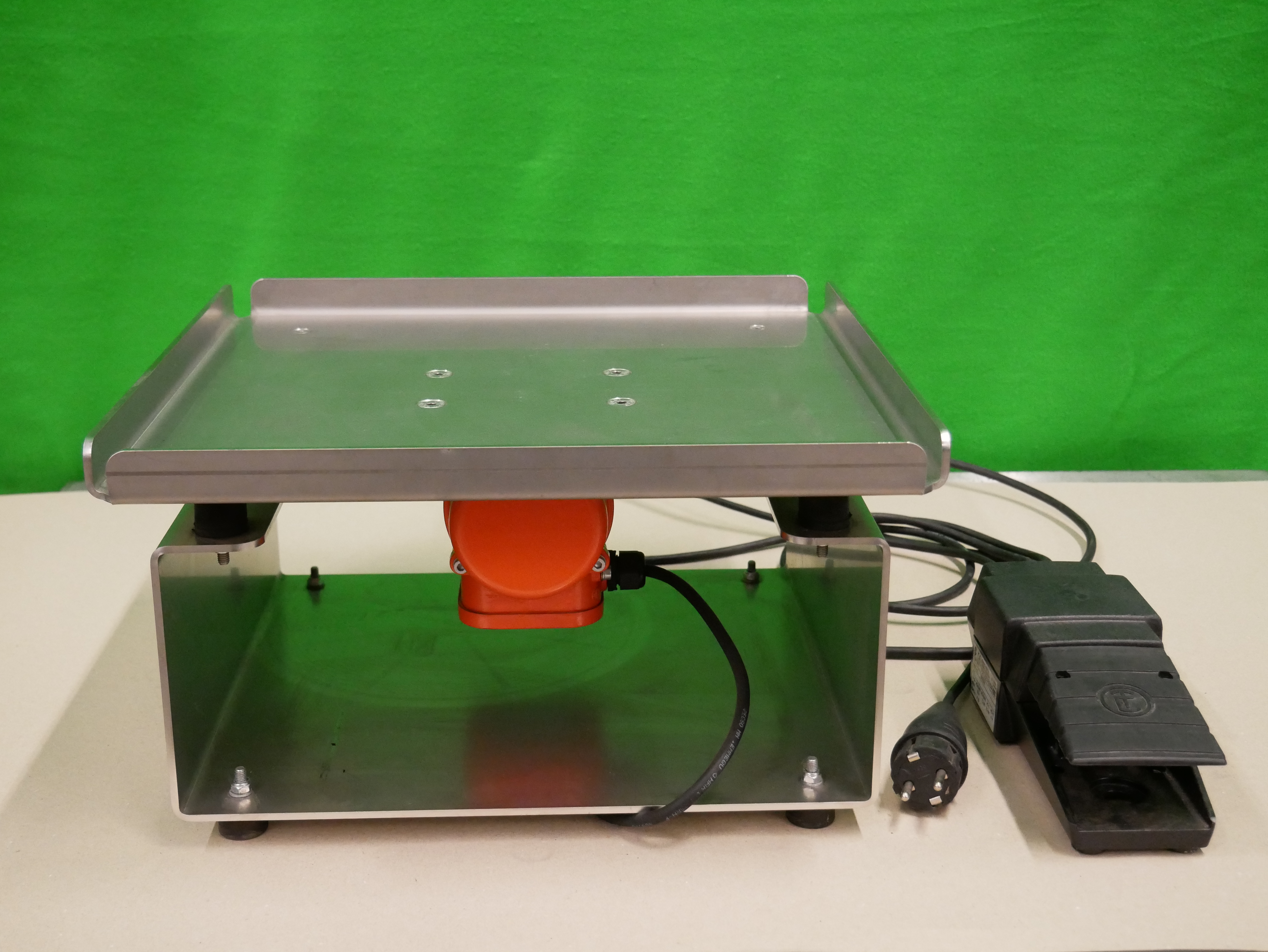Table vibrante mobile Berger BM400x400 avec pédale de commande (type FDC-A2T-FG10-P-SSS), à vibration circulaire pour le compactage de matériaux en vrac tels que la poudre, etc., raccordement électrique 230 V/50 Hz, absorption max. 0,43 A, puissance installée 0,08 kW, encombrement de la machine env. 410 x 410 mm (L x l), hauteur de la machine env. 230 mm, poids net de la machine env. 20 kg