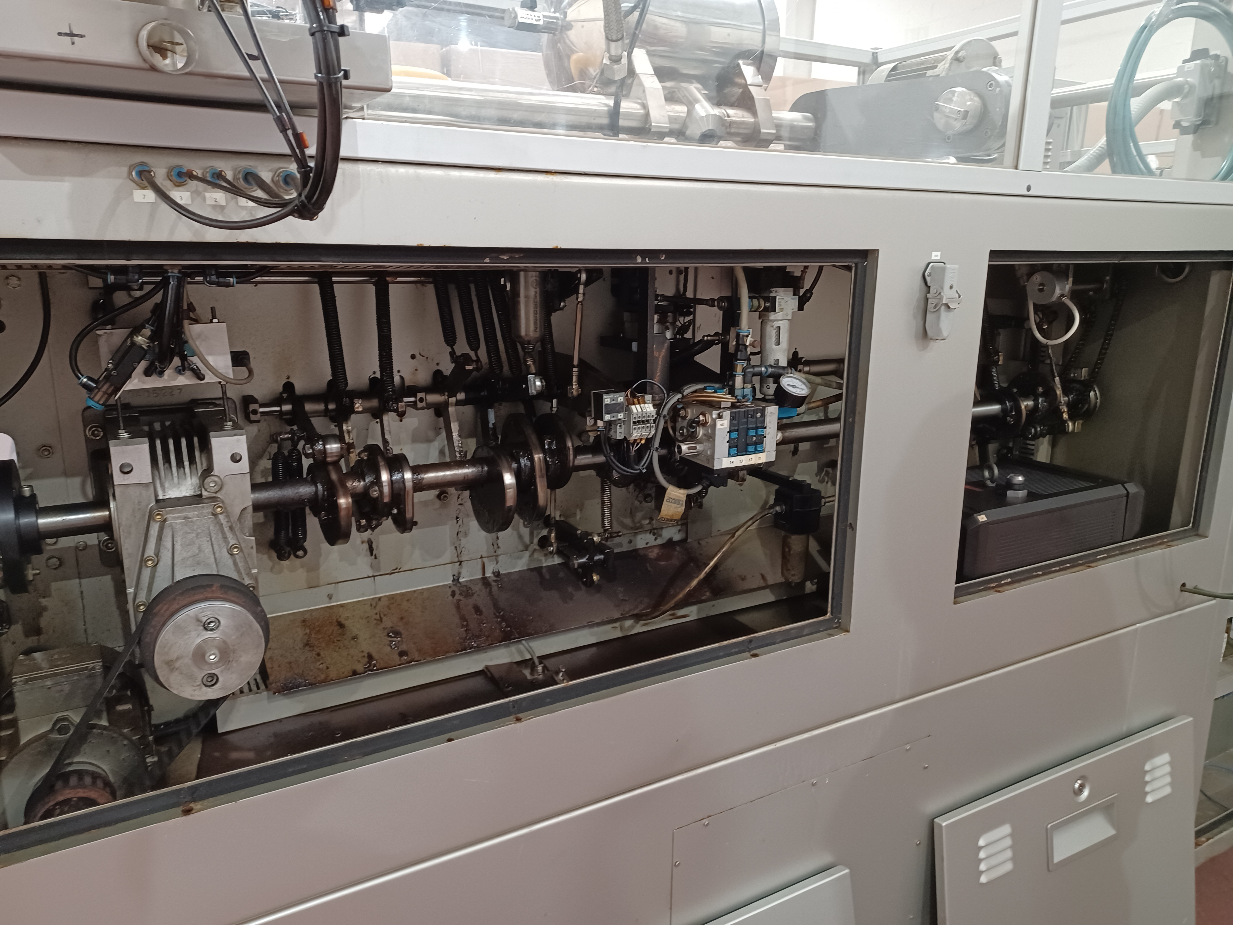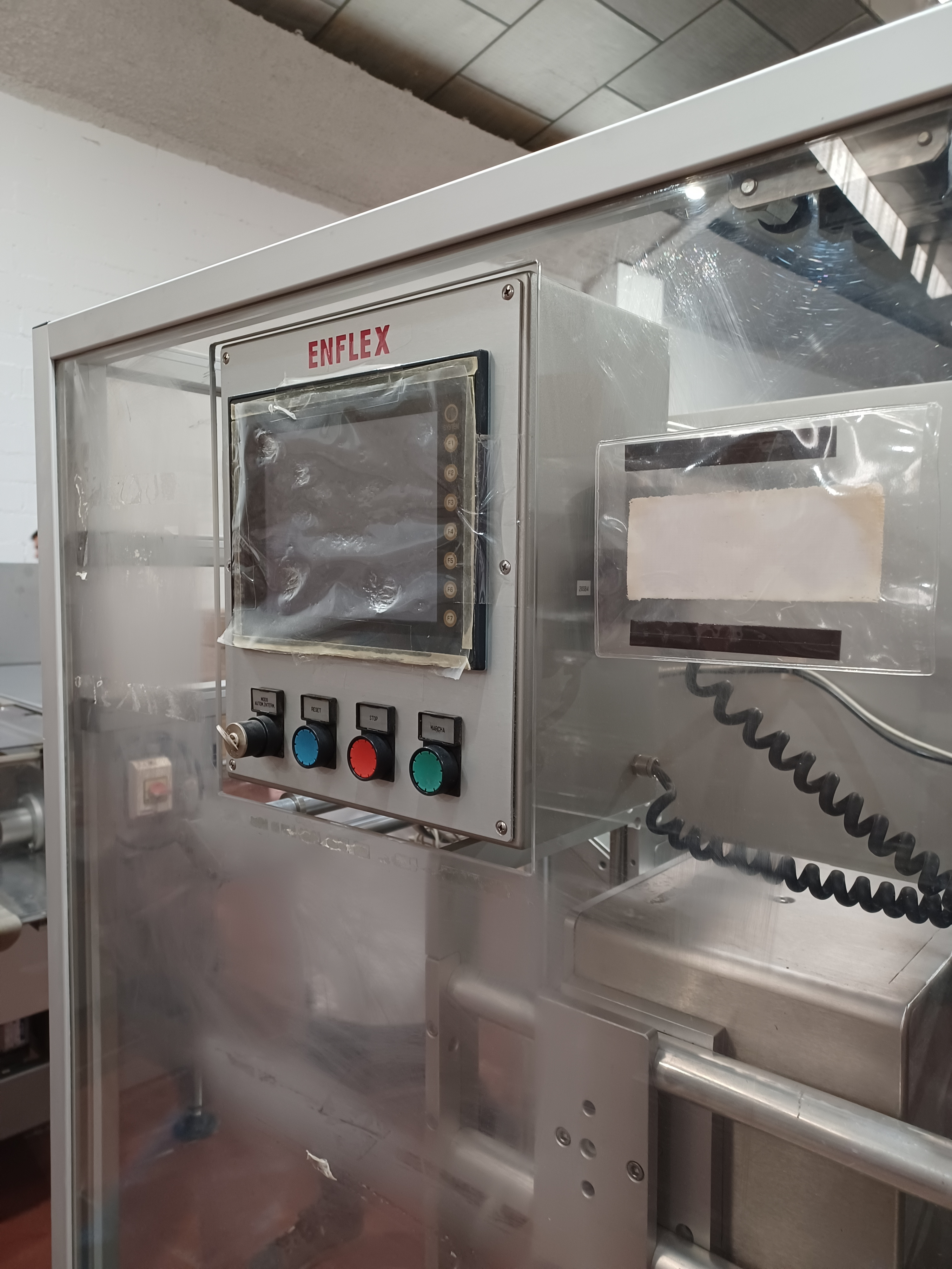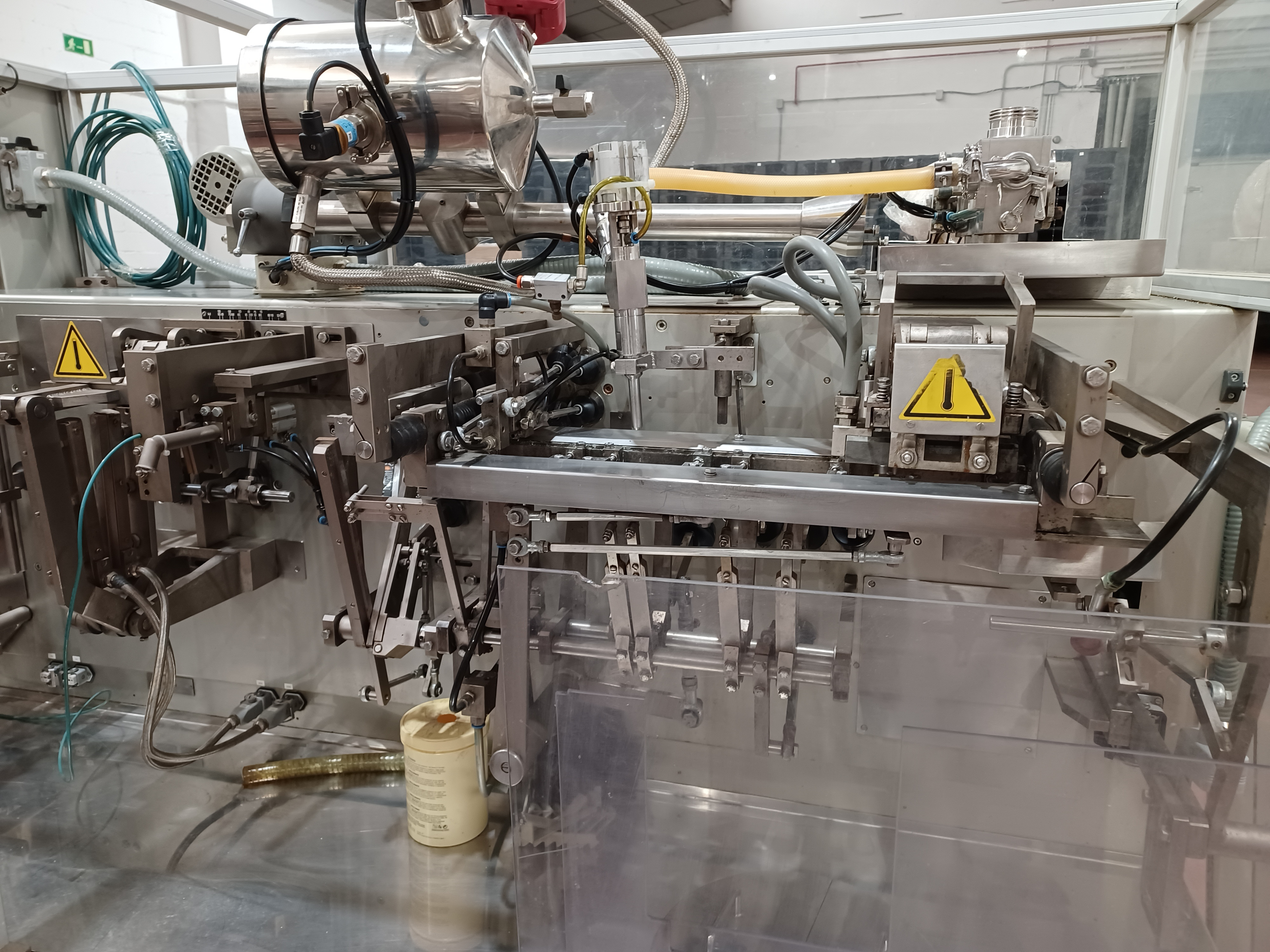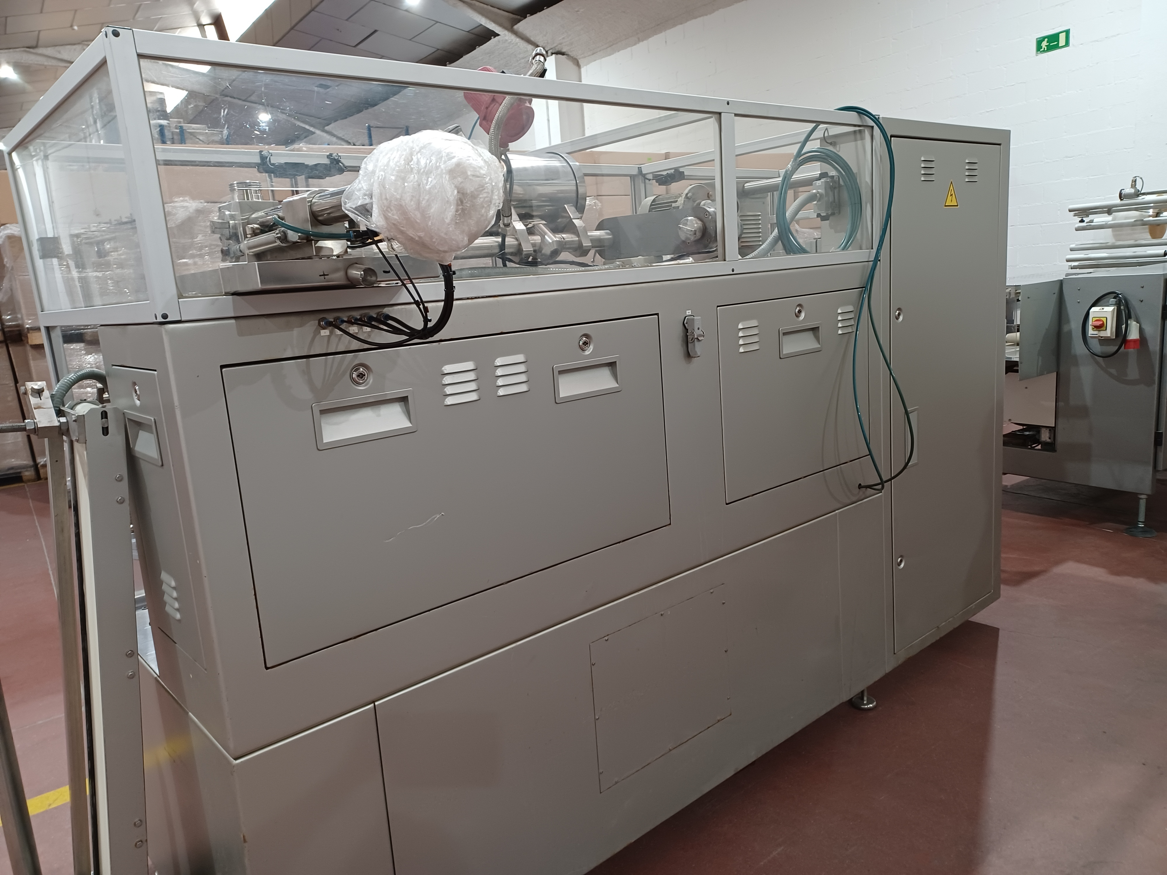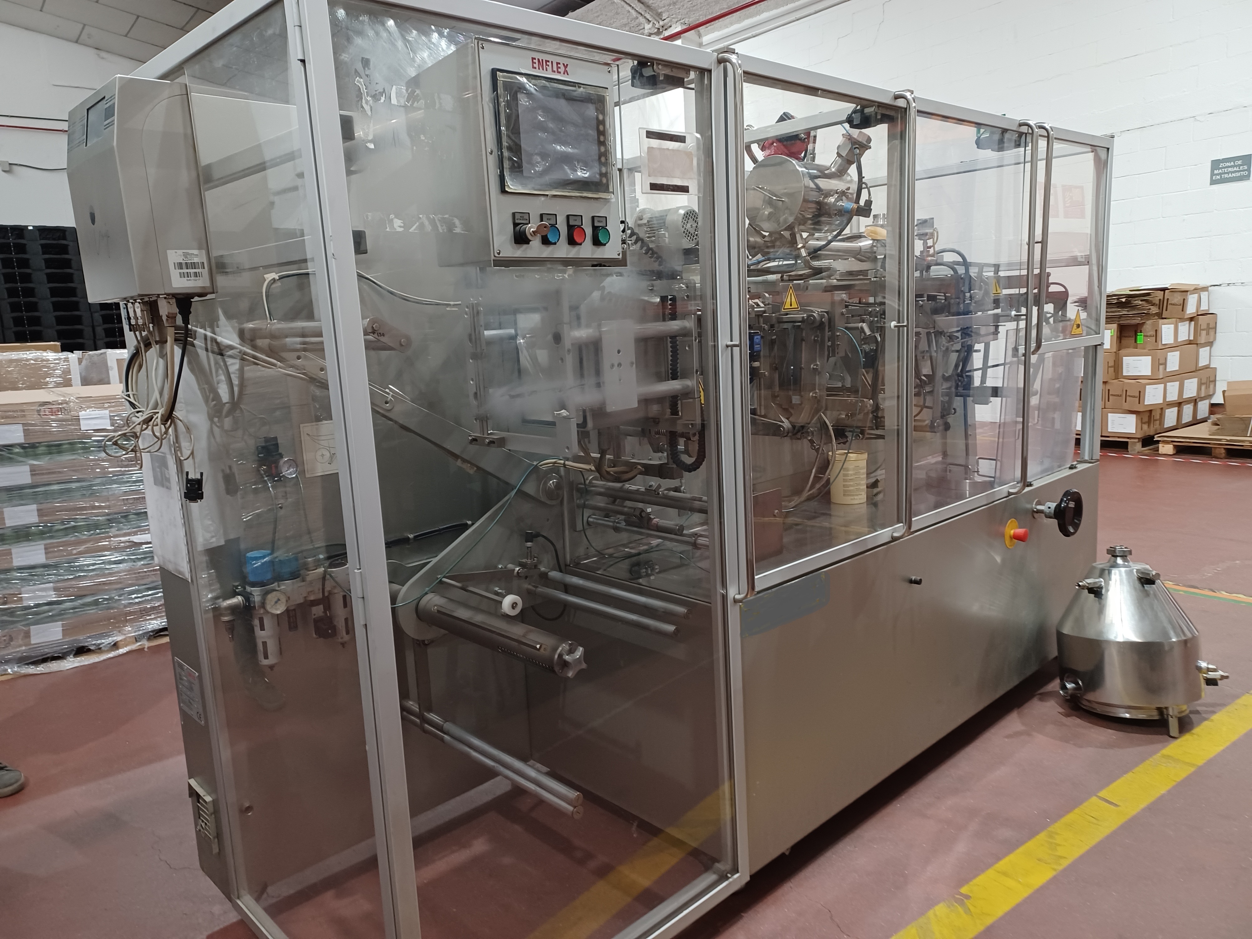 Machine à sachets horizontale Volpak Enflex F14 pour le scellage sur 3 ou 4 côtés de sachets simplex destinés à contenir des produits liquides, des crèmes, etc., dimensions comprises entre 50 x 70 mm (largeur x hauteur) et 140 x 200 mm (largeur x hauteur), largeur de scellage 6 mm, diamètre de bobine 500 mm, largeur maximale de bobine 400 mm, diamètre du mandrin de bobine 70/72 mm, avec équipement de dosage JEF type DOS.30-100, trémie de produit avec agitateur, capacité de production minimale de 1000 sachets/minute. 400 mm, diamètre du mandrin de bobine 70/72 mm, avec équipement de dosage JEF type DOS.30-100, trémie de produit avec agitateur, capacité de production de min. 45 cycles/min. (= 2 700 sachets/heure) à max. 100 cycles/min. (= 6 000 sachets/heure), électricité 380 V/ 50 Hz, 3 phases, air comprimé 6 bars