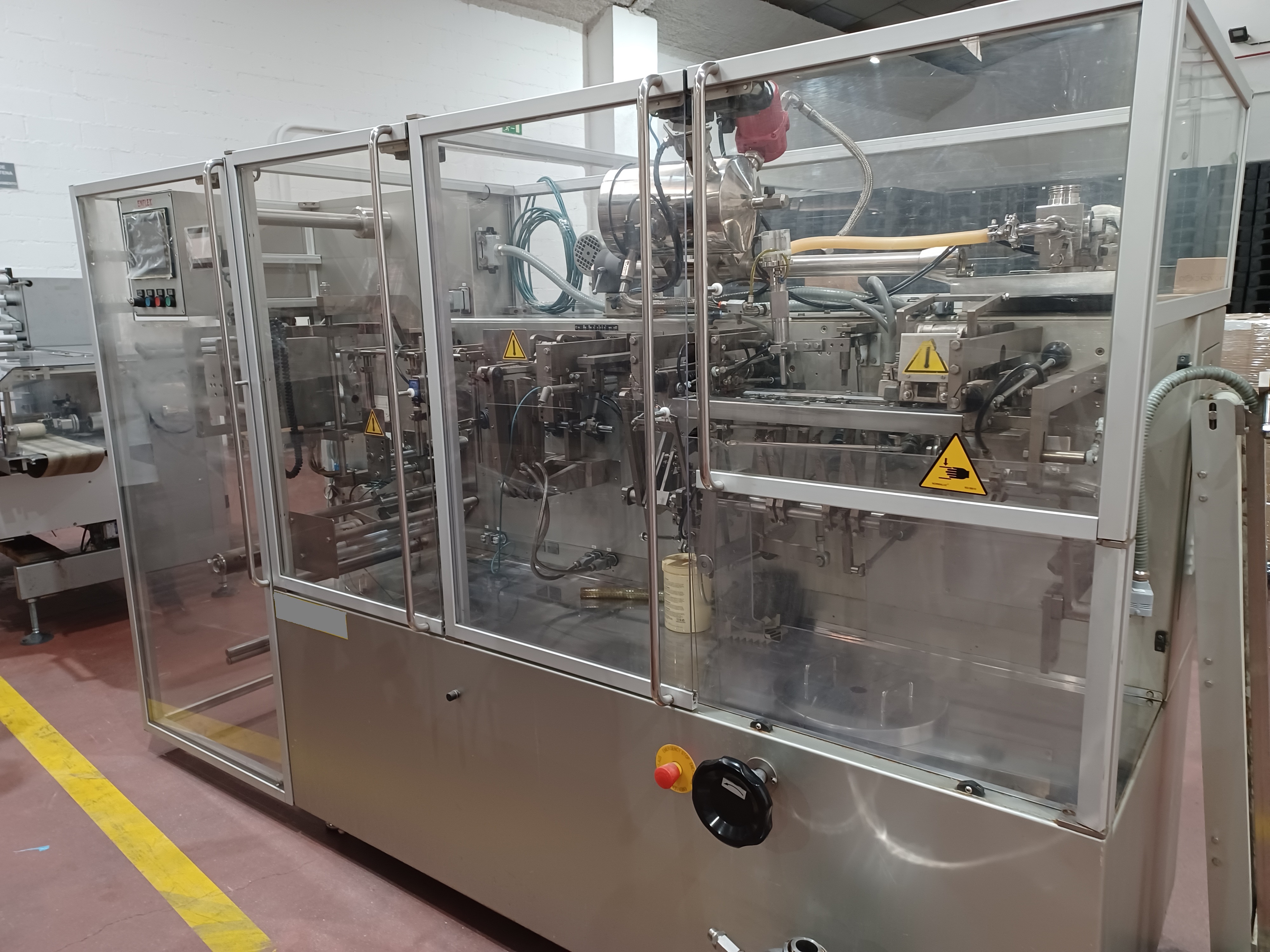 Machine à sachets horizontale Volpak Enflex F14 pour le scellage sur 3 ou 4 côtés de sachets simplex destinés à contenir des produits liquides, des crèmes, etc.