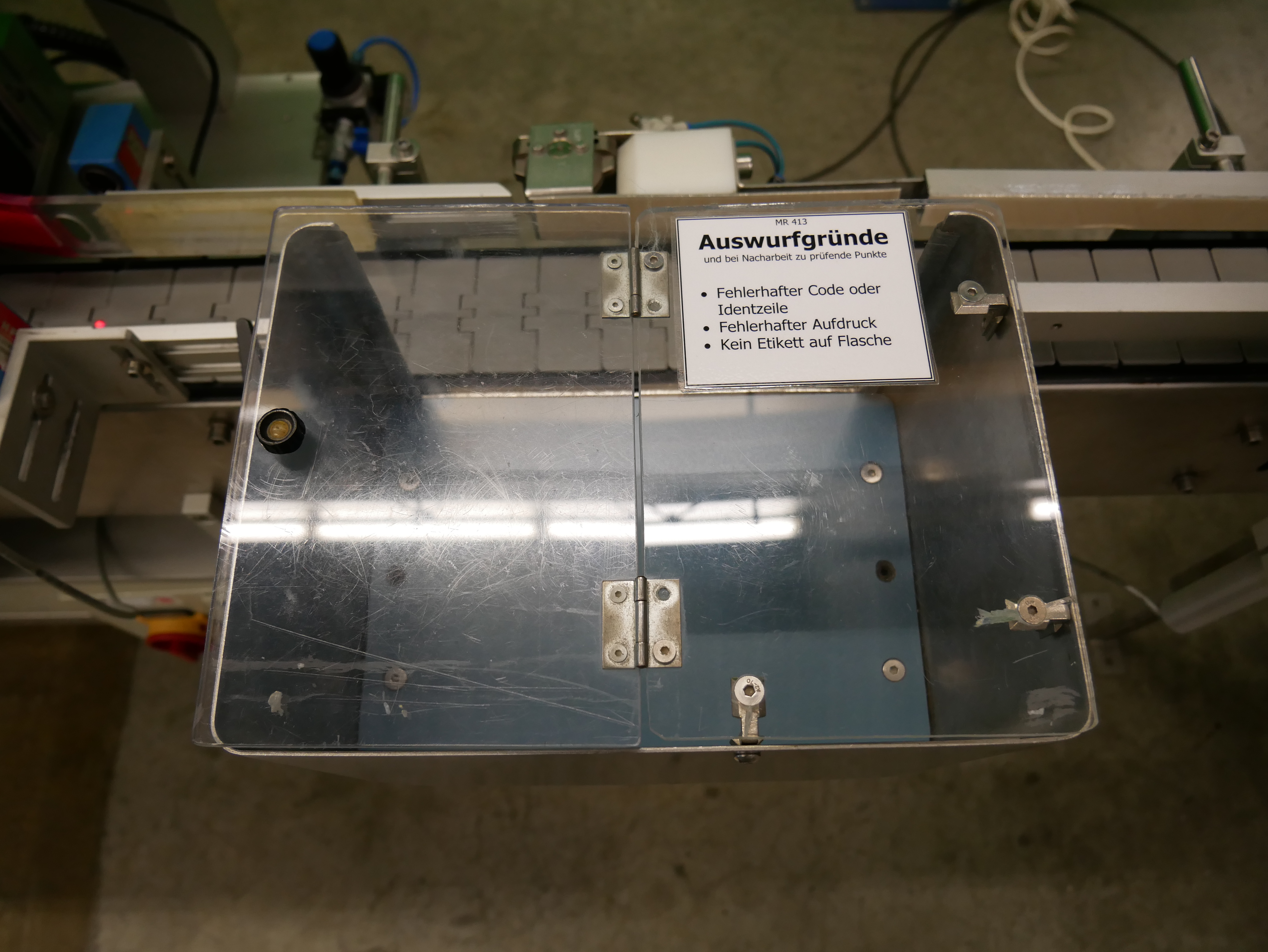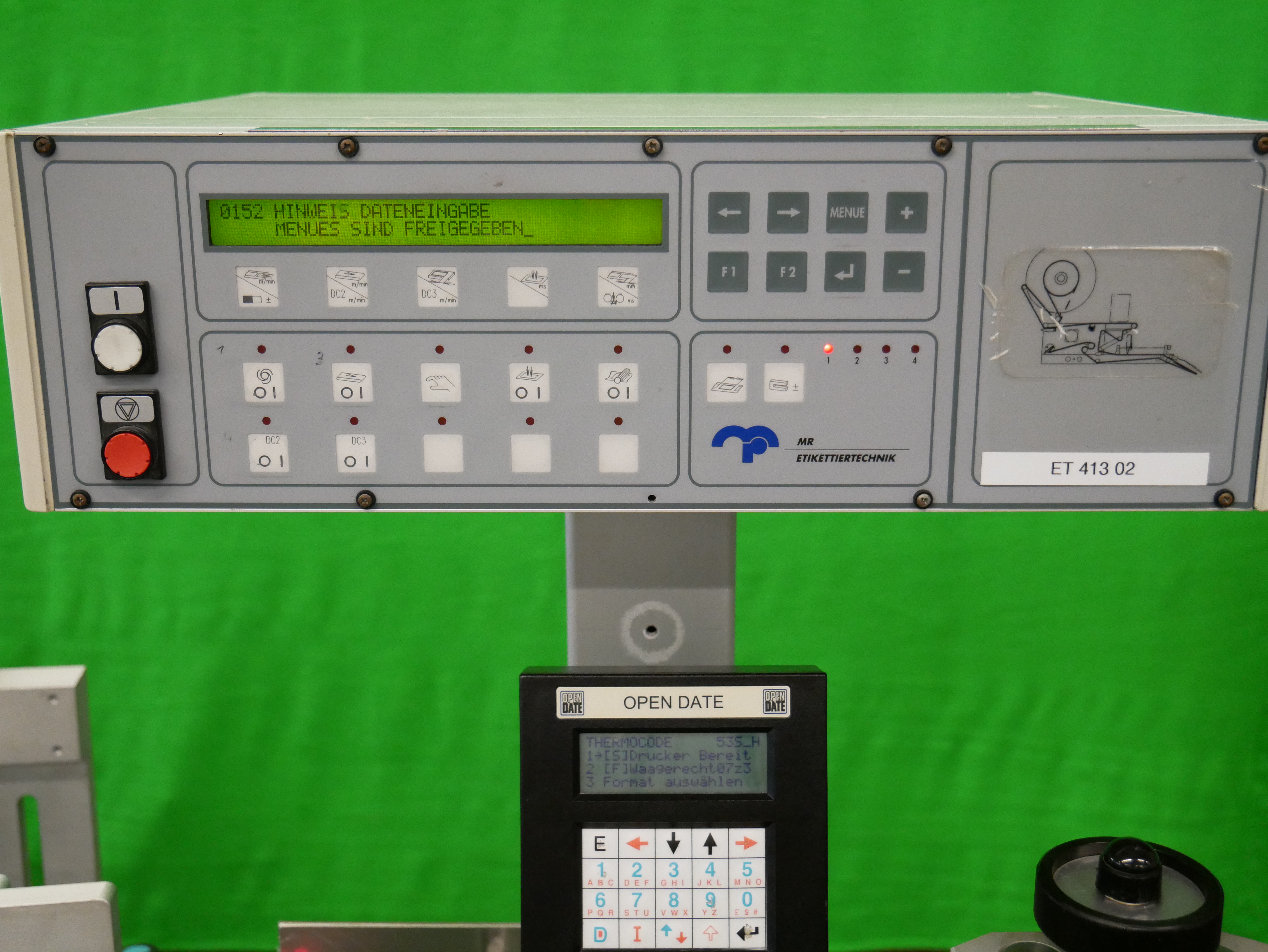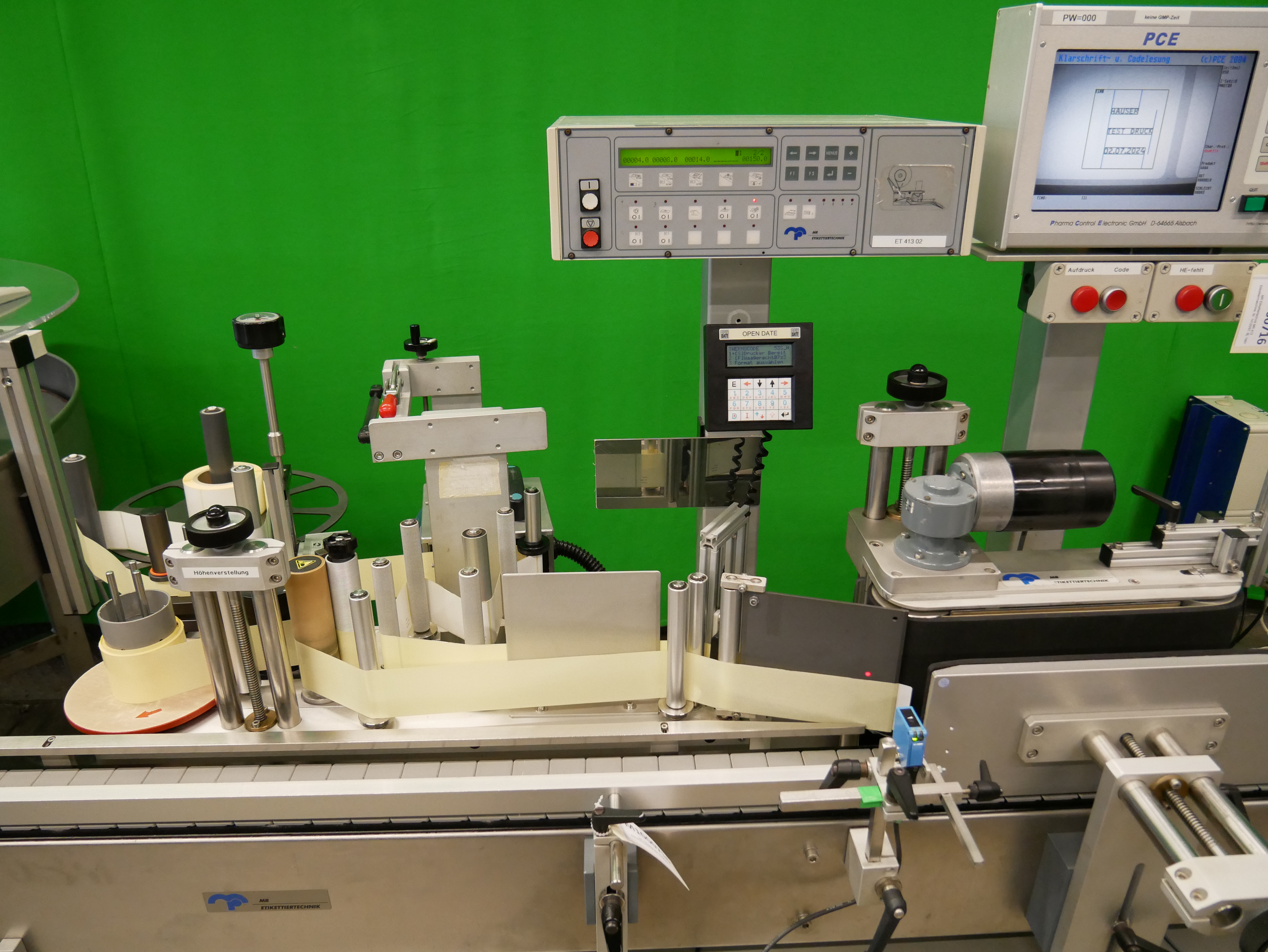 MR Etikettiertechnik modèle MR 413 étiqueteuse auto-adhésive pour flacons, bouteilles, etc., convient aux récipients ronds d'un diamètre allant jusqu'à 80 mm, hauteur de l'étiquette jusqu'à 150 mm, diamètre de l'âme de la bobine 76 mm, diamètre extérieur maximal de la bobine 350 mm, tapis d'application de l'étiquette d'une hauteur de 150 mm, imprimante à transfert thermique Open Date 53S pour l'impression des données variables (date de péremption, n° de lot, etc.) sur l'étiquette avec système de caméra PCE Mini Smart pour la vérification de l'impression, contrôle du pharmacode PCE, contrôle de la présence de l'étiquette, rejet des flacons défectueux lorsque le code et/ou l'impression ne sont pas valides ou que l'étiquette est manquante, alimentation électrique 230V/50Hz/2500W, air comprimé max. 6 bar, comprend une table d'entrée et de sortie des flacons Blume d'un diamètre de 1500 mm, surface au sol nécessaire, y compris les tables rotatives, environ 6000 x 2300 mm (LxL), hauteur max. environ 1800 mm.