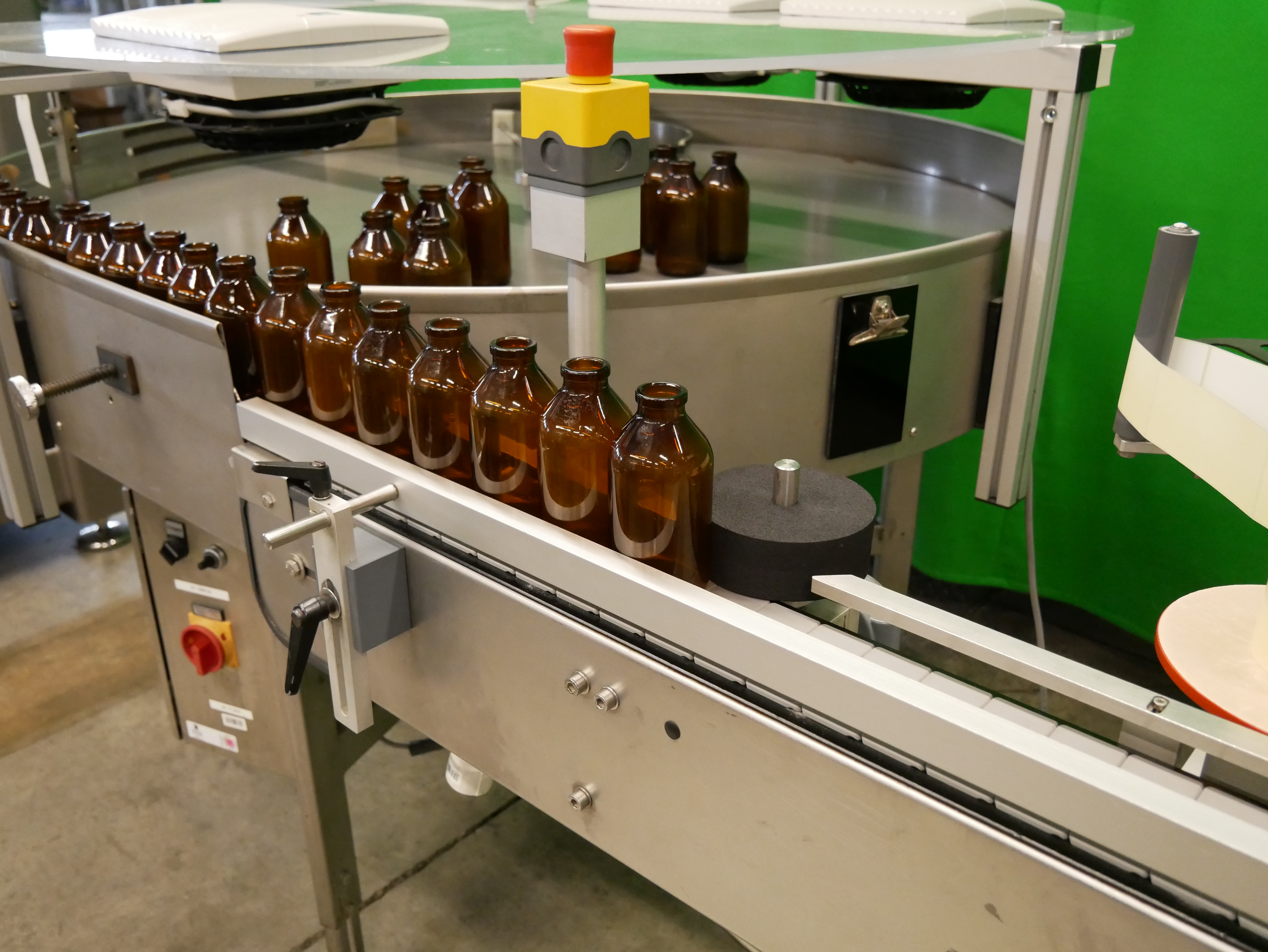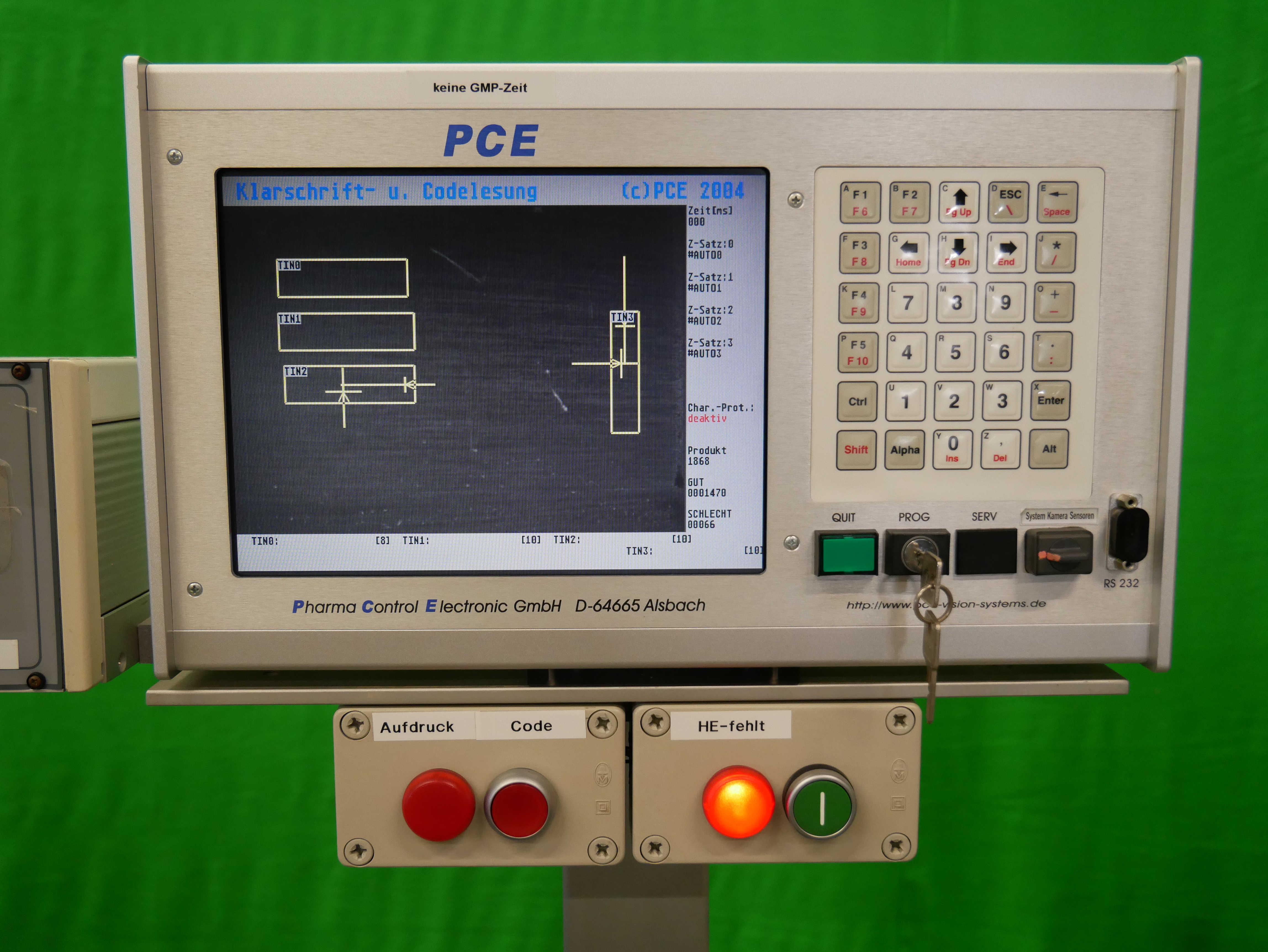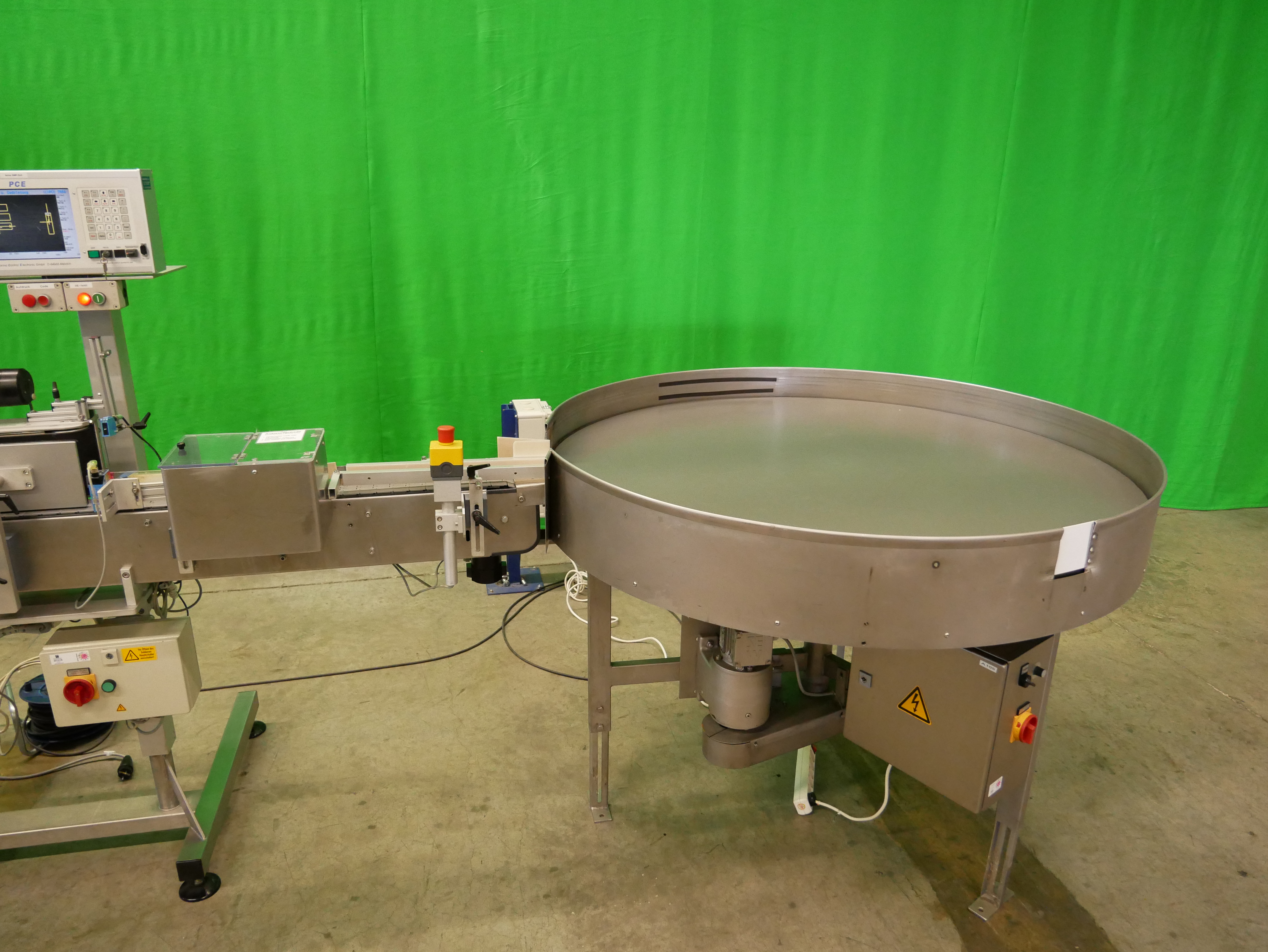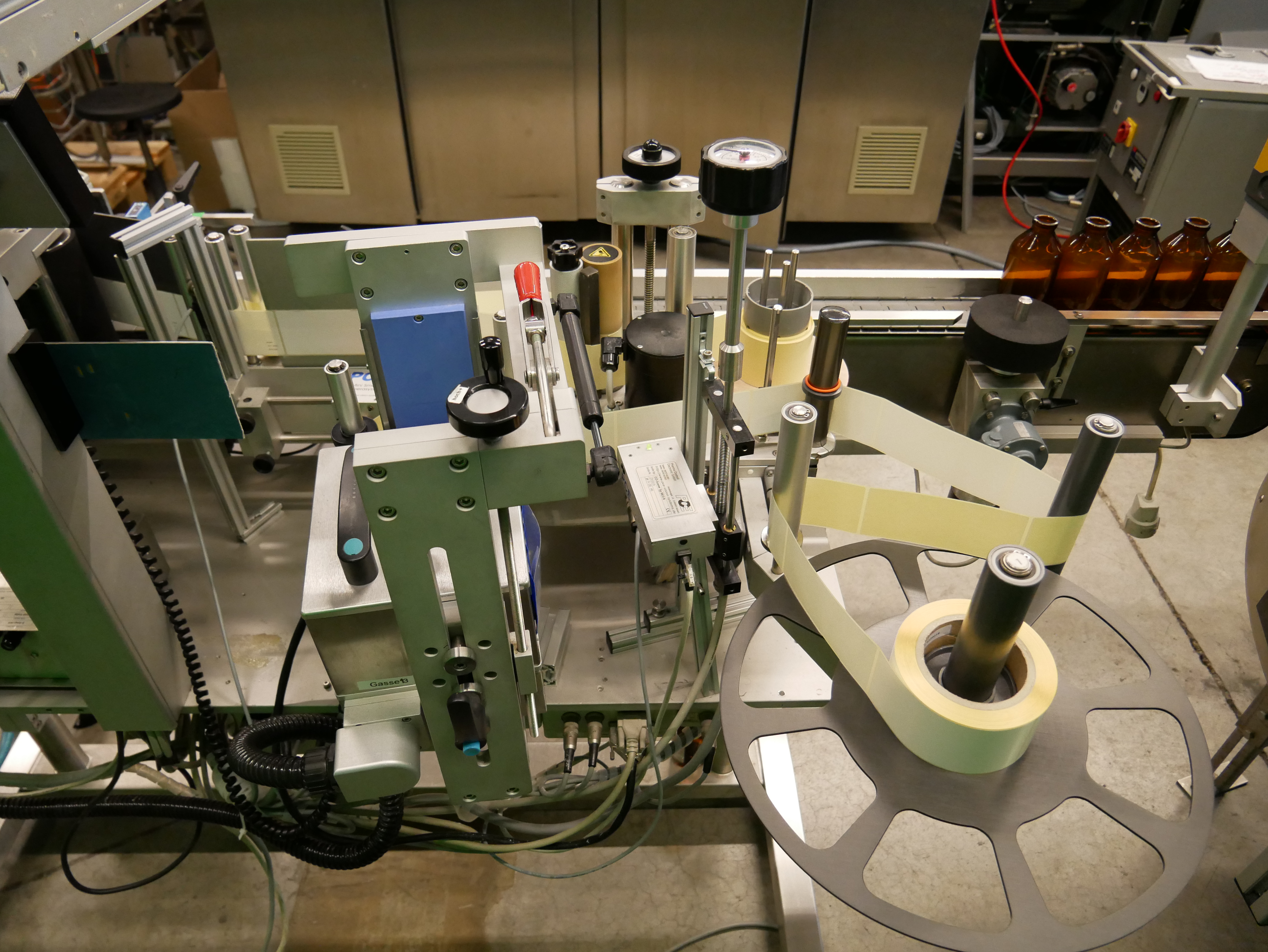 MR Etikettiertechnik modèle MR 413 étiqueteuse auto-adhésive pour flacons, bouteilles, etc., convient aux récipients ronds d'un diamètre allant jusqu'à 80 mm, hauteur de l'étiquette jusqu'à 150 mm, diamètre de l'âme de la bobine 76 mm, diamètre extérieur maximal de la bobine 350 mm, tapis d'application de l'étiquette d'une hauteur de 150 mm, imprimante à transfert thermique Open Date 53S pour l'impression des données variables (date de péremption, n° de lot, etc.) sur l'étiquette avec système de caméra PCE Mini Smart pour la vérification de l'impression, contrôle du pharmacode PCE, contrôle de la présence de l'étiquette, rejet des flacons défectueux lorsque le code et/ou l'impression ne sont pas valides ou que l'étiquette est manquante, alimentation électrique 230V/50Hz/2500W, air comprimé max. 6 bar, comprend une table d'entrée et de sortie des flacons Blume d'un diamètre de 1500 mm, surface au sol nécessaire, y compris les tables rotatives, environ 6000 x 2300 mm (LxL), hauteur max. environ 1800 mm.