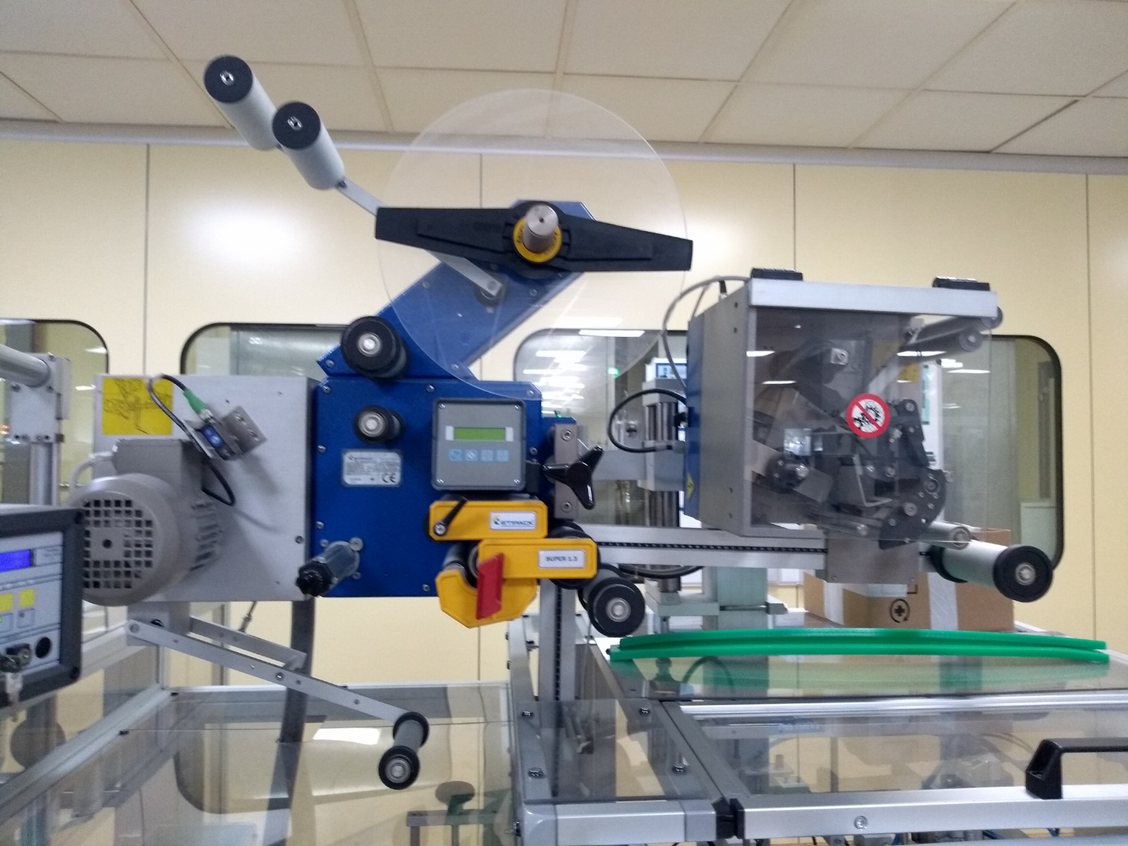 powierzchni kartonu; dozownik etykiet model SUPER 1.3 z urządzeniem kodującym do drukowania zmiennych danych na etykietach; zakres wymiarów kartonów od: 32 x 85 x 15 mm do 150 x 220 x 65 mm (A x B x C), maksymalna średnica zwoju rolki: