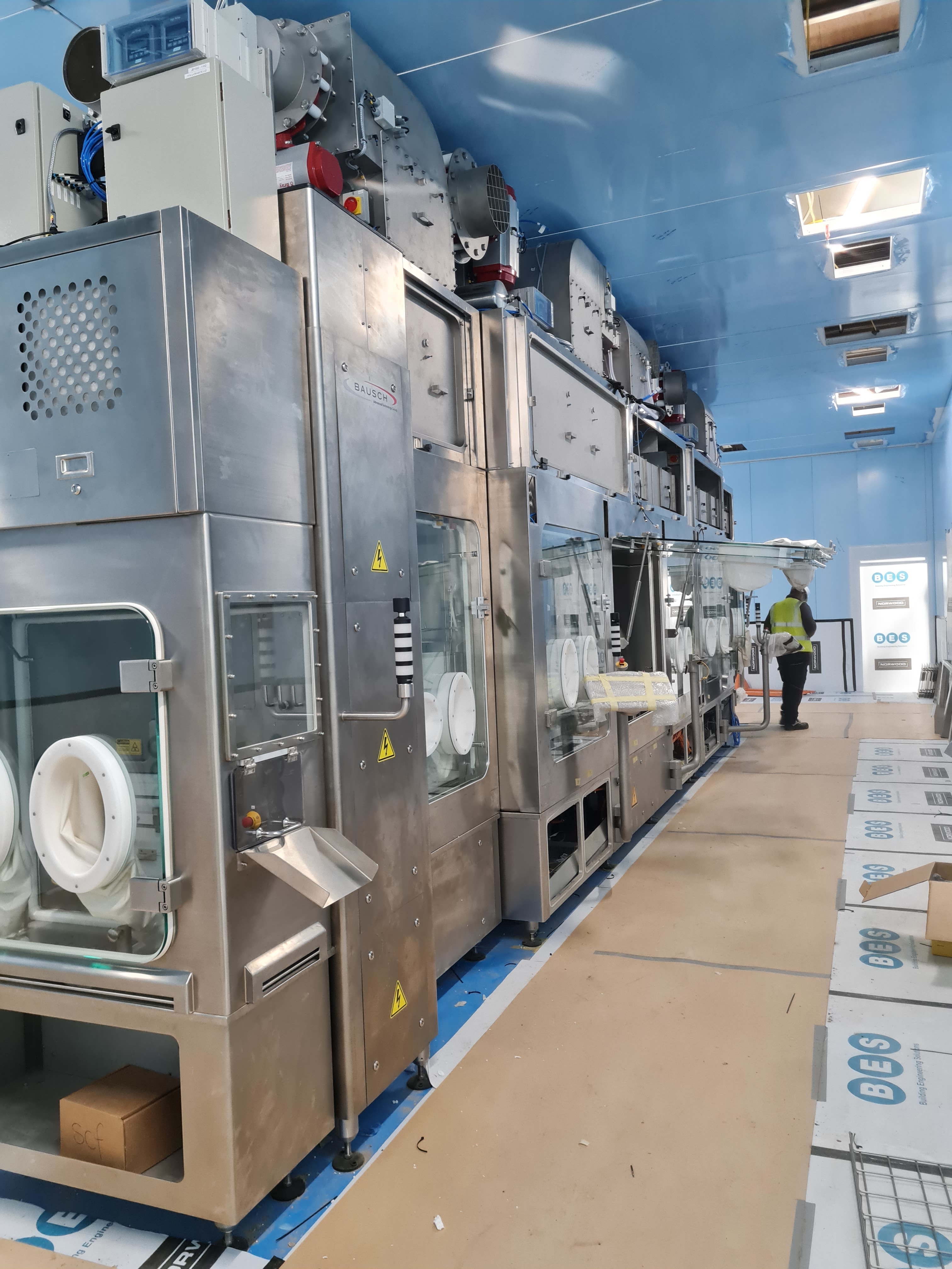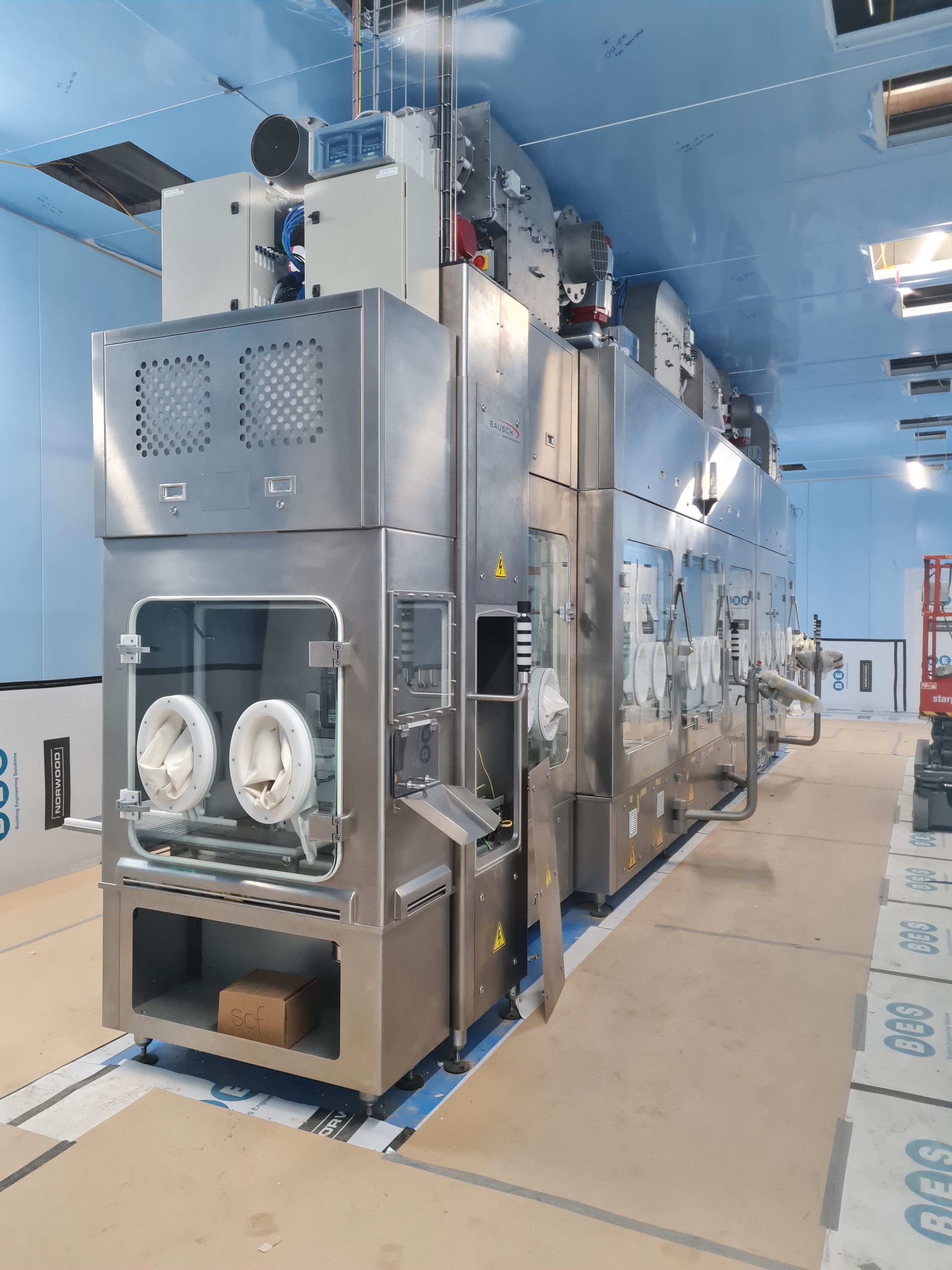 Maszyna napełniająco-zamykająca Bausch typ 534 do korków/korków gumowych, pracuje w warunkach klasy A jako izolator produktów toksycznych, obrotowy stół podawczy, ważenie wstępne i końcowe do Kontroli Procesu (IPC) 100% weryfikacji masy każdej fiolki, wstępne nagazowanie azotem, dozowanie za pomocą 4 pomp perystaltycznych z dokładnością napełniania do +/-1%