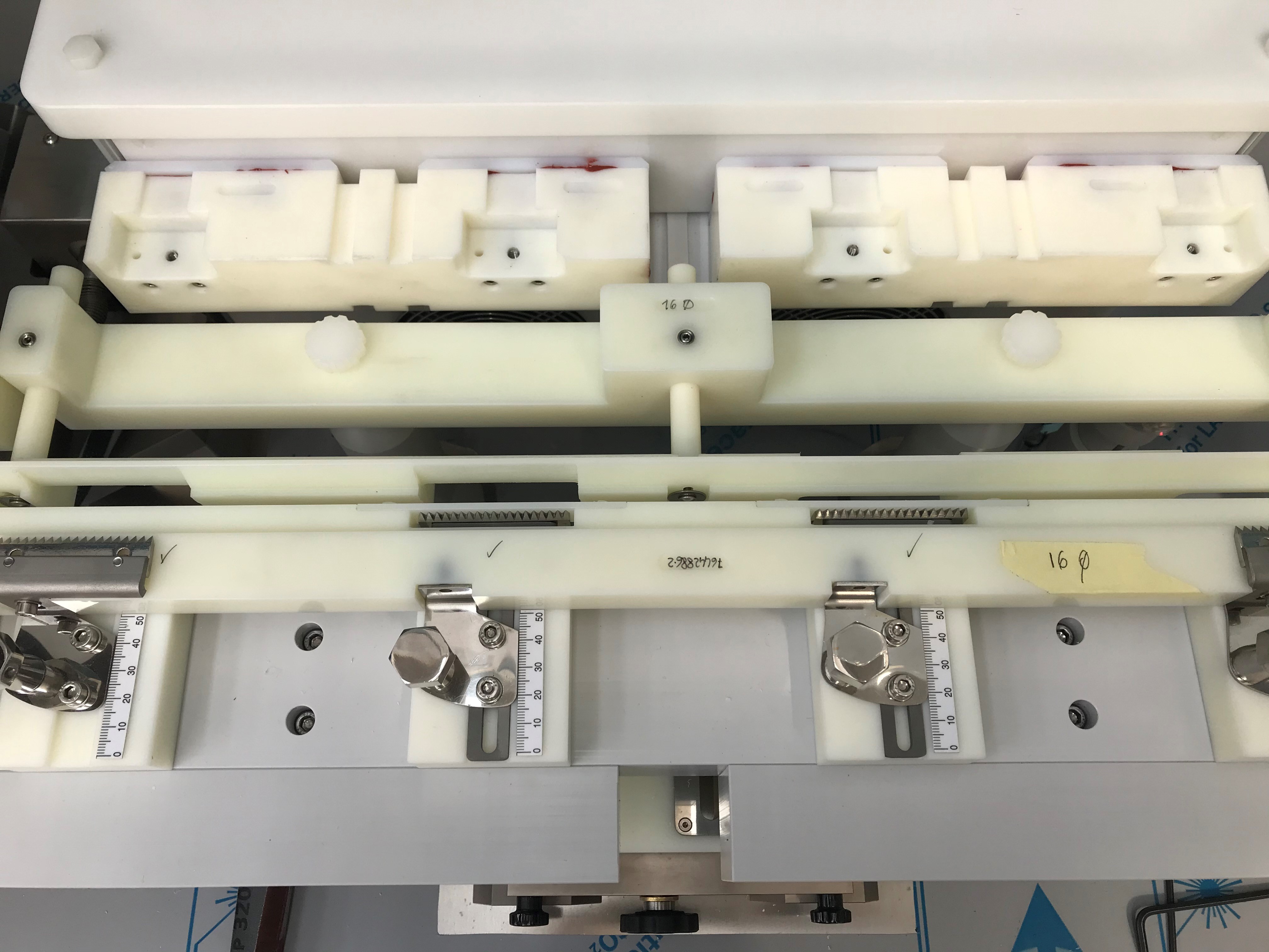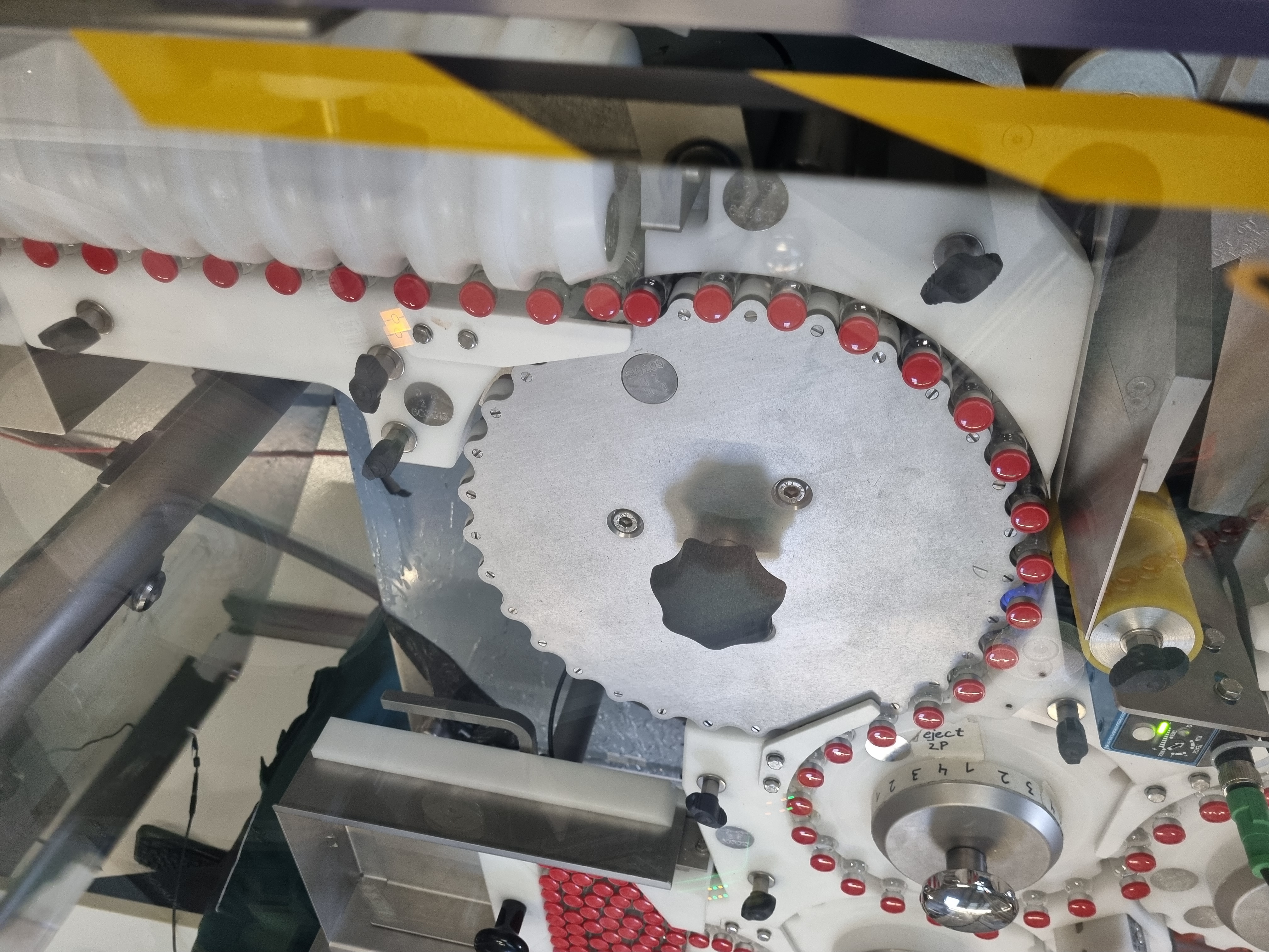 Etykieciarka fiolek Bausch typ 603, wysokość etykiety od 15 do 80 mm, szerokość etykiety od 20 do 120 mm, średnica rdzenia rolki etykiet od 47 do 76 mm, maksymalna średnica zewnętrzna rolki etykiet 400 mm, termotransfer Domino Typ V230i drukarka dla LOT, EXP, MFD itp. z 3 wierszami po maksymalnie 10 znaków w wierszu, 2 kamery Cognex do kontroli druku i weryfikacji kodów kreskowych etykiet, wyładunek fiolek z etykietami na 2 tace wyładowcze lub 1 tacę odrzutową.