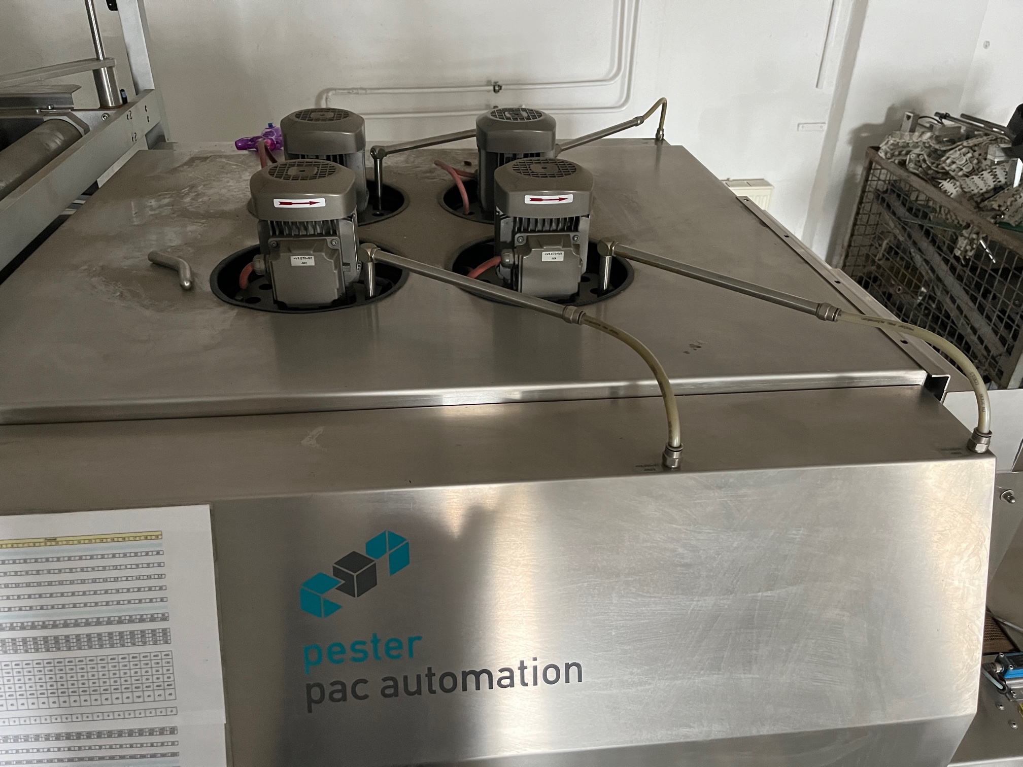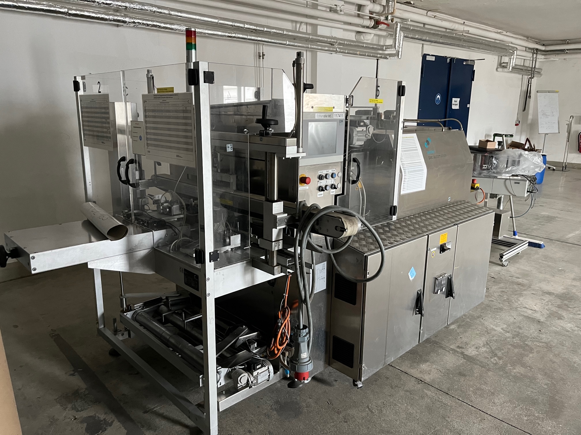 Pester PEWO-pack 800 + PEWO-therm III 800E pakowarka termokurczliwa do butelek/puszek aerozolowych, prostopadła taśma podająca ze stacją grupującą, szerokość zgrzewania max. 800 mm, szerokość podawania produktu max. 850 mm, długość podawania produktu max. 350 mm, wysokość podawania produktu max. 250 mm, wydajność do 25 cykli na minutę, elektryka 400V/50-60Hz, pobór mocy 16,8 kW, ciśnienie robocze 5 bar, masa netto maszyny ok. 700 kg, wcześniej używany do pakowania puszek aerozolowych.